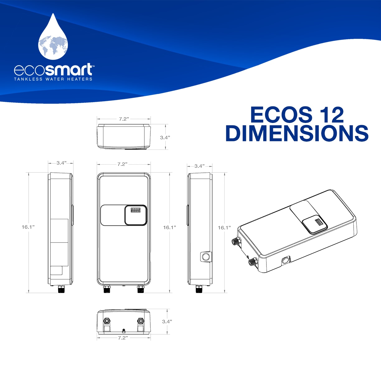 EcoSmart ECOS 12 is a 13-kilowatt tankless electric water heater ideal for providing hot water for a bathroom, small sink, office breakroom and other point-of-use or low-flow applications. It can provide between 1.3 and 3.1 gallons-per-minute depending on the inlet water temperature. To select the best solution for your hot water needs, please refer to the sizing guide. With EcoSmart you will be happier knowing the warm water you expect is available endlessly, consistently, and on-demand, allowing you to reduce your water and energy waste.