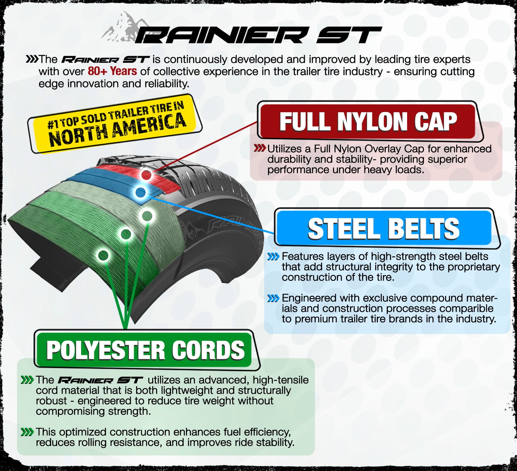 Radial Trailer Tire – Size: 205/75R14 Load Range: C – Tire Weight Rating: 1760 Lbs. Overall Diameter: 26.1″ Wider Center Rib For Improved Wet Traction And Lower Rolling Resistance. Integrated Tread Blades Designed To Enhance Tires Road Grip In All Weather. Solid Main Tread Blocks On Tread To Enhance Self-Cleaning Ability. Proprietary Scuff Guard Design: Features a uniquely engineered sidewall with a built-in scuff guard – designed to protect against curb and road damage where it matters the most – on the outside of the tire Extra Thick Rubber: Incorporates more rubber in the sidewall than standard trailer tires to achieve its bold visual profile and added durability Construction: Utilizes a full nylon overlay cap for enhanced durability and stability – providing superior performance under heavy loads Steel Belts: High strength steel belts add structural integrity to the proprietary tire construction Polyester Cords: An advanced, high-tensile cord material is lightweight and robust to reduce tire weight without compromising strength. This enhances fuel efficiency, reduces rolling resistance and improves ride stability Carries Our Industry Beating 6-Year Manufacturer’s Warranty With Free Roadside Assistance