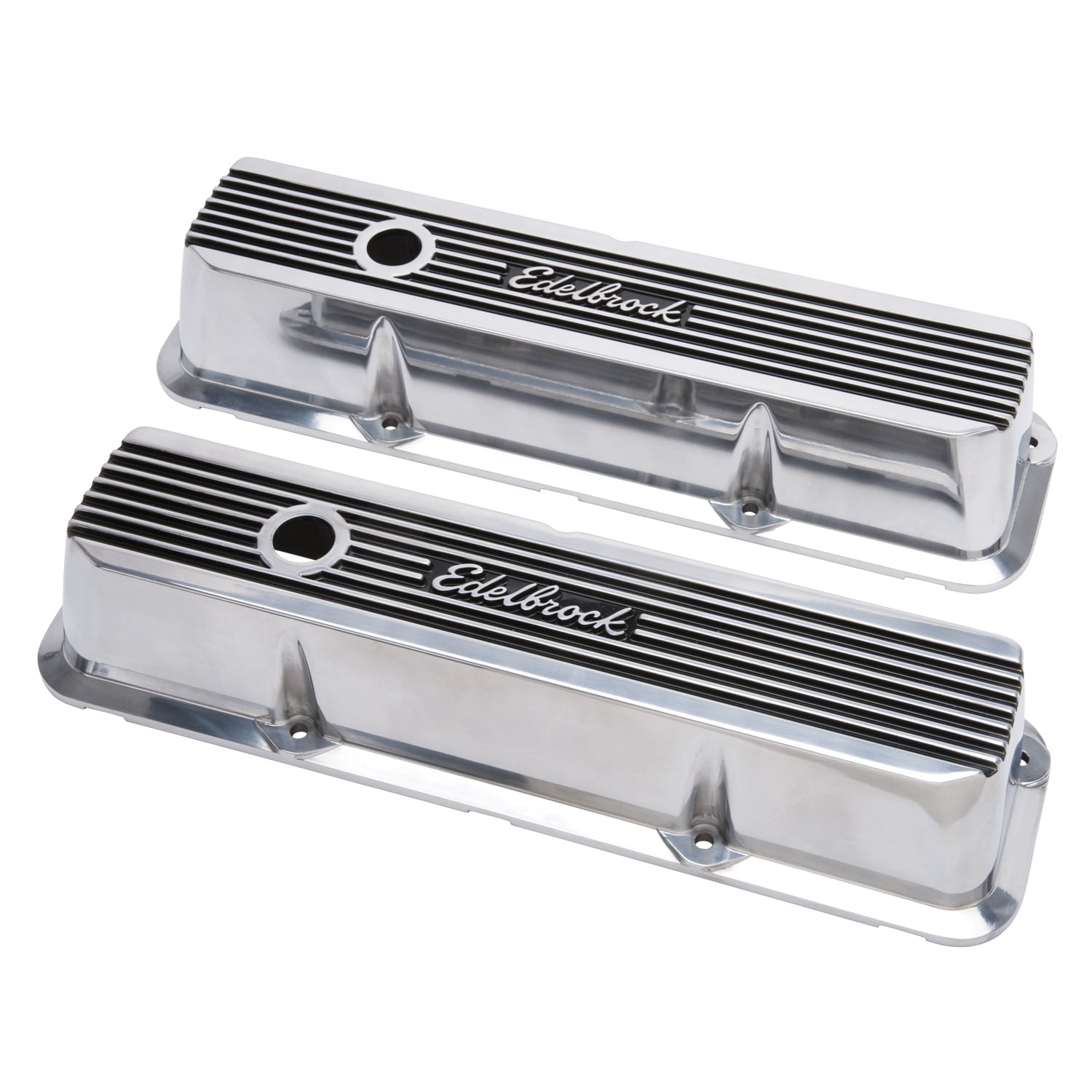 Valve Cover Set – Elite II Series Valve Cover – Elite II Series Valve Cover – Polished – Raised Fins – 3.55 in.. Features: Polished Finish. Raised Fins w/Black Mat Background. Detailed With Allen Hex Heads. 2 Piece Look – 1 Piece Construction. Clears Most Roller Rockers. Clears Valvetrain Components. Heavy Gauge. When you design and sell the best-engineered performance products in the world, you have to have a rigorous testing program. Why? Without adequate testing, there’s no way to stand behind your product with confidence. That’s why every product we design and sell at Edelbrock is tested and approved by Edelbrock engineers in a real world environment on state-of-the-art equipment. Our three Super Flow computerized engine dynos are capable of measuring 11 separate engine variables up to speeds of 12,000 rpm. For 2007, we added a new Super Flow SF902 engine dyno. It’s fully automated and programmable to simulate various driving situations, and is equipped with WinDyn software for the very latest in testing equipment. For real-world tuning, there’s our Super Flow model SF-840 eddy-current chassis dyno that can handle up to 1,000 hp at the wheels and speeds of 200 mph. When all testing is completed, the results evaluated, and the part has passed all performance criteria, then, and only then, is the product deemed ready for production. These precise testing procedures are applied to the entire Edelbrock line for performance that’s guaranteed. Edelbrock test vehicles are driven by Edelbrock engineers and employees to get a “real world” feeling for the performance improvements. Our products are also tested and used by professional race car teams and drivers. Working with these talented individuals is just another extension of our research and development process so when we say “proven performance” we really mean it! Top racing teams in all forms of motorsports rely on Edelbrock to produce parts that they can count on to win races and championships. Further underscoring our commitment to the racing community, Edelbrock is the only aftermarket intake manifold manufacturer licensed by NASCAR. Additional Features Finish:Polished, Gloss Black