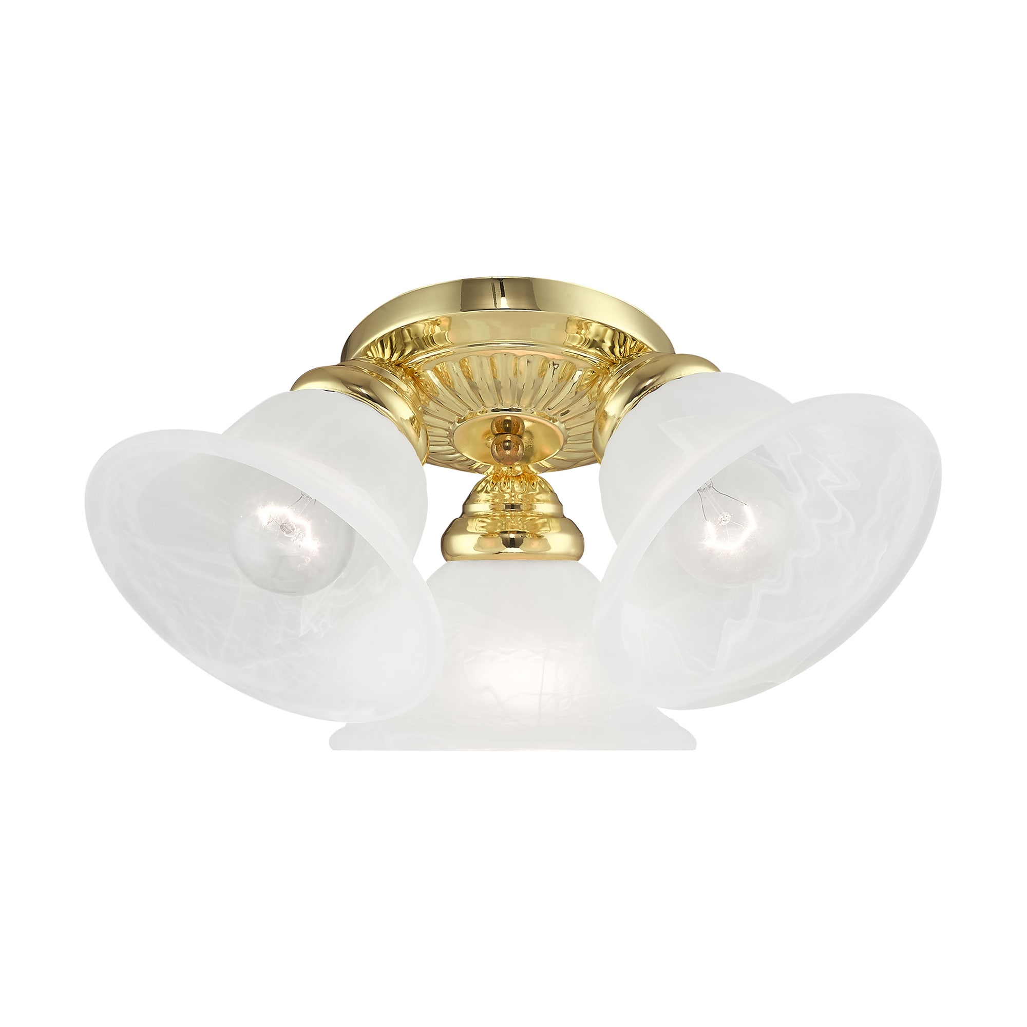 This three light flush mount from the Edgemont collection is a fine and handsome fixture that features white alabaster glass. Edgemont is comprised of traditional iron forms in a polished brass finish.