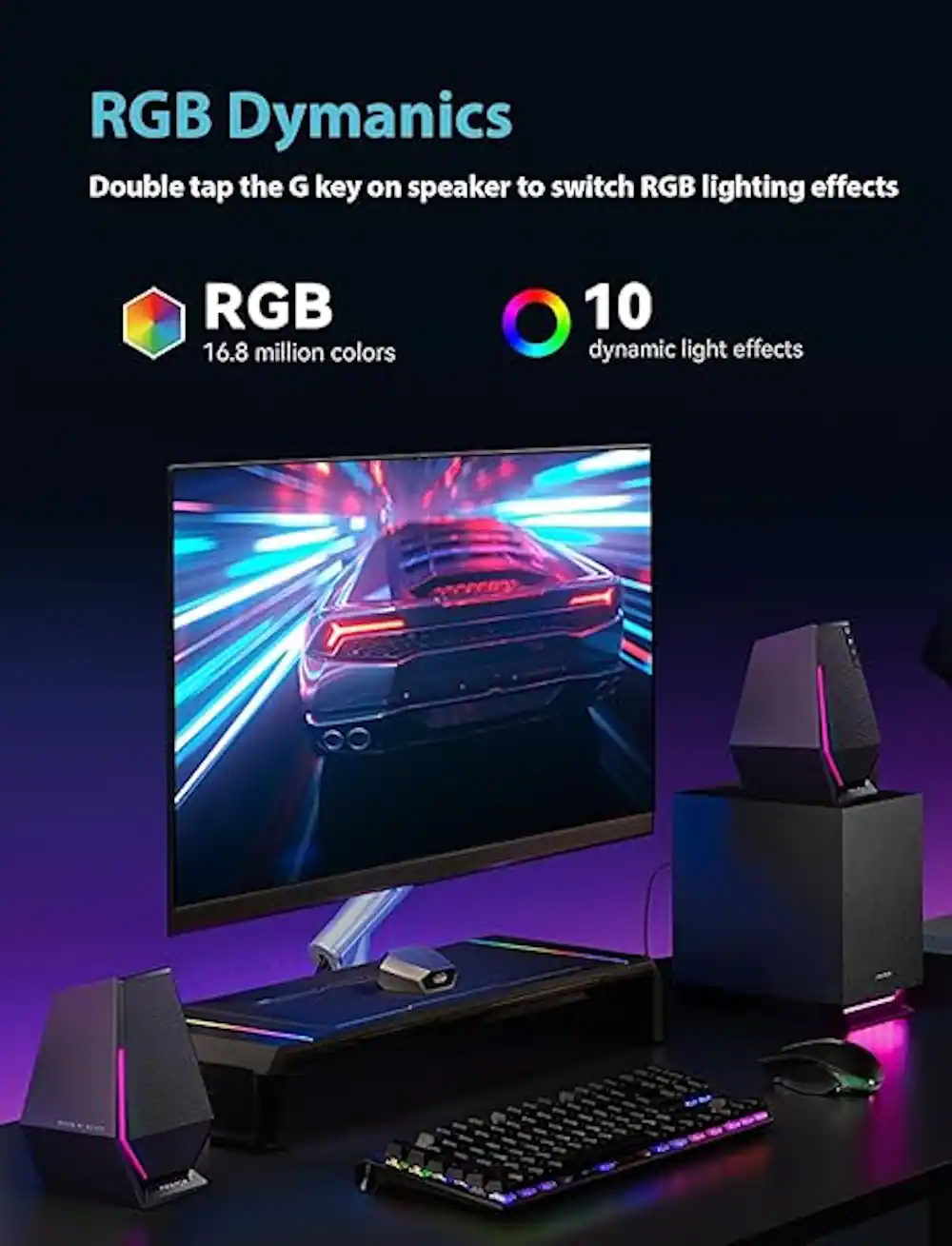 This gaming speaker system boasts 10 dynamic light effects and 16.8 million light colors synchronizing with the sound, creating an immersive experience where light and shadow dance to the rhythm. Easily customize your desktop ambiance with a single click, adding depth to your gaming setup and enriching your auditory journey.