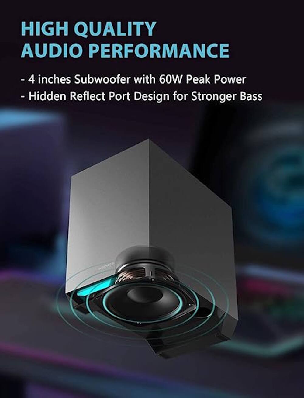 High-Quality 2.1 audio sound system. The G1500 MAX 2.1 speaker system, boasting a peak power of 60W, ensures immersive audio experiences. With dual 2.5-inch full-range speaker drivers in each satellite, it produces clear highs and rich mid-tones. Complemented by a 4-inch subwoofer, the system delivers deep, impactful bass, enhancing the quality of music, movies, or games.