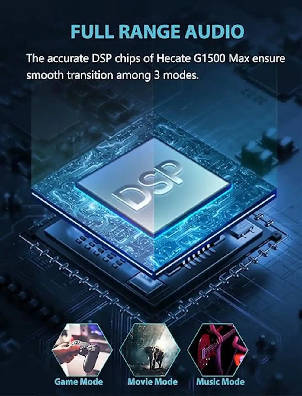 The G1500 MAX gaming speaker system has different sound modes tailored to various entertainment experiences. With dedicated Music mode for immersive music listening, Game mode for heightened gaming excitement, and Movie mode for cinematic audio immersion, it ensures an optimized audio experience across different media platforms.