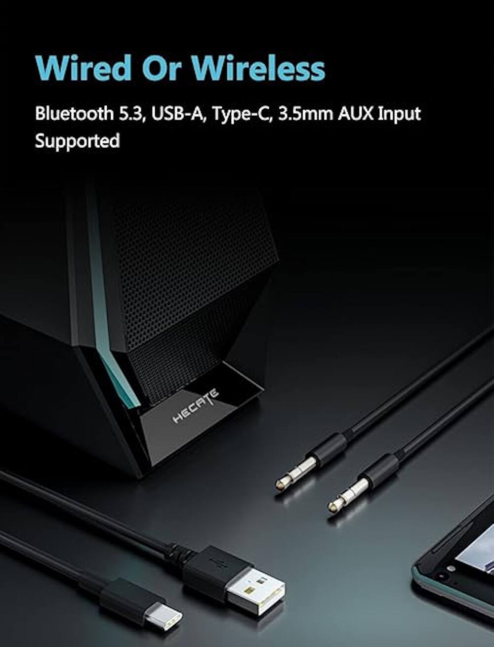 G1500 MAX boasts a reliable wireless connection through Bluetooth 5.3. This speaker system also accommodates a USB sound card and AUX input, ensuring compatibility with various devices. Transition effortlessly between interfaces using the USB-C to USB-A cable.