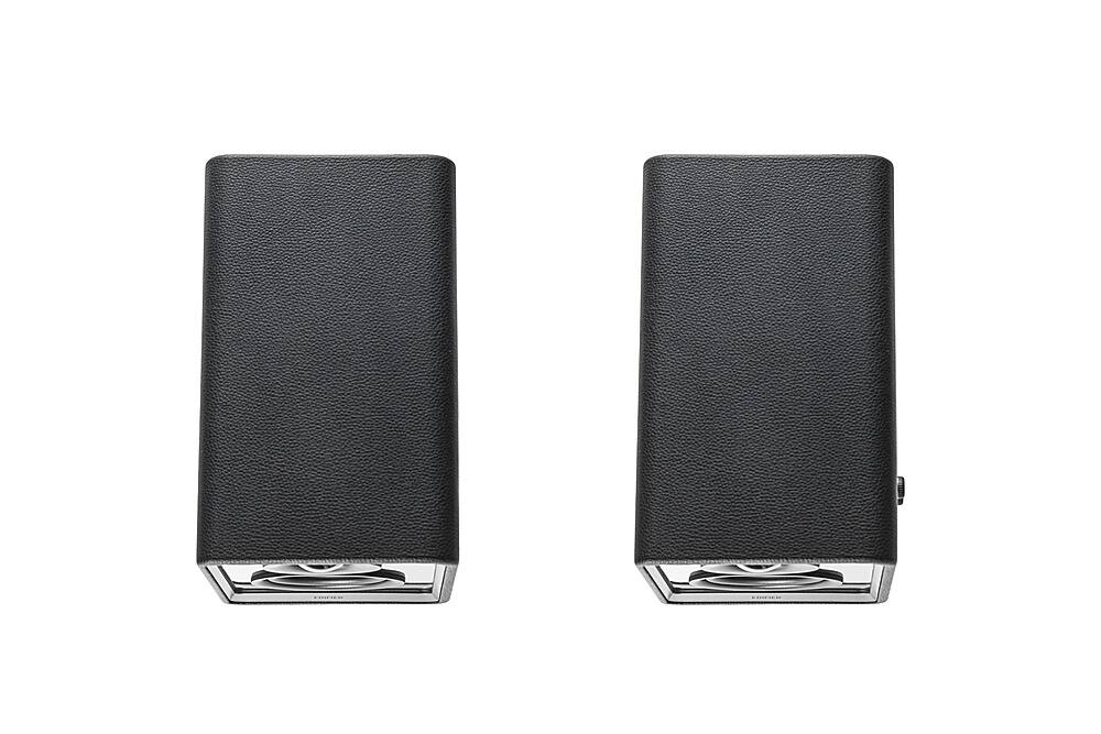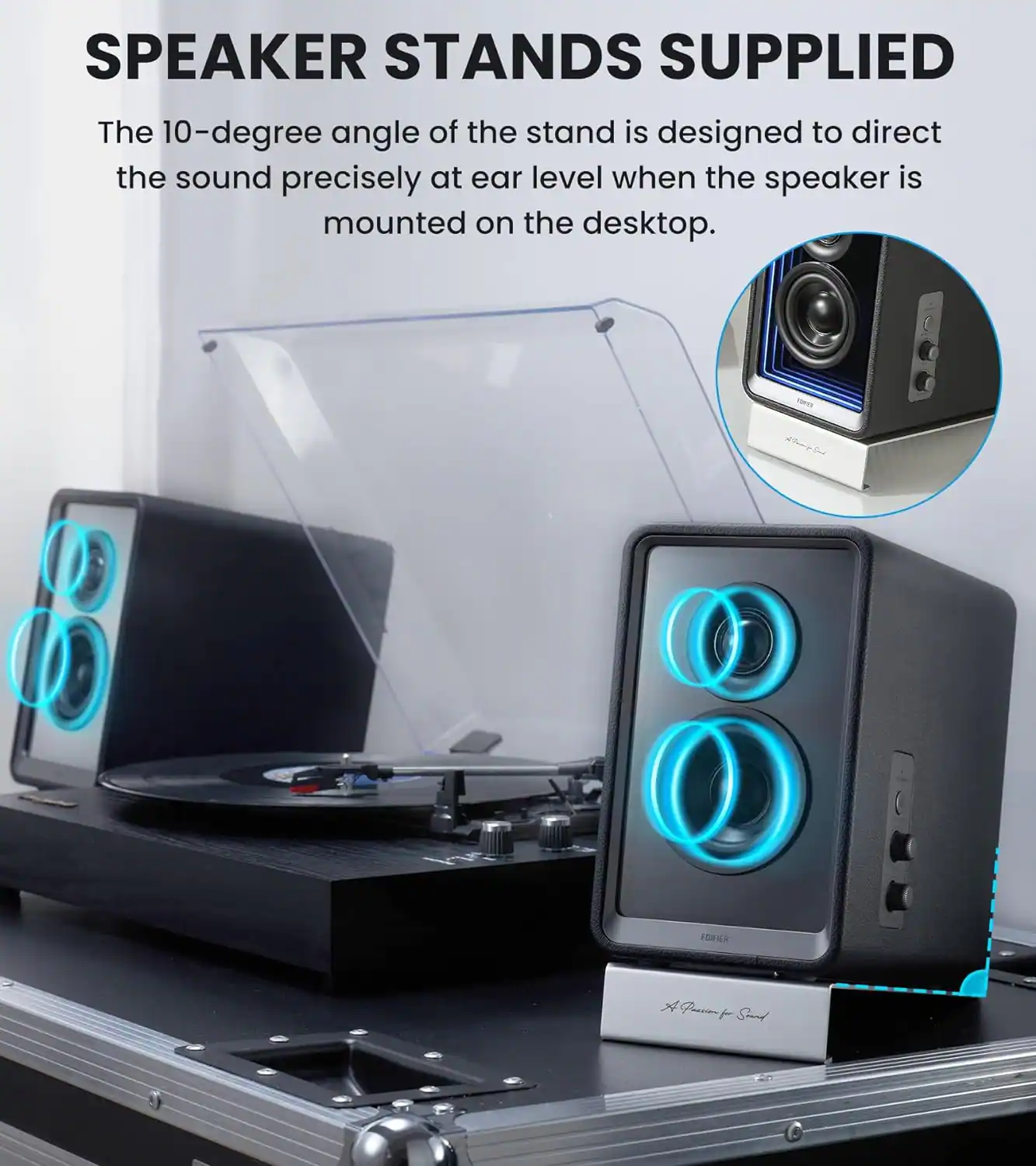 The included aluminum speaker stands are designed to reduce sound coloration effects caused by sound reflection against the desktop surface. Their 10-degree angle ensures precise sound direction at ear level when the speaker is placed on a desktop.