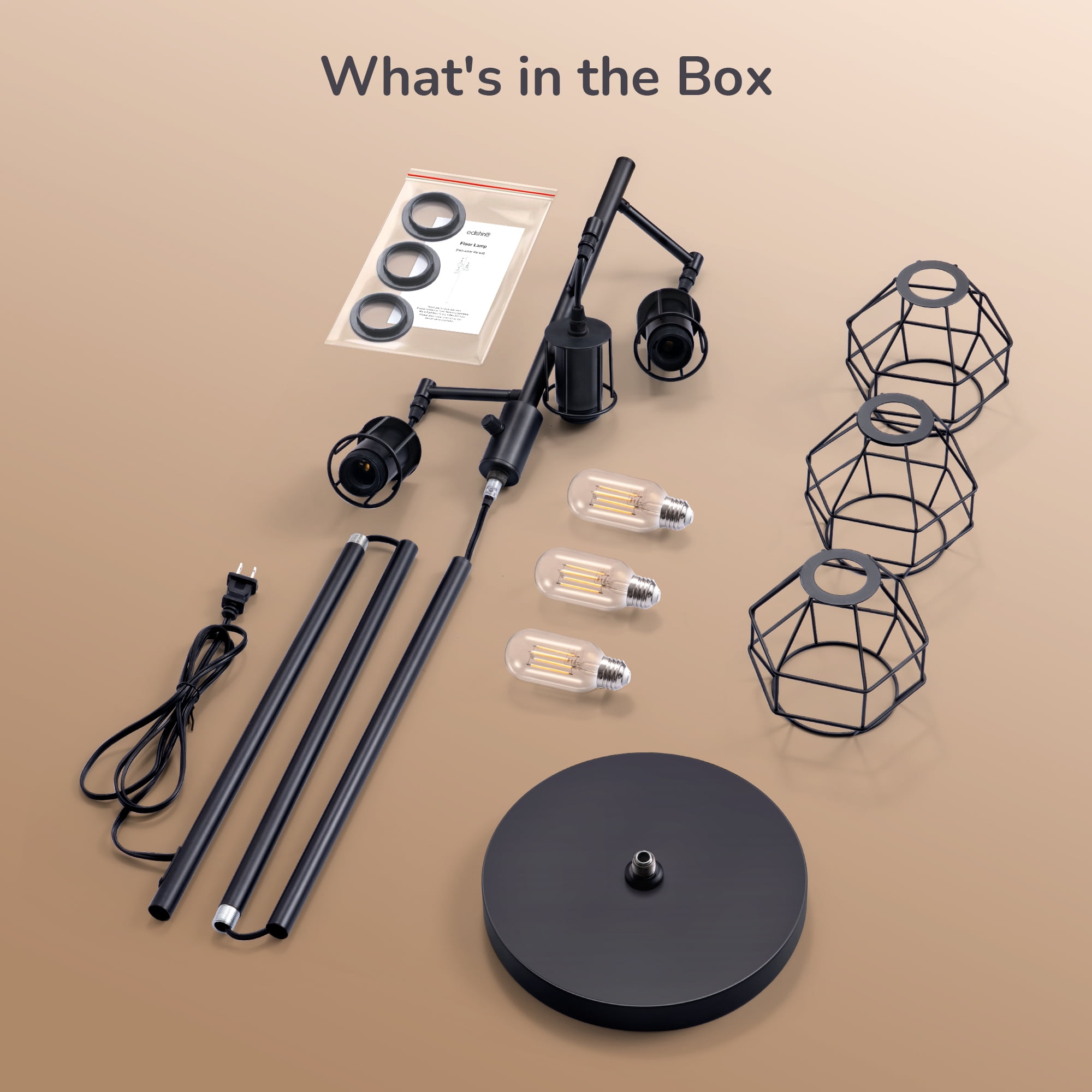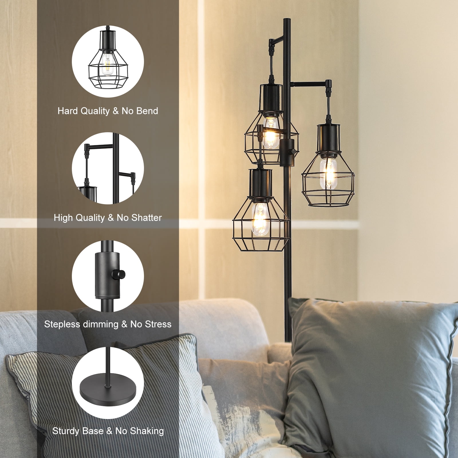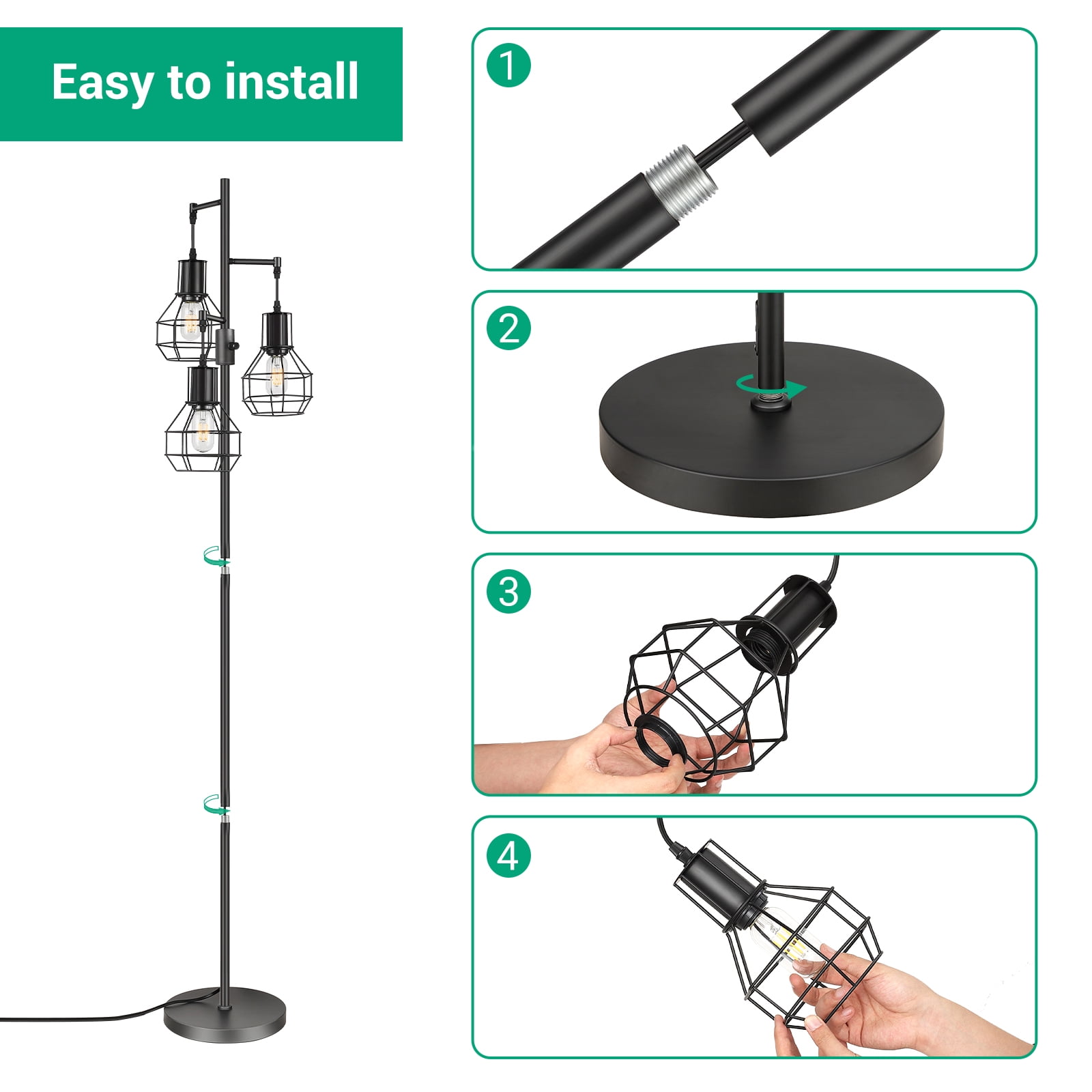 Dimmable Rotary Switch– We put the dimmable rotary switch on the pole, so it’s easy to adjust the light to just the brightness (0%-100%) as you want. LED Bulbs Included– Come with 3 E26 base bulbs, 4W( 40W equivalent ), 450LM, 3000K. Elegant & Farmhouse Design– Black finish, metal material, 3 elegant cages adds fashion and modern appearance to your home. Easy to install– All mounting accessories are included for quick installation and use. Stable Base– Heavy weighted base ensures its stability, preventing it being knocked over by kids or pets. Product Height: 65 IN Cord Length: 65 IN Materials: Metal Input Voltage: 120VAC 60Hz Socket Type: Standard Medium E26 Bulb: 4W 3000K T45- 3 Pack
