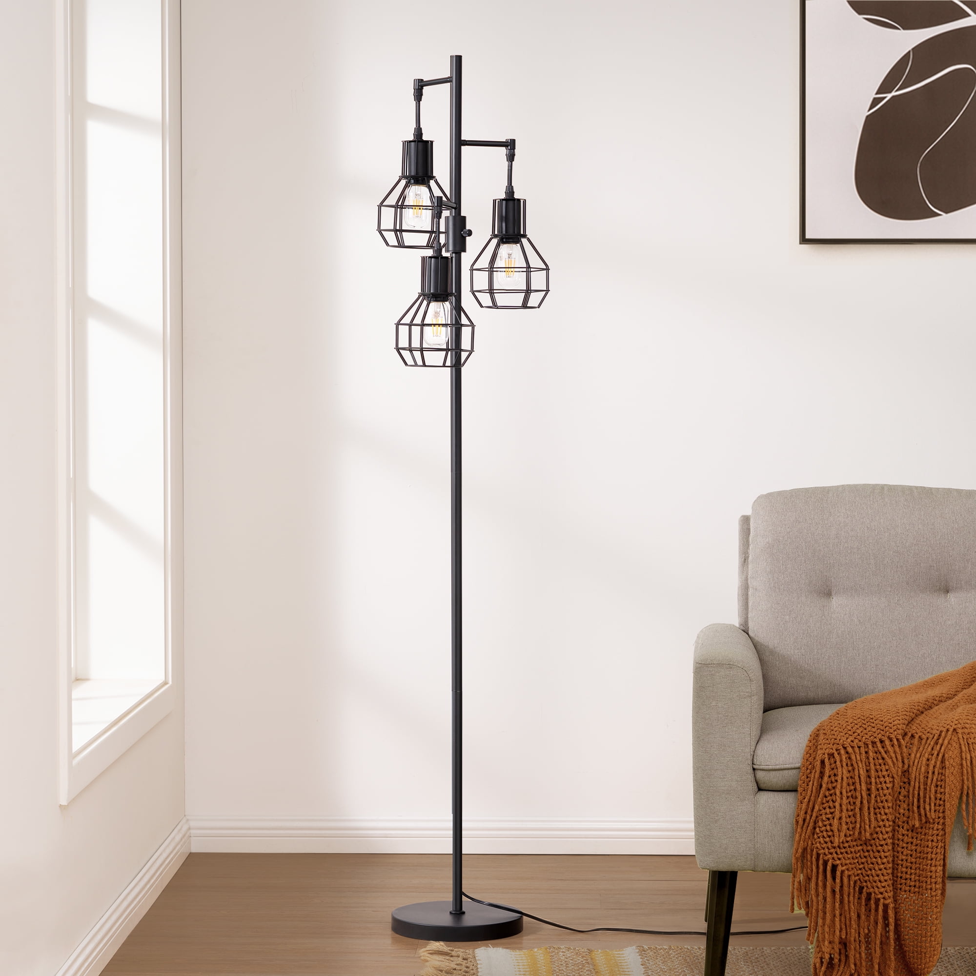 EDISHINE farmhouse rustic floor lamp lights up your space with a sleek, industrial aesthetic. It’s crafted from iron with a simple circular base and neck in a smooth black finish. Three lights adorn the top with a playful, tree-like ascension, and the wire cage lantern shades create a modern, exposed-bulb look. We love that this floor lamp has a dimmable rotary switch on the pole, so it’s easy to adjust the light to just the brightness as you want. Constructed of high quality metal, sturdy and rust resistant for years of use.