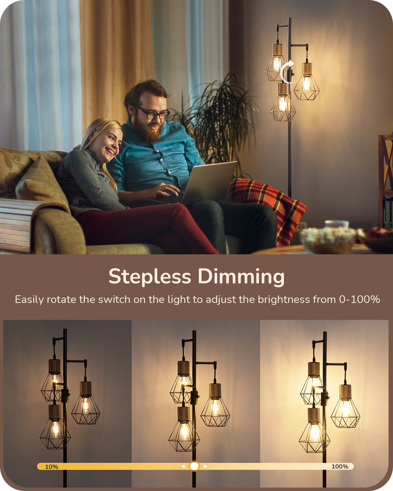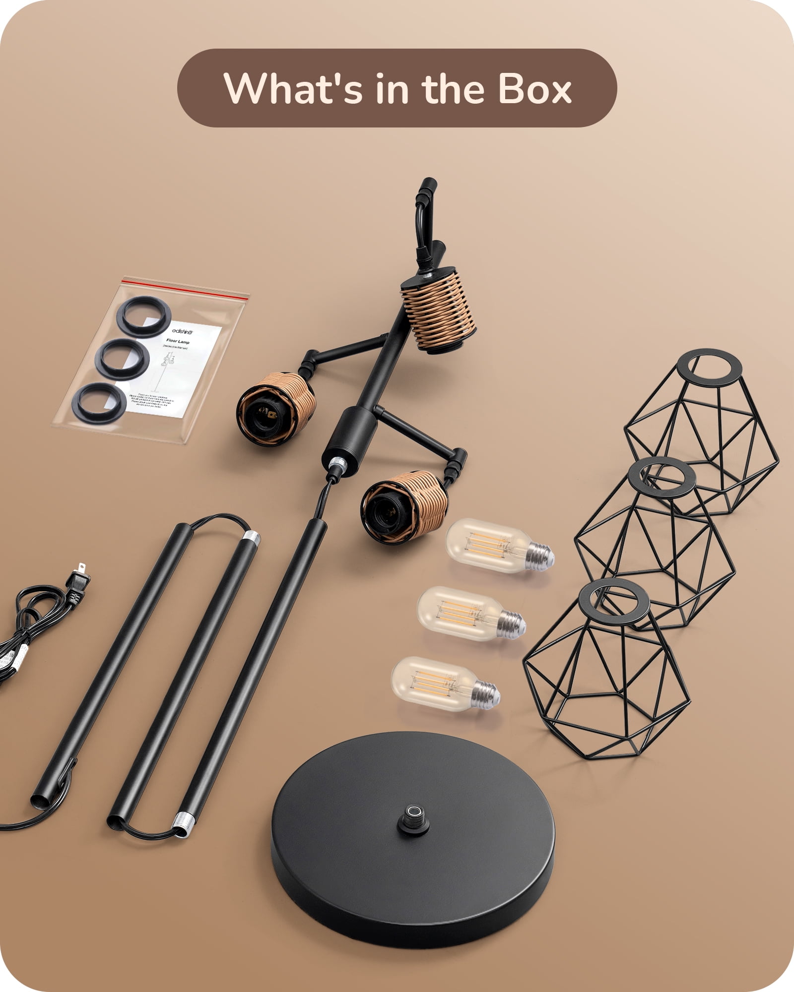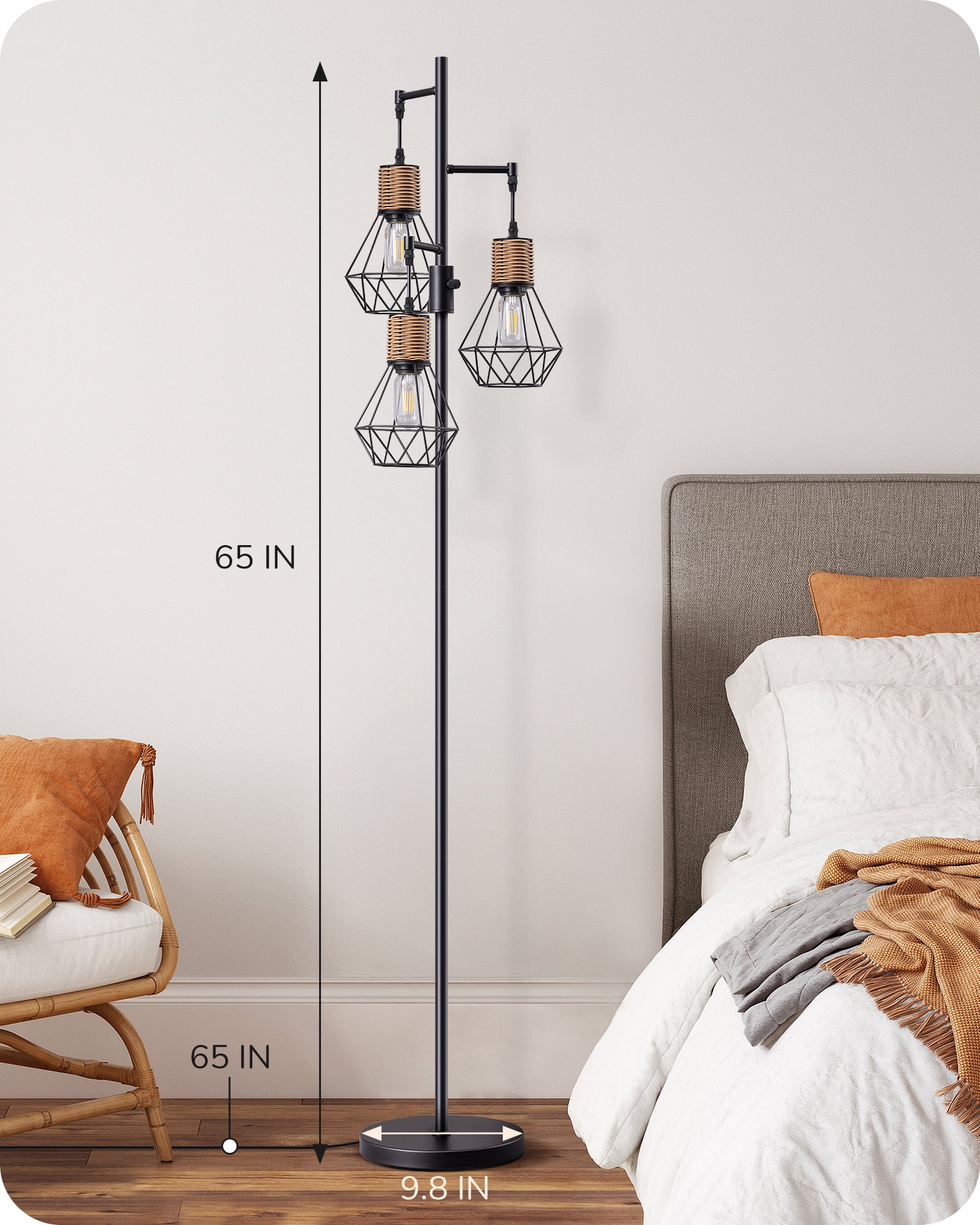 [Elegant Farmhouse Style] Featuring a sleek black metal structure and diamond-shaped lanterns with faux rattan design, this tall tree floor lamp adds natural beauty and suits various decorative styles such as farmhouse, minimalism, and medieval retro; creating a warm artistic atmosphere, radiating a unique charm throughout your home [Stepless Dimming 0-100%] With a simple rotary switch on the industrial floor lamp, effortlessly adjust brightness from 0% to 100% to suit different environments and moods; ideal for various areas like dining rooms, living rooms, bedrooms, and offices, kitchens, and hallways; also perfect for cafes, basements, bars, clubs, libraries and reading rooms [Sturdy & Safe] Crafted with precision, our farmhouse floor lamp prioritizes safety; its durable design provides reliable protection for you and your family, specially weighted, high-quality metal base ensures stability, eliminating concerns of tipping over even in active environments with children or pets; enjoy beautiful and safe home lighting [Energy-efficient LED Lighting] Our living room floor lamps feature standard E26 sockets compatible with various LED, CFL, incandescent, and halogen bulbs (Dimmable Bulb Only); 3 E26 base bulbs 4W (equivalent to 40W), providing 450 lumens of warm white light at 2700K; enjoy bright and energy-efficient lighting without any flicker or buzzing [Expert Warranty & Support] Easy to install this standing lamp by yourself in minutes, with a 1-year warranty; for any issues, contact us anytime – Our EDISHINE professional customer service offers 24/7 troubleshooting. Specifications Product Height: 65 IN Cord Length: 65 IN Materials: Metal Input Voltage: 120VAC 60Hz Socket Type: Standard Medium E26 Bulb: 4W 2700K T45- 3 Pack
