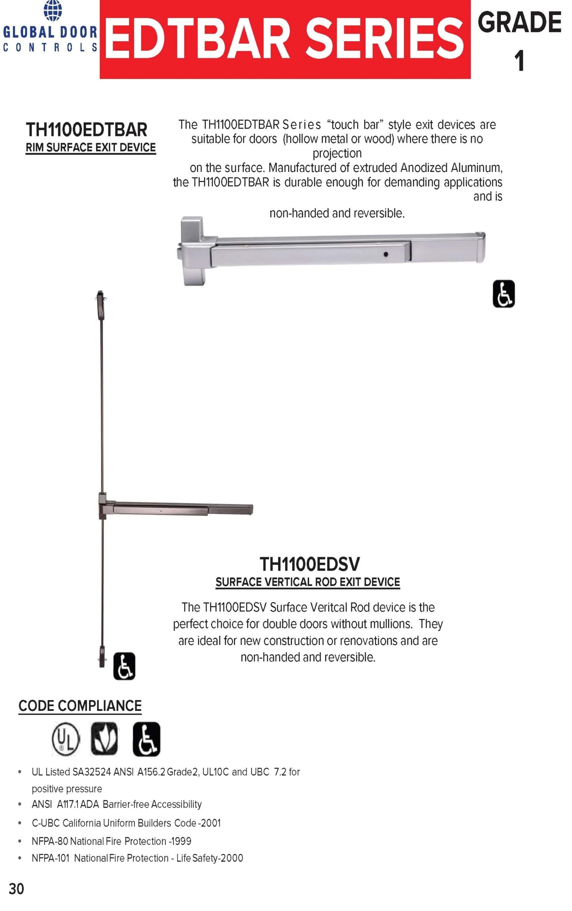 The Global Door Controls EDTBAR series “Touch Bar” style exit device is suitable for hollow metal or wood doors where there is no projection on the surface. Its’ appropriate for commercial and industrial applications where heavy duty usage is anticipated. Moreover, it fist with doors up to 36 in. wide. It comes with a roller latch, strike plate, and mounting hardware. However, the exterior lever trim is sold separately. These series meet the performance standards of Grade 1 and ADA compliant exit devices. Item is available in Aluminum, Duronodic and Stainless Steel finishes.