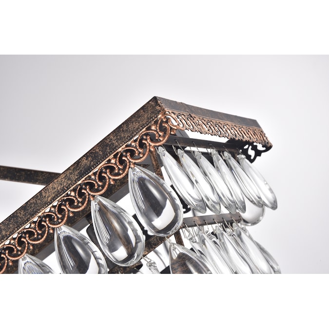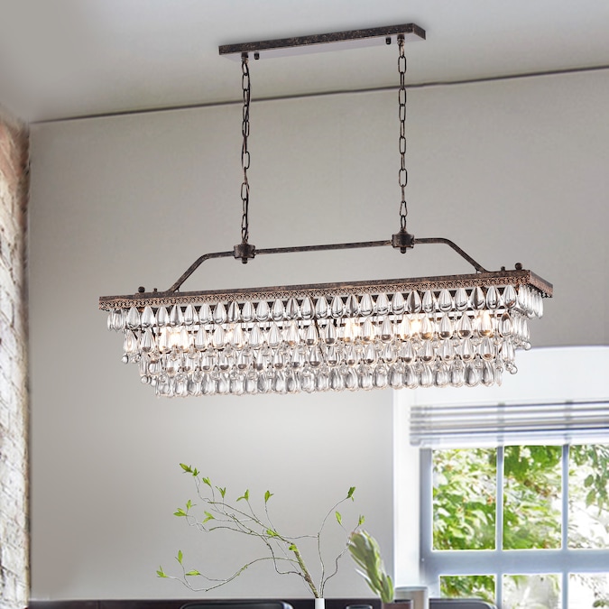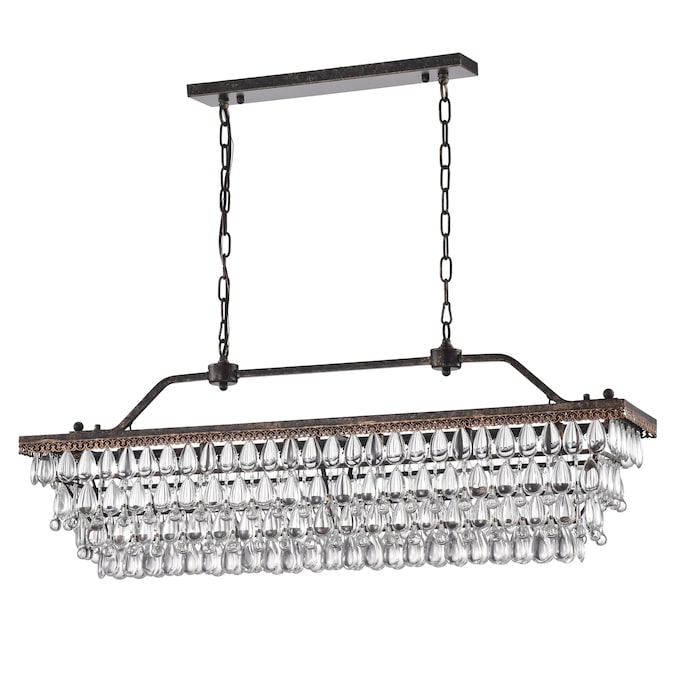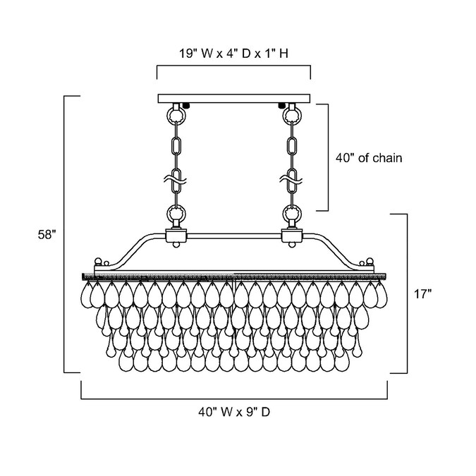 This opulent rectangular shaped chandelier is an even larger version of our popular EPD301AB and is a perfect fixture for a dining room or over a kitchen island. The brushed bronze hardware gives it an antique feel that is traditional yet contemporary This fixture makes a statement and adds drama with its four rows of cascading teardrop crystals filter the four lights and brighten the room. A 40-inch adjustable chains make it perfect for any room size or situation