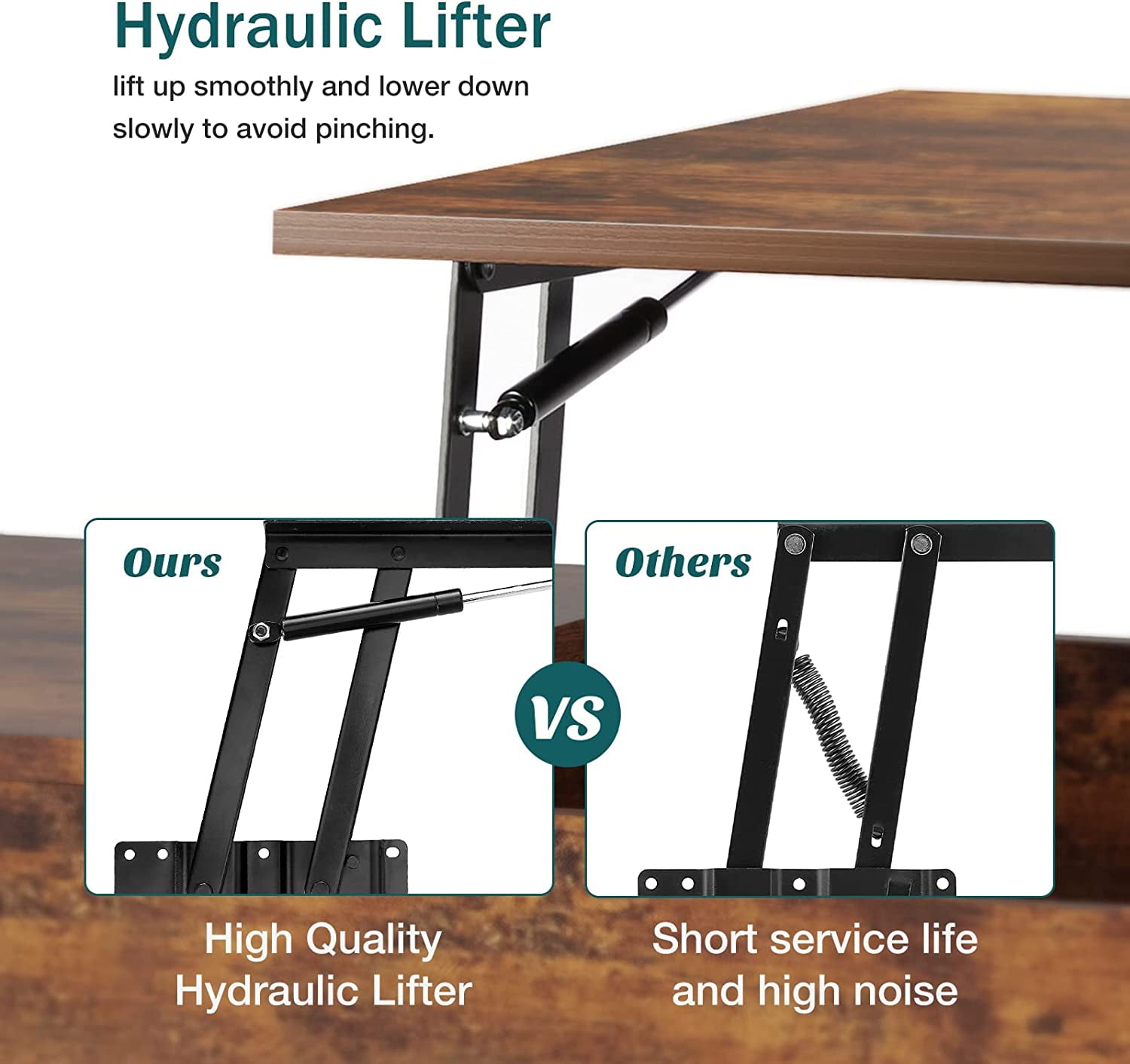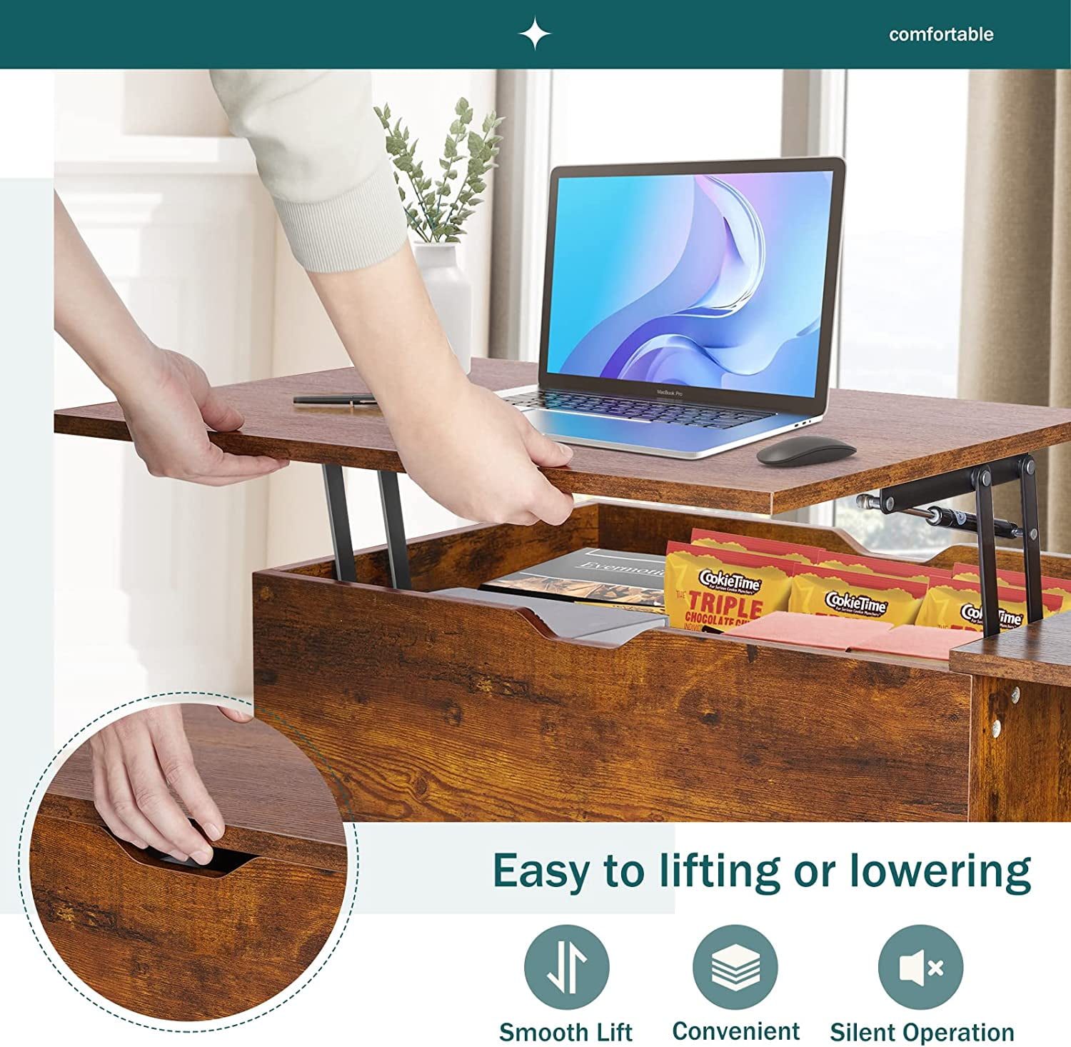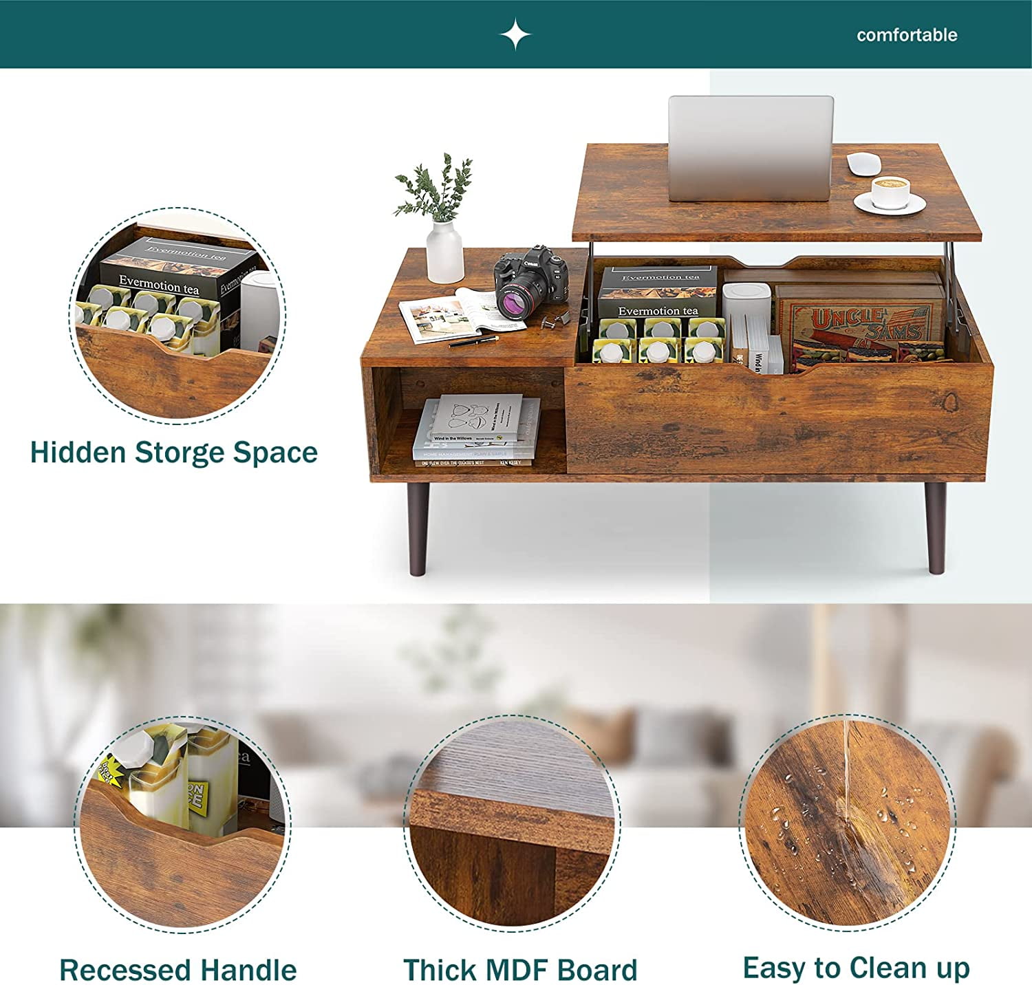 edx Adjustable Height Wooden Coffee Table with Hidden Compartments and Shelves – Perfect for Small Homes, Apartments, Reception Rooms, Rust Brown
