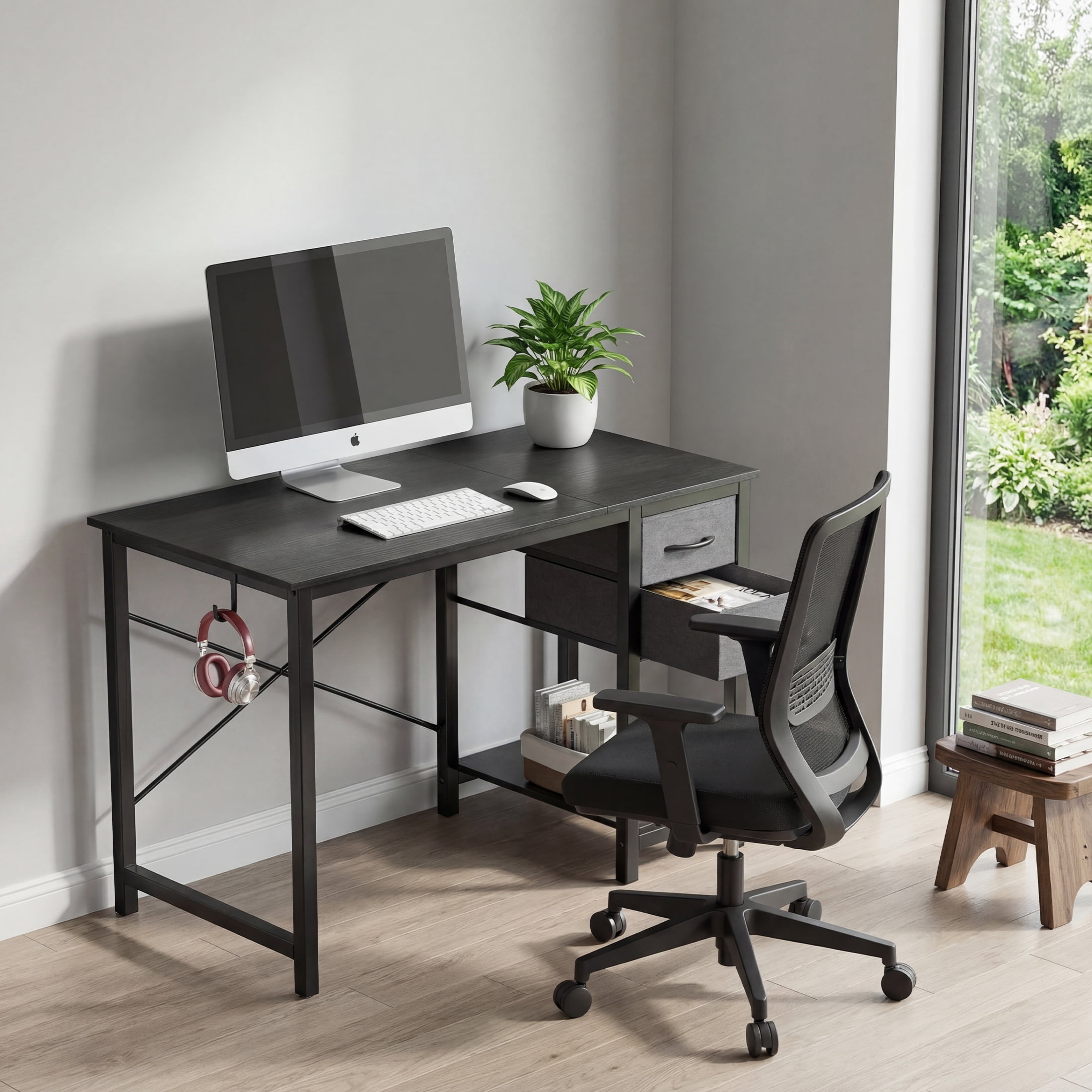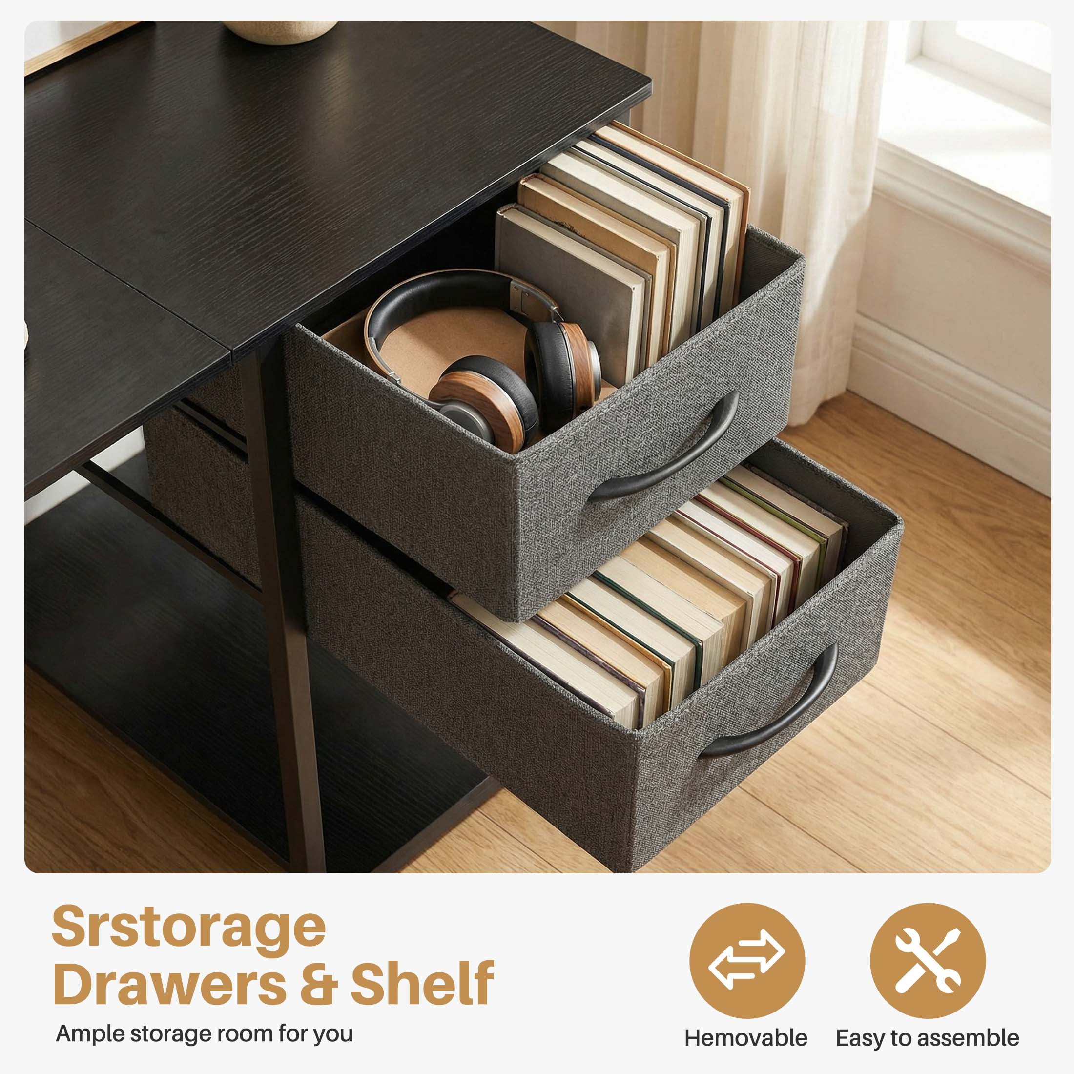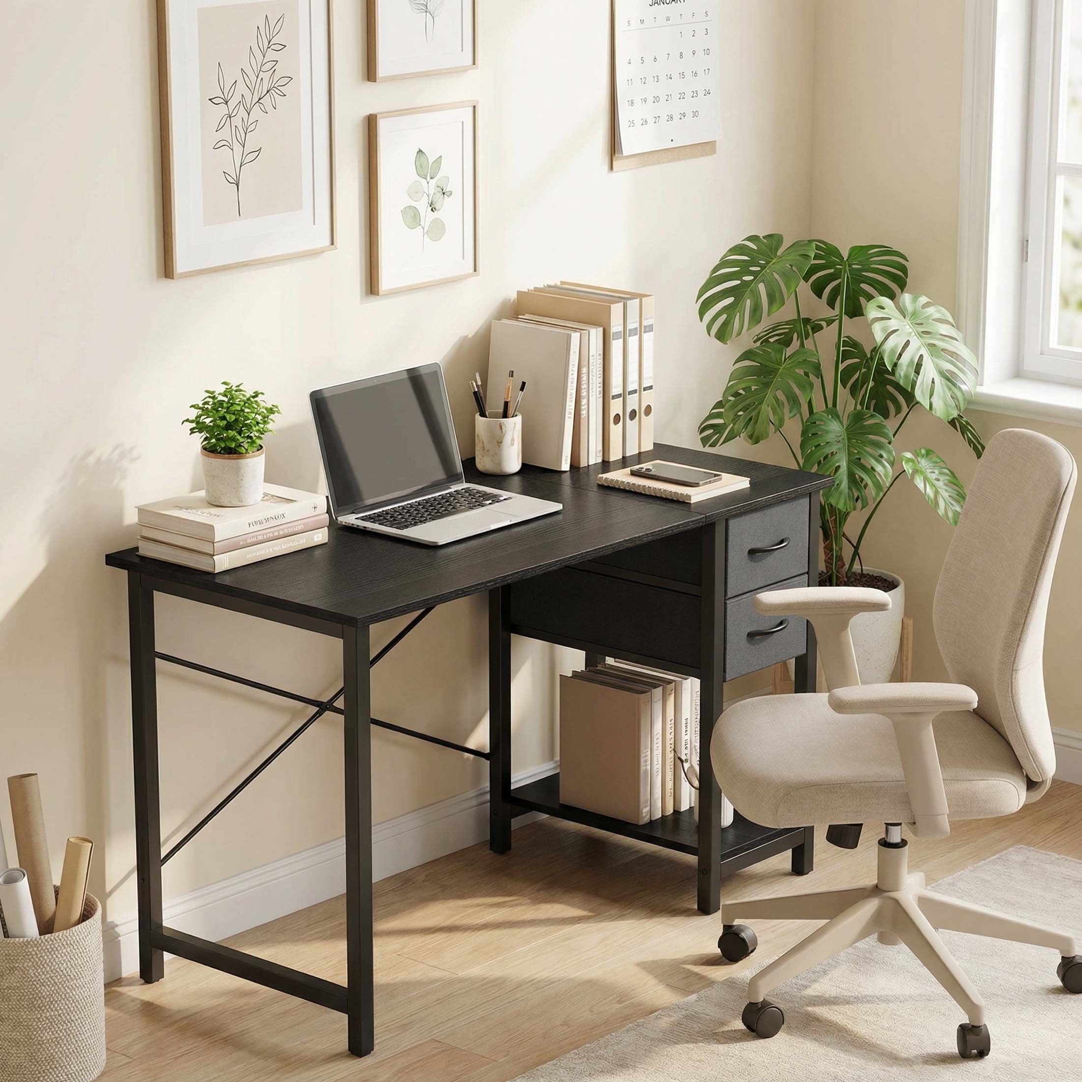 Premium Computer Desk: This office desk with drawers has a large desktop, it is made of high-quality particleboard which is waterproof and easy to clean. This material meets the EPA and CARB safe air standards. Metal frame provides reliable support for all-day use. Weight capacity: 176 lbs 2 Drawers Home Office Desk: Enrich your storage space! These computer desks are designed with 2-tier drawers and a shelf. The decent cloth drawers are removable so you can change them if needed. You can put magazines, files, books and posters in it. The side iron hook can hang headphones or bag stably Modern Style Computer Desk: The tabletop can hold a PC, laptop, coffee cup, mini plant, keyboard, etc. 3 sizes for choice: 40″, 47″, 55″. Smaller size for bedroom, study room, or corner and bigger one for a larger working space Wide Use Writing Desk: 3 classic colors for choice Fast Installation Work Desk: Easy to assemble, the installation will take 20-30 minutes to complete. The package comes with all the hardware and components you need. Please note that read the installation manual at first. No need to hesitate, come and get your wooden desk