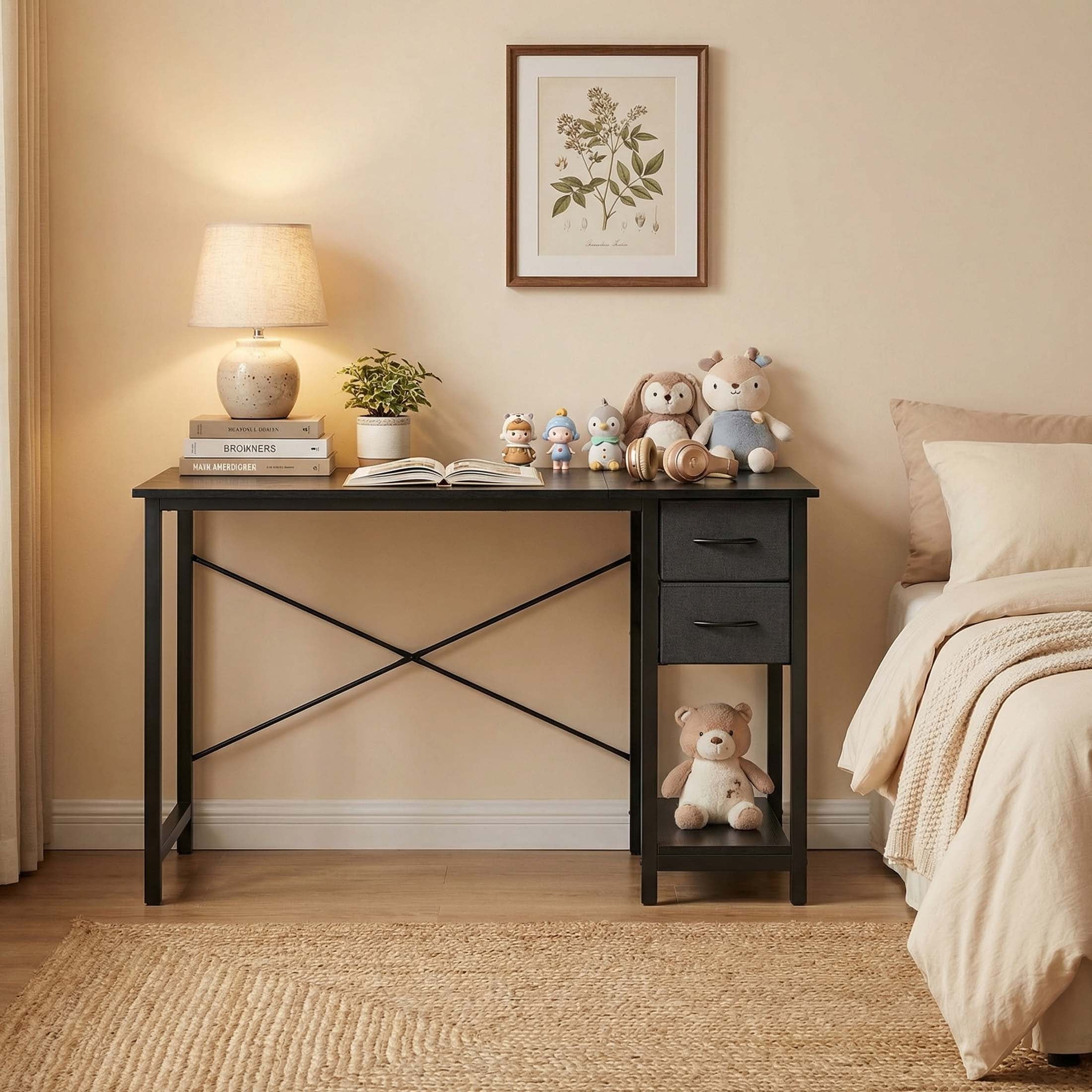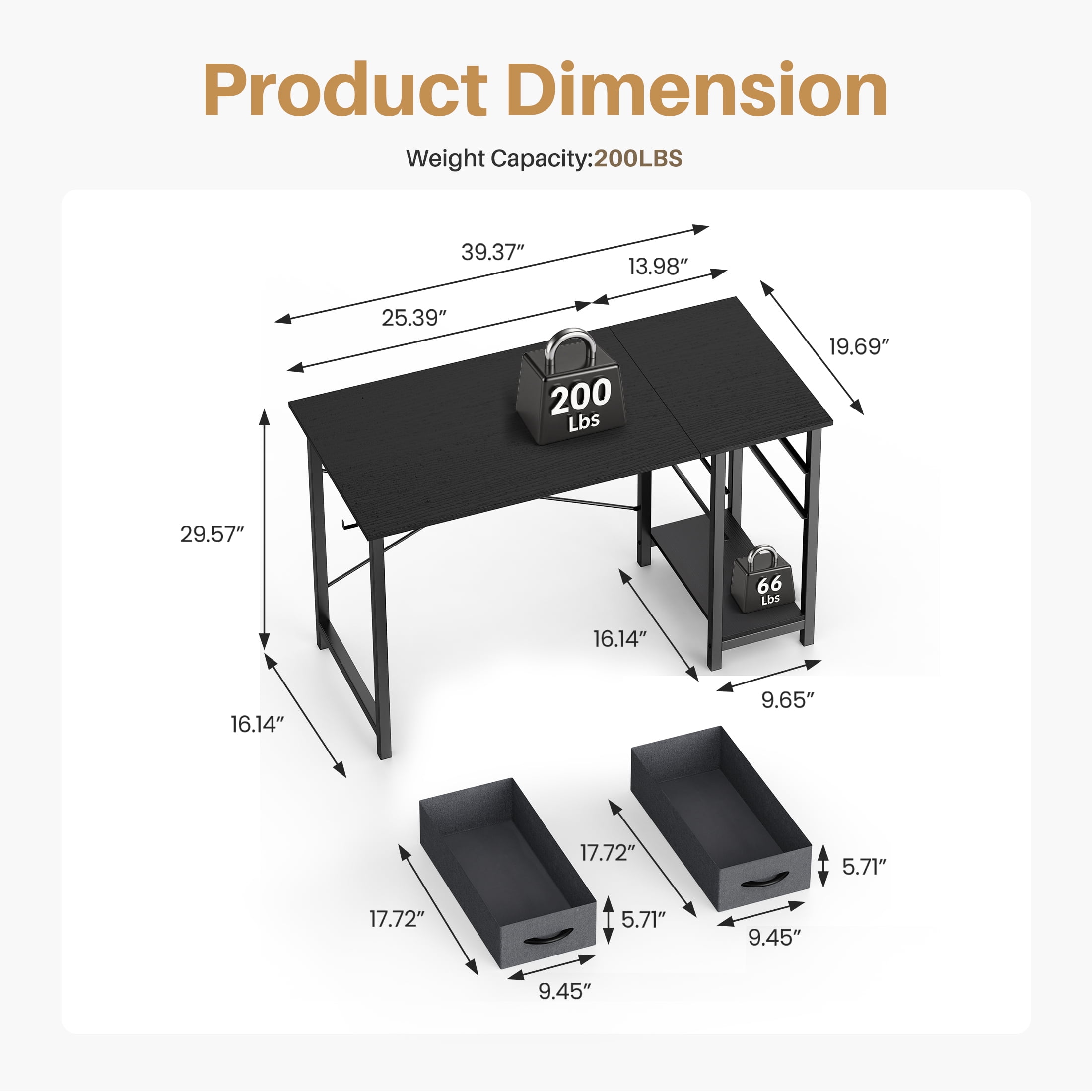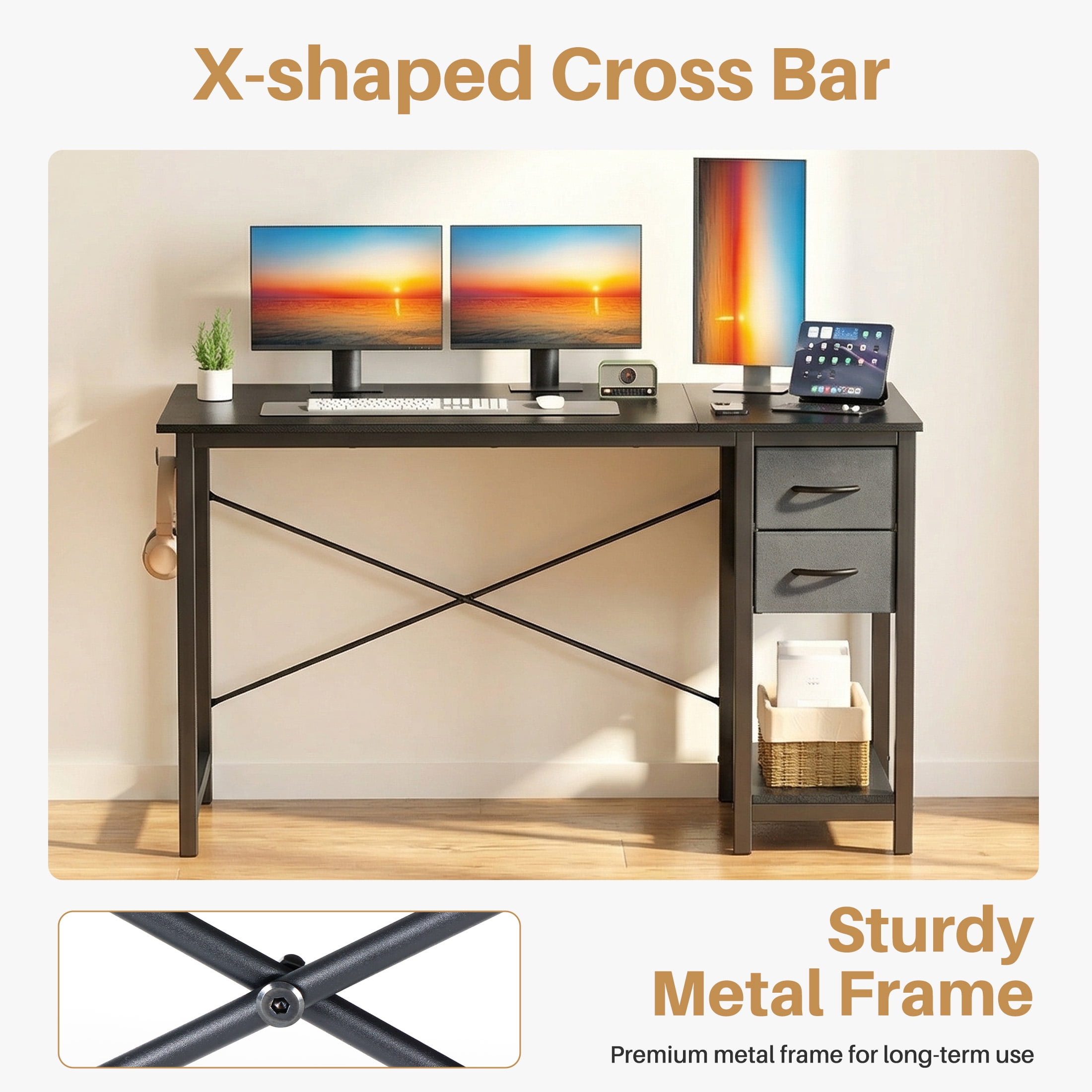 Premium Computer Desk: This office desk with drawers has a large desktop, it is made of high-quality particleboard which is waterproof and easy to clean. This material meets the EPA and CARB safe air standards. Metal frame provides reliable support for all-day use. Weight capacity: 176 lbs 2 Drawers Home Office Desk: Enrich your storage space! These computer desks are designed with 2-tier drawers and a shelf. The decent cloth drawers are removable so you can change them if needed. You can put magazines, files, books and posters in it. The side iron hook can hang headphones or bag stably Modern Style Computer Desk: The tabletop can hold a PC, laptop, coffee cup, mini plant, keyboard, etc. 3 sizes for choice: 40″, 47″, 55″. Smaller size for bedroom, study room, or corner and bigger one for a larger working space Wide Use Writing Desk: 3 classic colors for choice Fast Installation Work Desk: Easy to assemble, the installation will take 20-30 minutes to complete. The package comes with all the hardware and components you need. Please note that read the installation manual at first. No need to hesitate, come and get your wooden desk
