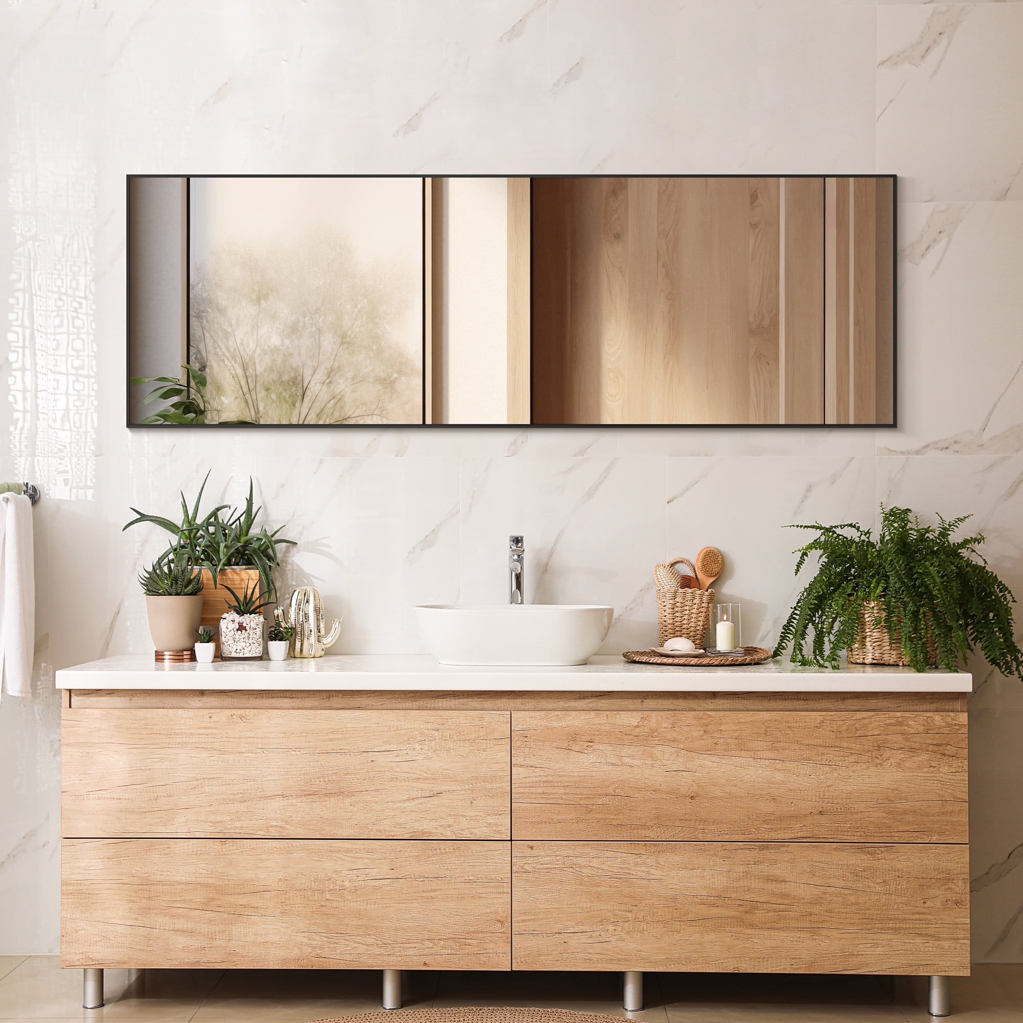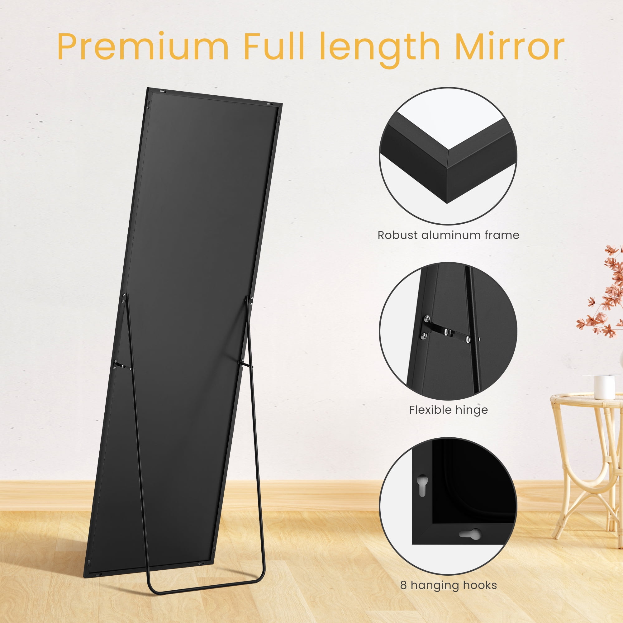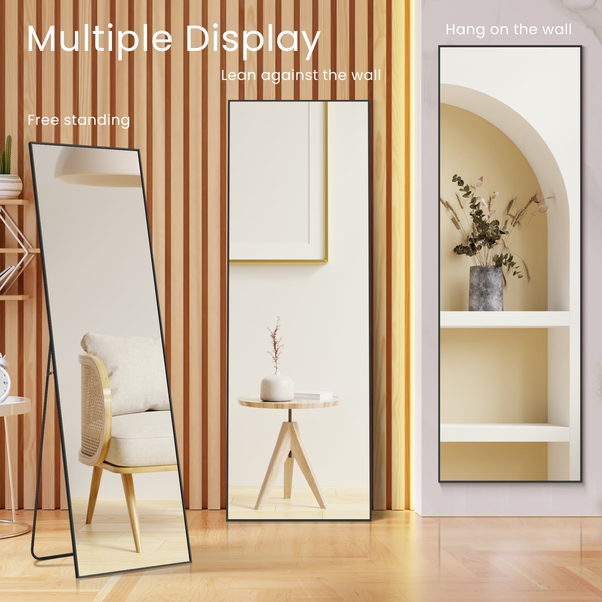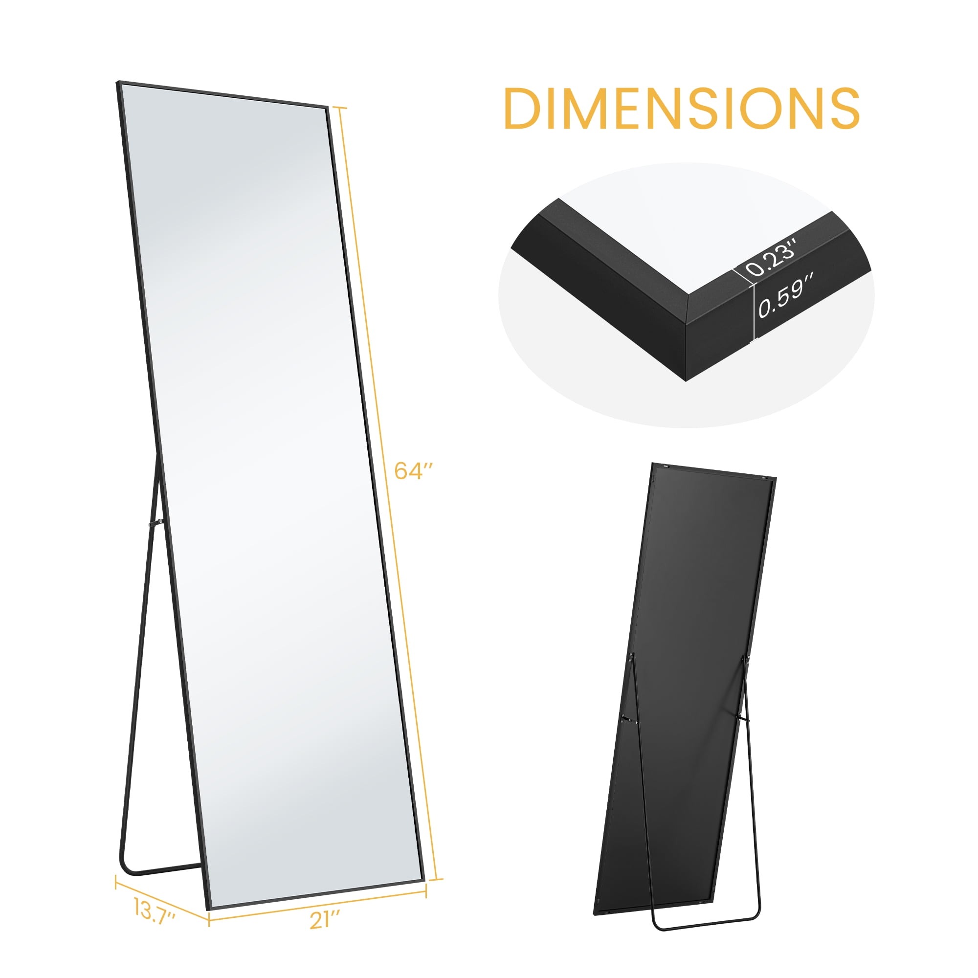 【FULL-SIZED MIRROR】Immerse yourself in a full-sized reflection with our extraordinary standing mirror. Measuring an impressive 64″ in length and 21″ in width, it grants you a complete view of your entire figure in one effortless glance. But this mirror is more than just a practical necessity – it serves as a captivating art piece, effortlessly adding a touch of elegance and charm to your living space, amplifying its ambiance every day. 【ALUMINUM ALLOY FRAME】Embracing this remarkable full-length mirror is a robust aluminum alloy frame designed to resist rust and maintain its vibrant, lustrous appearance. Boasting a sleek 0.23″ width on the front, it not only ensures longevity but also adds a touch of sophistication and modernity to any room. 【ENHANCED NANO GLASS】Crafted from high-definition 3 mm nano glass, our mirror features enhanced explosion-proof technology and a pure silver layer. This guarantees exceptional clarity and reduces the risk of breakage. In the unlikely event of accidental damage, the mirror fragments will be contained, minimizing any potential harm. 【VERSATILE DESIGN】No need for complicated assembly. Our full-length mirror comes with a convenient standing holder, allowing you to easily place it anywhere within your space. It can also be leaned against a wall or effortlessly mounted vertically or horizontally, providing optimal flexibility and space-saving options. Ideal for various settings such as bedrooms, living rooms, walk-in closets, home gyms, hallways, or even fashionable clothing boutiques. 【QUALITY GUARANTEE】Your satisfaction is our priority. Our mirror packaging has undergone rigorous testing to ensure safe arrival. However, if your mirror arrives damaged, please contact us immediately. We offer a hassle-free 100% refund or free replacement for any mirror damaged during transit, without the need for a bothersome return process.