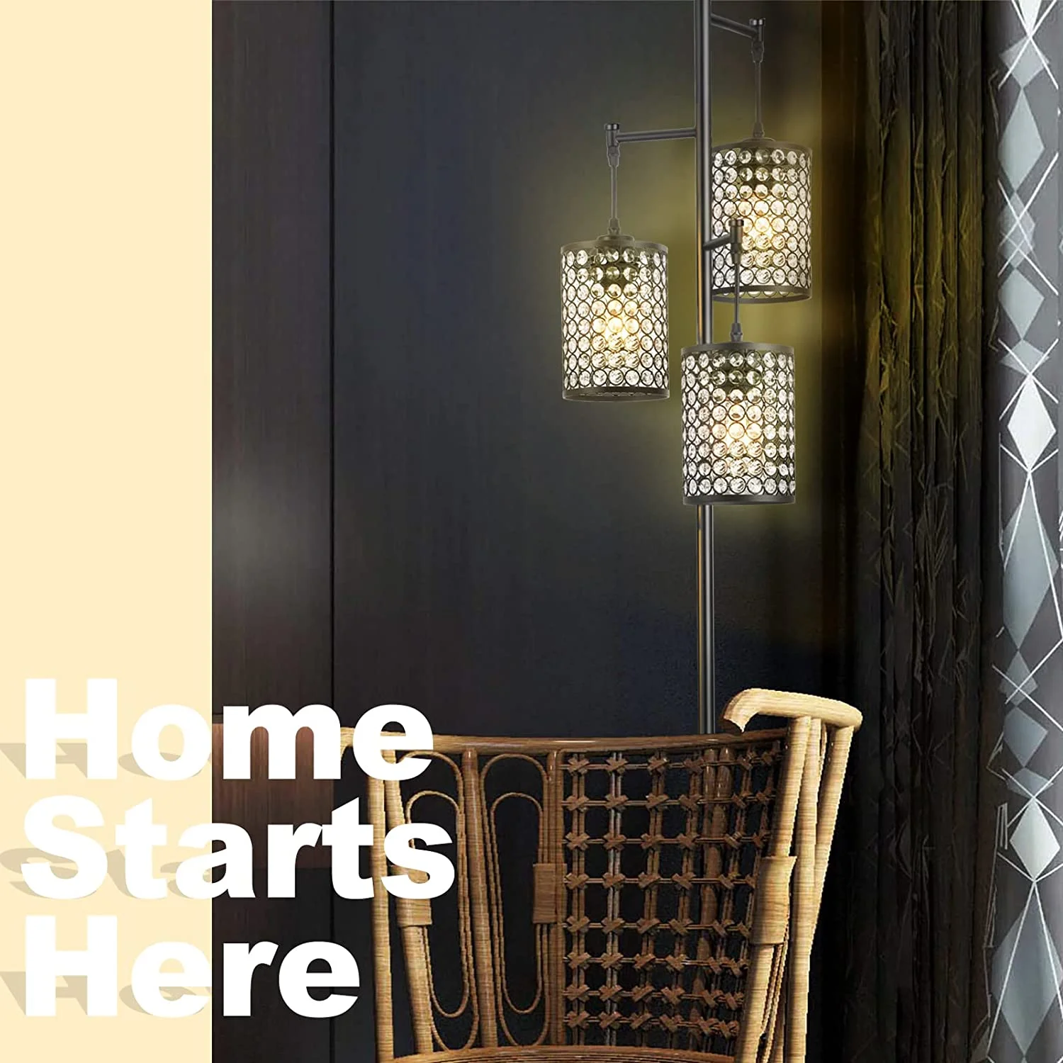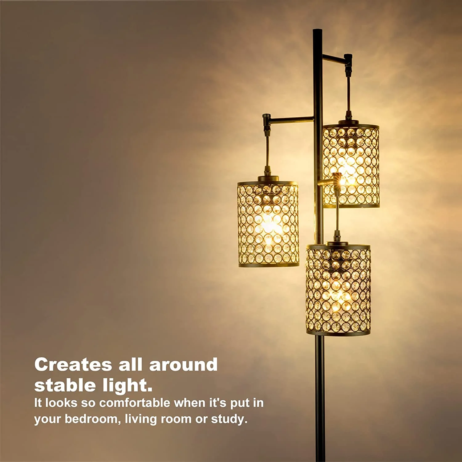 Modern 3-Light Tree Floor Lamp for Living Room Crystal Standing Lamp with On/Off Switch Elegant Black Pole Light for Bedrooms Office Hotel Features 【Modern Elegant Floor Lamp】With sophisticated yet stylish design, this floor lamp combines metal in black finish with crystal collection of nuique birdcages. The birdcage lampshade makes it ideal to match many different furnishing styles, such as minimalist, rustic, contemporary and mid-century. 【Convenient to Operate】The floor lamp is made of superior metal from base to lampshades that it is heavier and more stable. The three crystal birdcages are lightweight but durable, preventing the lamp pole and 3 lights from shaking or being overturned by children or pets. A footrest on/off switches on wires is simple and convenient to operate, suitable for everyone to use. 【Easy to Assemble】This floor lamp requires assembly but it’s easy to get it together, just follow the guidance on user manual for all hardware needed coming with package. 【Perfect Compatibility】AC120V for North America. Built with a standard E26 socket, this standing lamp matches well with various of medium base light bulbs, such as incandescent, LED, CFL and halogen bulbs with E26 sockets. This is compatible with a variety of bulb types, up to 60 watts maximum. (Light Bulbs not included). 【Application Places】This crystal floor lamp high brightness, can reflect a lot of light beam, will enhance the aesthetic feeling of the overall environment, appear very bright. It’s a great choice to use in bedroom, living room, dinning room, office room, reading room, working room, etc. Applied to different home decoration style and use environment.