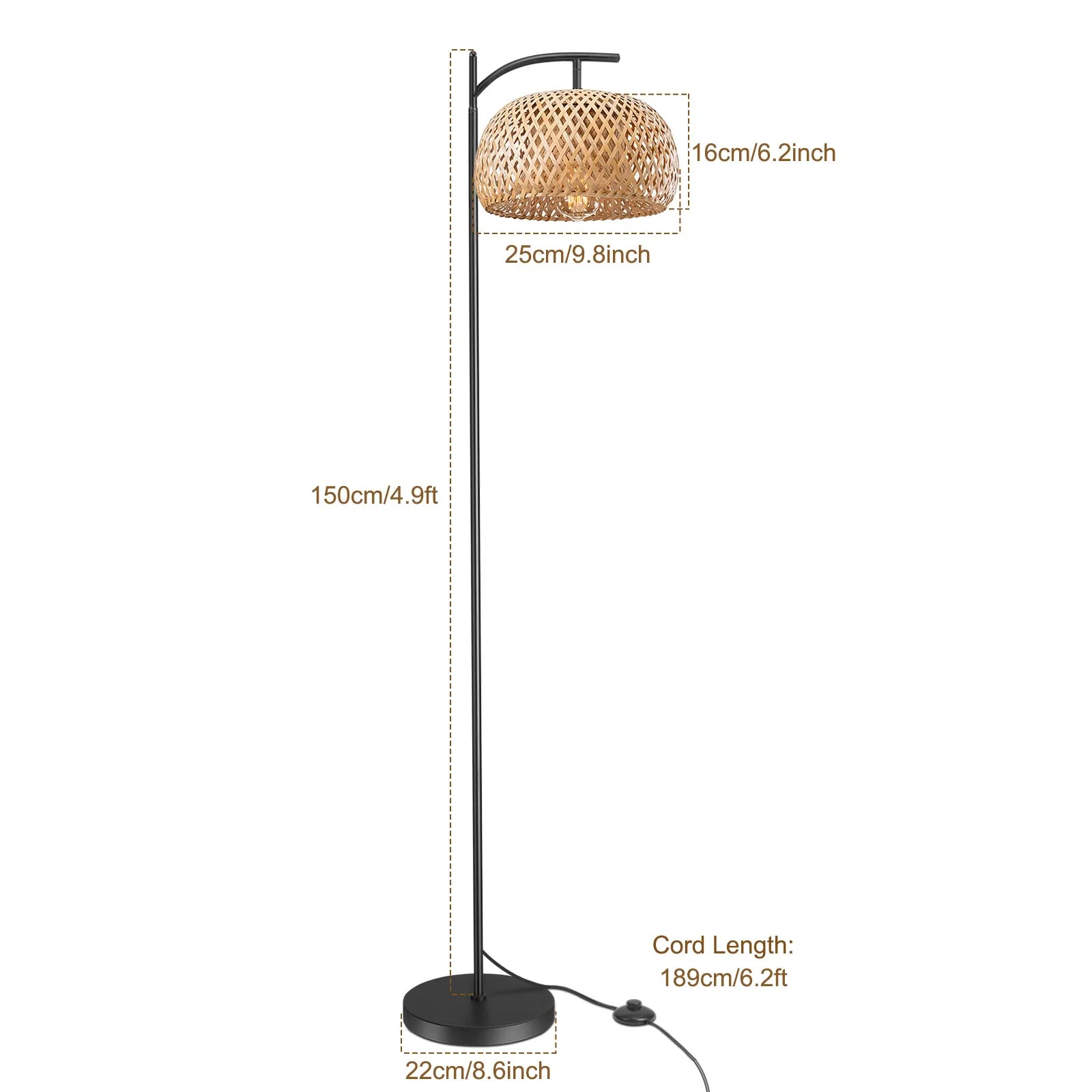Specification Material: Rattan & Metal Voltage: AC120V Power Source: Plug in Cord Length: 220CM / 7.2FT Bulb Base: E26/E27 Bulb Included: No Lamp Shape: Oblate Light Type: Incandescent, LED, CFL, Edison Dimensions: 14.1″L×14.1″W”×67″H