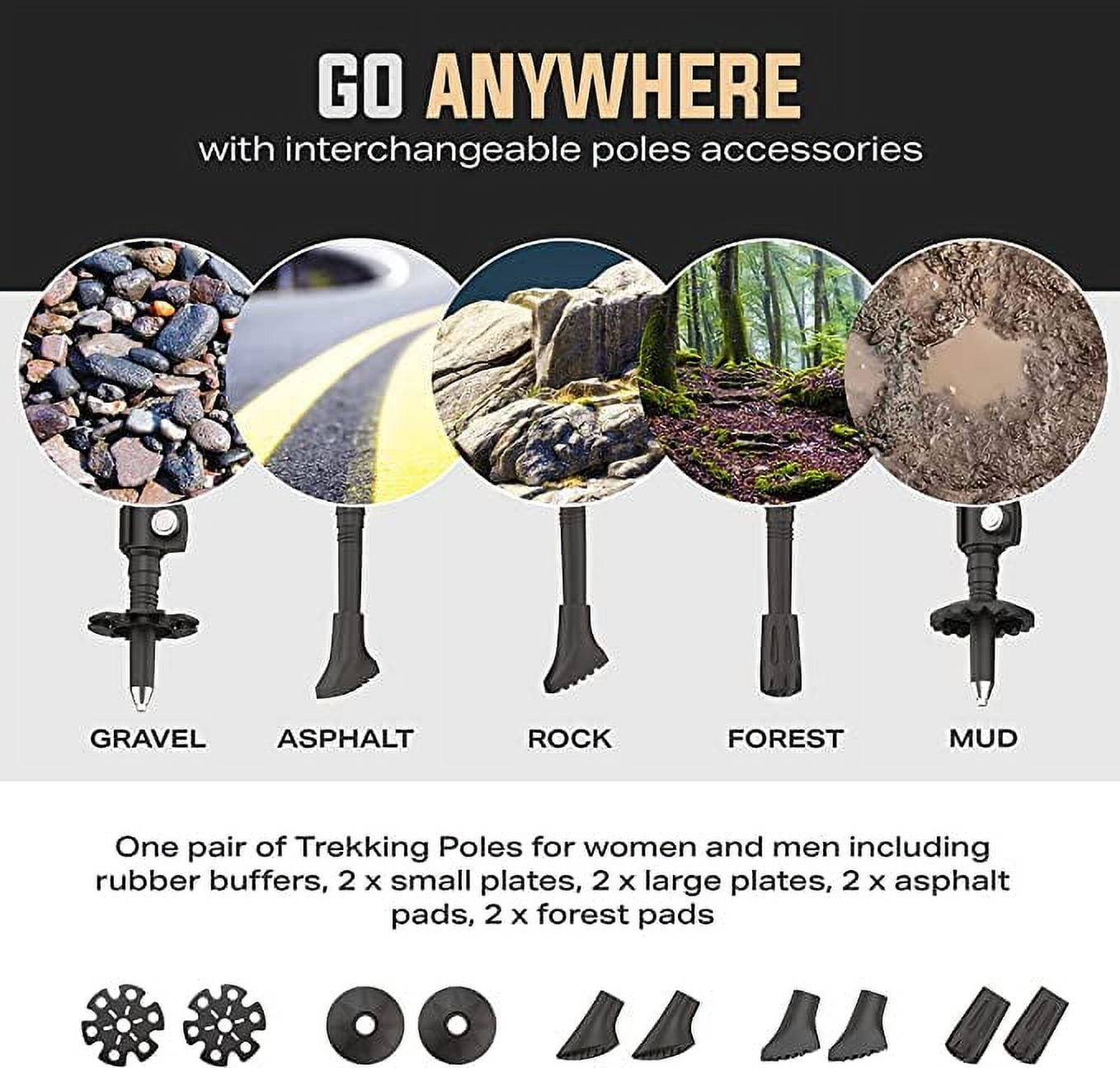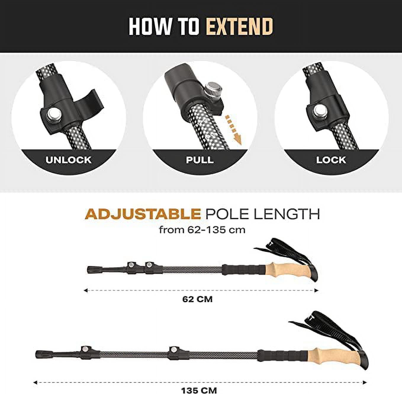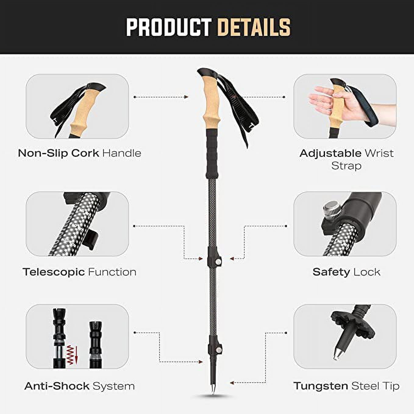 Made for Adventures: Are you constantly searching for undiscovered and breathtaking landscapes? If that sounds like you, our carbon fiber walking poles are the perfect travel and adventure companion. Tough and Built to Last: The classic 3K carbon material hiking sticks have been reinvented and optimized to every detail to give you a great hiking experience and to withstand pressure and the wildest adventure! Versatile and Convenient: With swappable rubber caps, our adjustable hiking poles for men and women provide the perfect grip for every terrain! They can be dismantled to a length of 53 cm and are also ultralight at just 225 g per pole. Comfort and Stability: Our ultralight trekking poles have a quick-lock system that features ergonomic cork grip handles and an adjustable hand loop to provide maximum comfort and stability. Quality You Can Trust: Try our telescoping ski poles out for yourself without any obligation before deciding whether you want to keep them. We’re a German company and stand by our word!