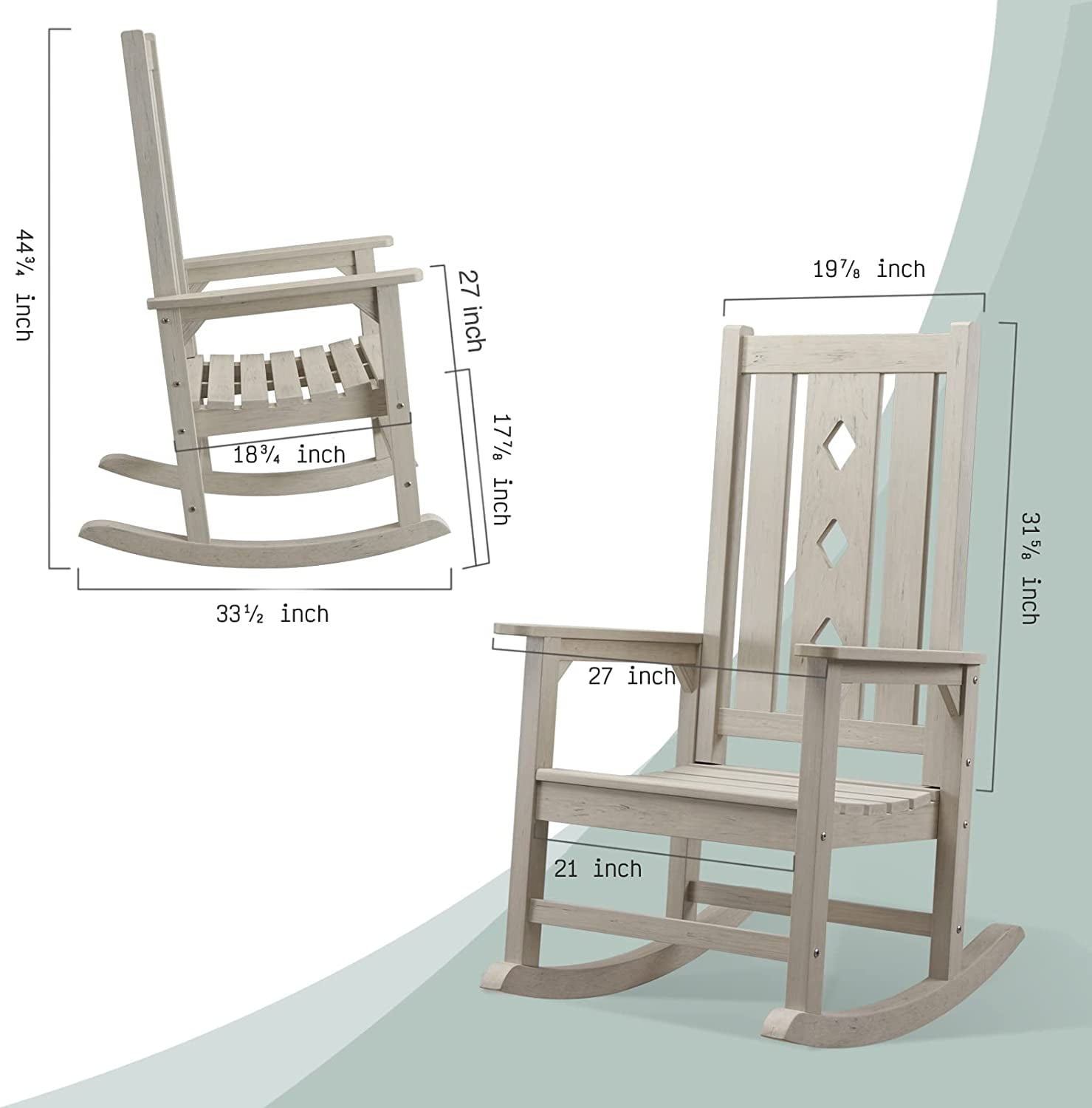 Large Size and High-capacity Load: Efurden rocking chair has adequate seeting room with 350 lbs load for adult. Smooth Rocking with Adequate Radian: The radian of the patio rocking chair has been tested several times, to ensure the comfort and safety. The curve of the seats and the study high backrest make a prolonged sitting more comfortable. All Weather and Versatile Use: Efurden rocking chairs are made from poly lumber. It allows your chairs to be placed on any terrace, garden, beside any pool or beach in all seasons, without concern for the weather damage. Easy Assembling and Low Maintenance: There’re only six parts for you to assemble. The inserted nuts will make an easier assembling and ensure a more stable chair for customer. Only water and soap are needed for routine maintenance. Wood-like Surface & Bright Color: This rocking chair has specially treated surface, which makes it touches like real wood. But it’s much more heavy duty and fade resistant than real wood. The white color is pure and bright, will surely embellish your garden.