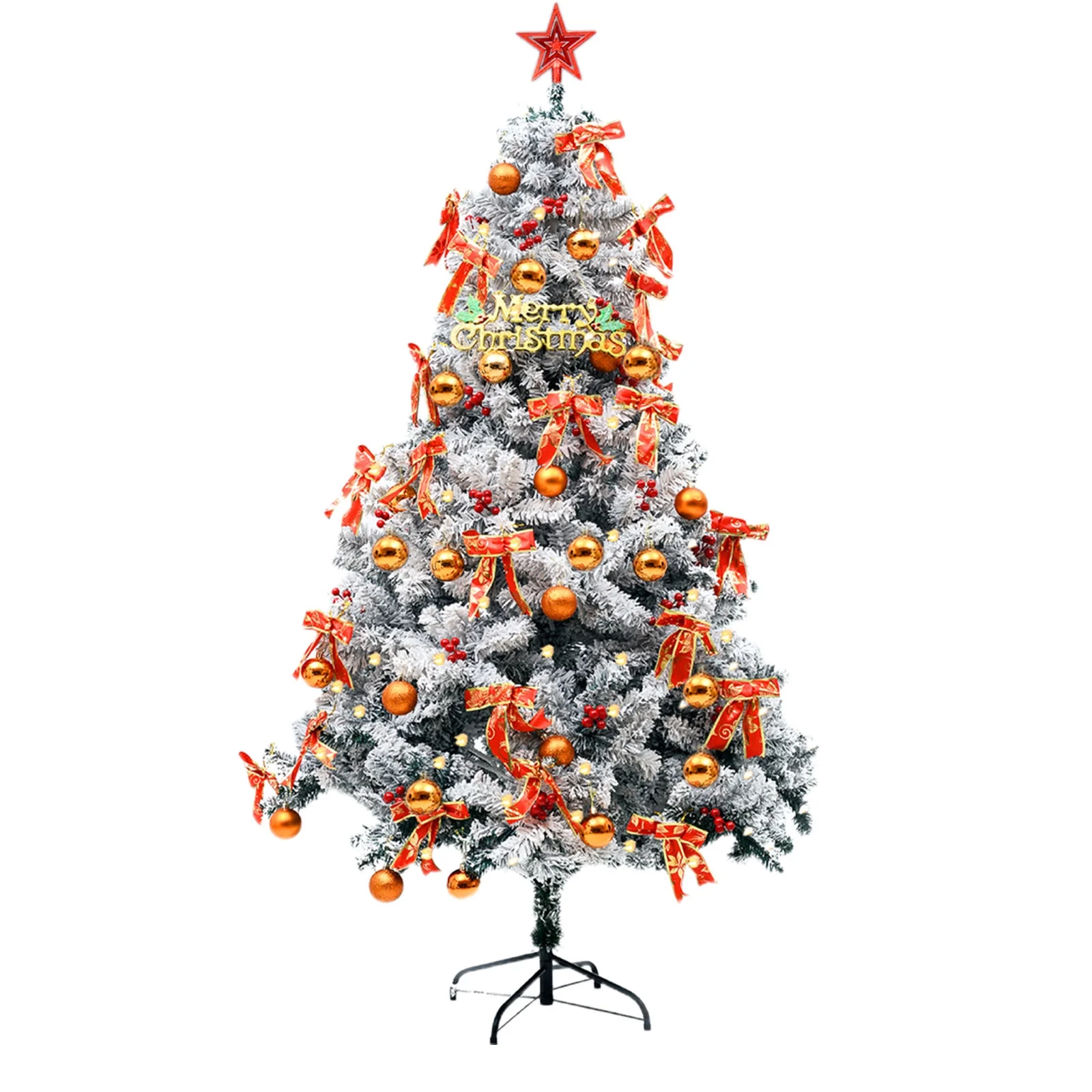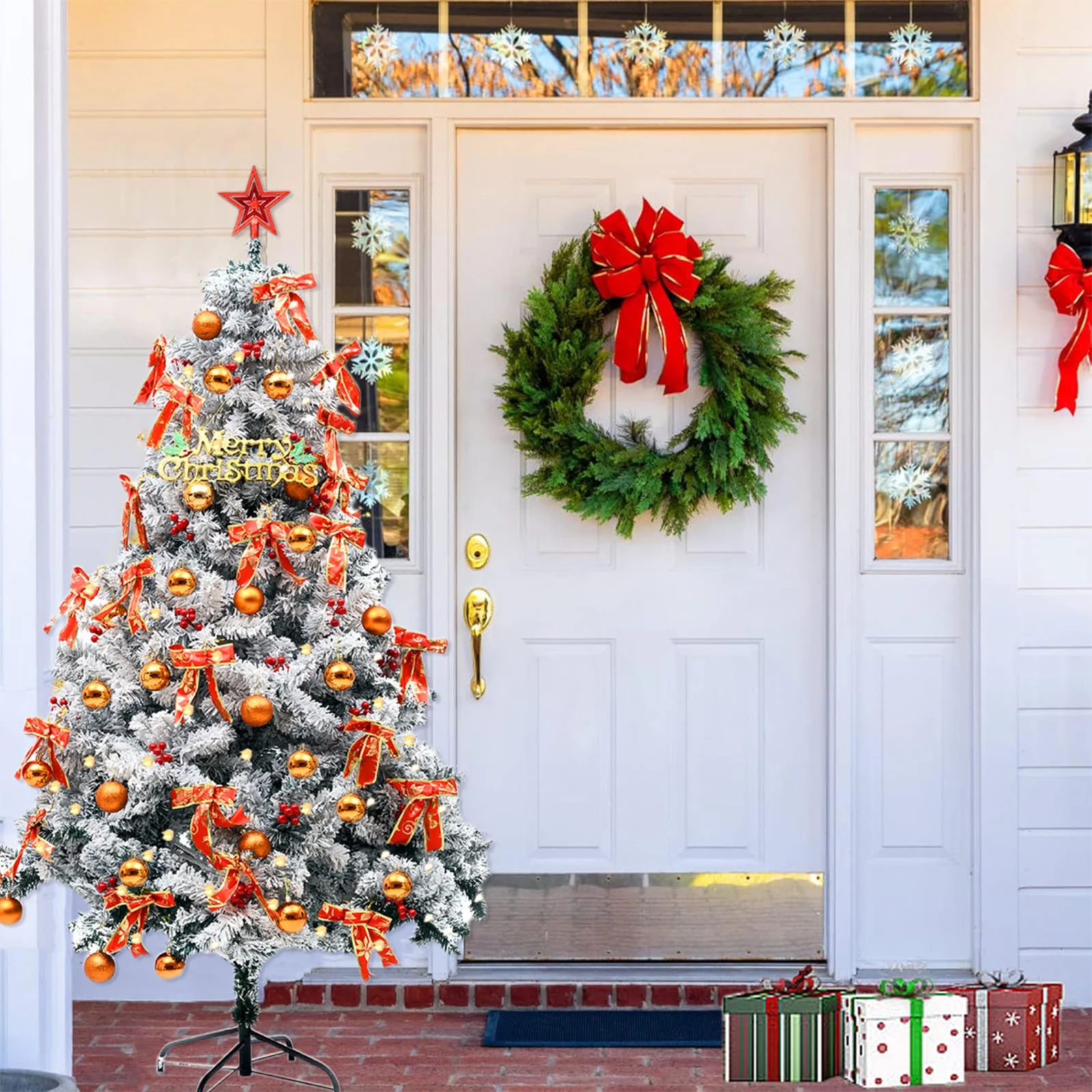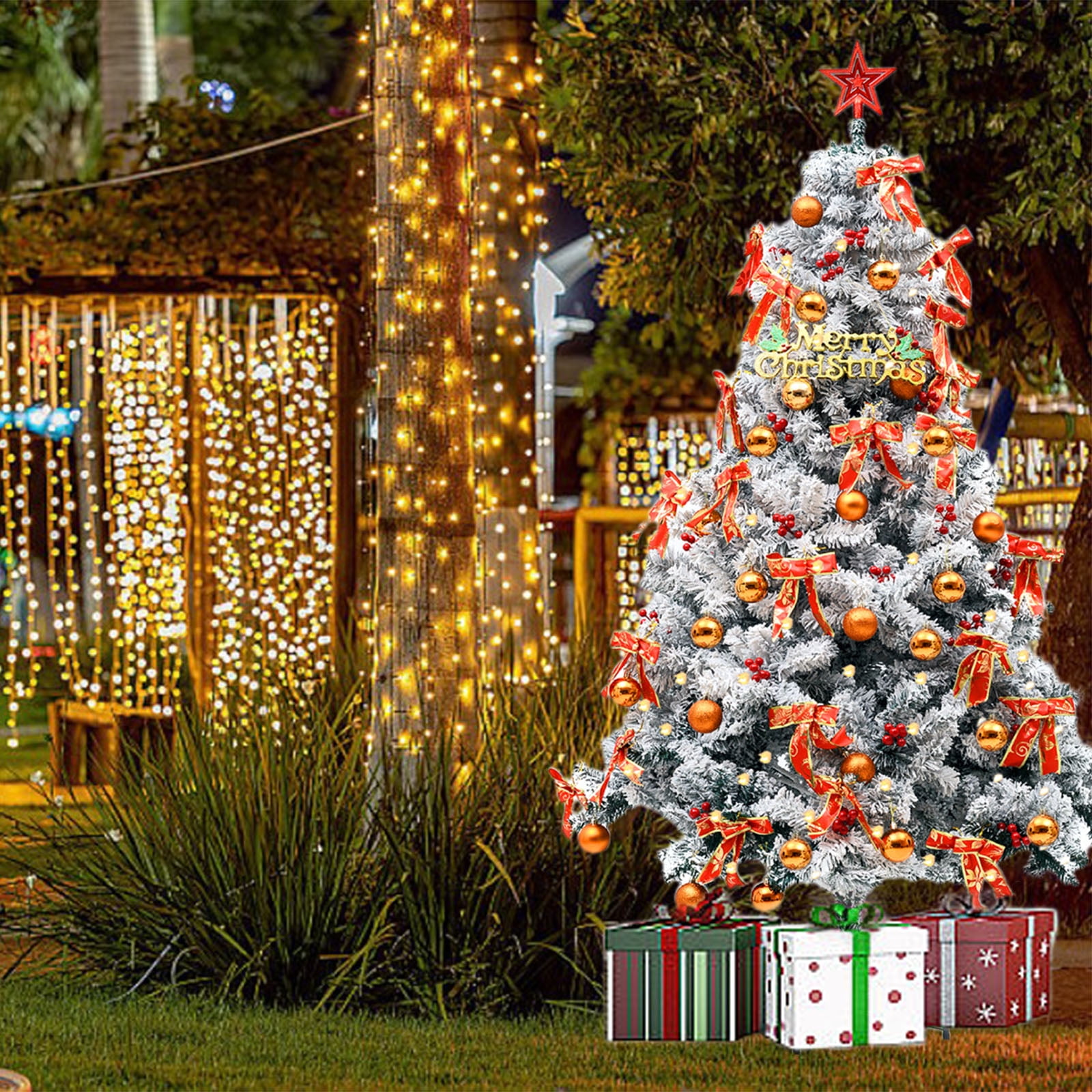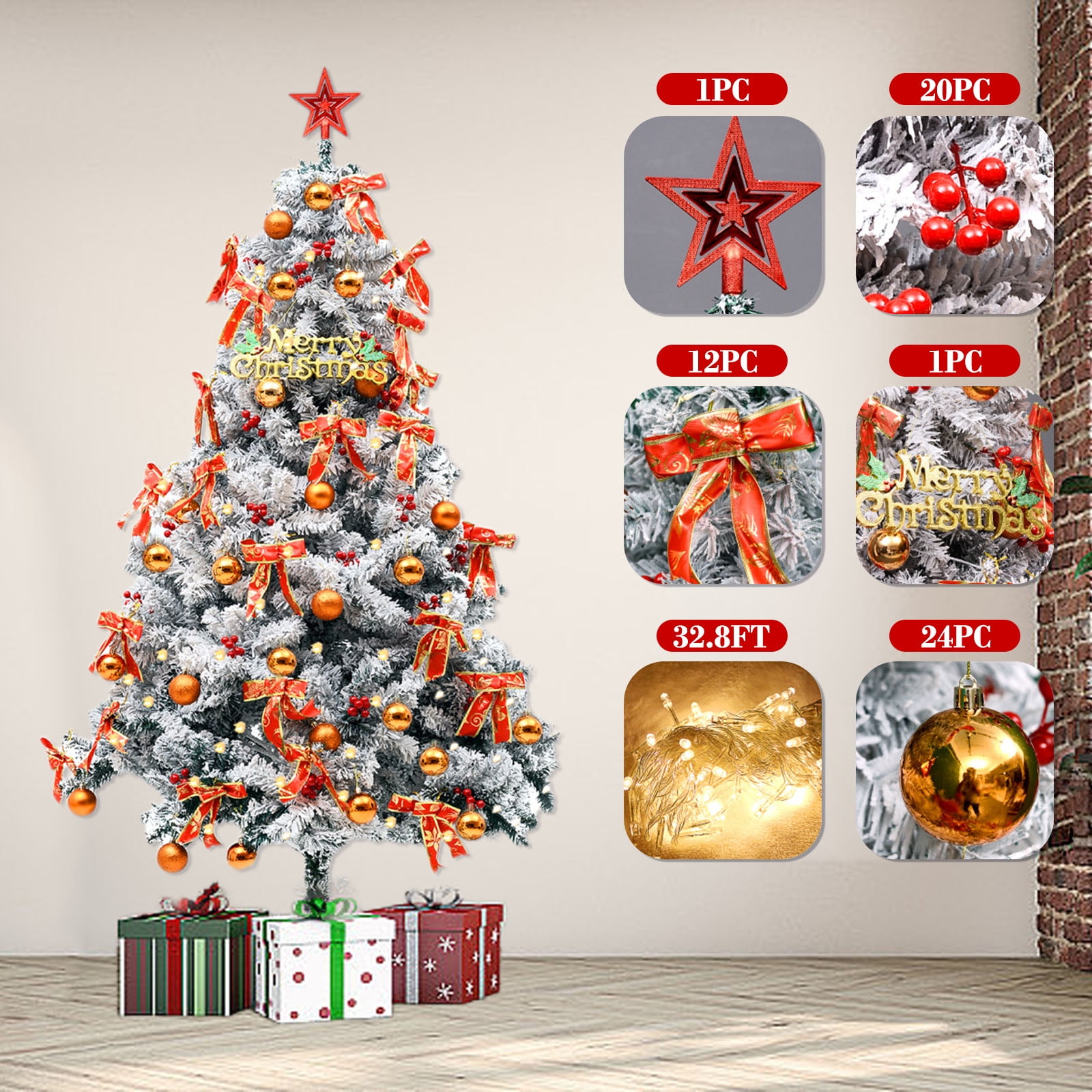 EGNMCR Holiday Christmas Tree Ornaments Set Include: 32.8ft Warm String Lights, 20 Berries, 12 Bow Tie, 24PCS Christmas Balls, 1 Merry Christmas Hanging Ornaments, 1 Star Tree Topper. Holiday Cheer This Season with a EGNMCR Flocked Artificial Christmas Tree that Helps Make the Season Feel Complete; Equipped with Sturdy Branches, Strong Enough to Hold Garland and all your Favorite Ornaments for a Customized Look Premium Quality: Crafted with attention to detail, this Christmas tree features branches that are full, giving it a lifelike appearance. The metal base provides stability and durability, ensuring that it will last for many holidays to come.strong enough to hold garland and all your favorite ornaments for a customized look Suitable Sizes: Available In 6.9ft this Christmas tree can suitable for any space, whether it’s a cozy apartment or a spacious living room. create a stunning centerpiece for your holiday celebrations Easy assembly and fluffing: Put the tree together in just 3 steps: simply connect the base to the largest part of the tree before attaching the remaining sections and easily fluffing the branches Perfect Holiday Gifts: Whether you’re buying it for yourself or as a gift for someone special, this Christmas tree is sure to satisfy. Its elegant design and quality craftsmanship making it a standout choice for anyone looking to add some holiday ambiance to their home