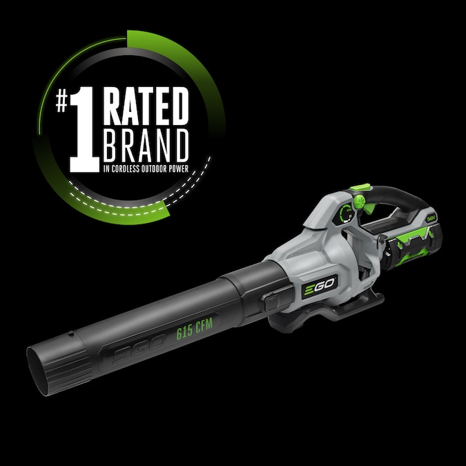 The 615 CFM EGO POWER+ Blower combines unprecedented power and performance! With air speeds up to 170 MPH, this blower can move heavy debris with ease. The lock-on speed-control dial allows you to adjust your speed from 200 CFM to 480 CFM for ultimate control. When you are ready to power through heavy debris, hit the turbo button for 615 CFM! All this industry leading power is combined with industry leading run times; over 75-minutes of continuous run time. The high-efficiency brushless motor delivers longer run time, low vibrations, and an extended motor life. Turbine fan engineering, inspired by advanced aeronautics technology, performs better than premium gas-powered models. The included tapered nozzle makes clearing debris in all conditions easy. This quiet, lightweight and compact blower gets the job done faster and quieter than gas! Experience Power Beyond Belief™ without the noise, fuss and fumes. Compatible with all EGO POWER+ ARC Lithium™ batteries