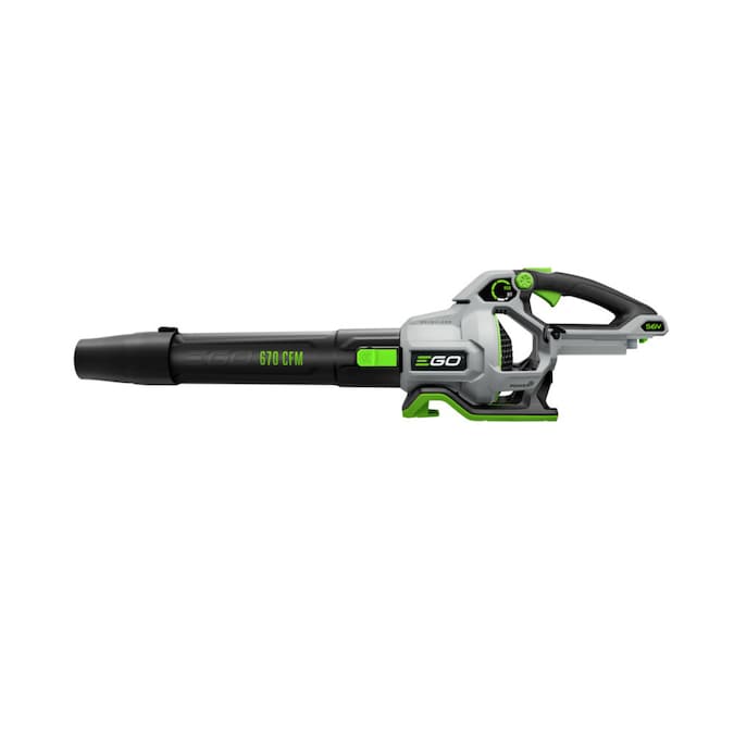 The EGO POWER+ 670 CFM Blower delivers air speeds up to 180 MPH and 670 CFM to power through wet leaves, caked on grass, rocks, and other heavy debris. This cordless leaf blower delivers up to 80 minutes of runtime on a single charge with the recommended 56V 4.0Ah ARC Lithium™ battery (available separately). Its speed control dial allows you to adjust your airspeed from 250 to 530 CFM for ultimate control. Activate turbo mode to power through heavy debris with 670 CFM and 21N push force. The variable speed trigger includes a cruise control dial for consistent blowing. This leaf blower features a high-efficiency brushless motor that delivers long runtimes, low vibrations, and an extended motor life. Turbine fan engineering, inspired by advanced aeronautics technology, performs better than premium gas leaf blowers. The included tapered and spread nozzles make clearing debris in all conditions easy, and IPX4 weather-resistant construction delivers protection from the elements. This quiet, lightweight, and compact electric leaf blower gets the job done faster and quieter than gas. Experience Power Beyond Belief™ without the noise, fuss, or fumes.