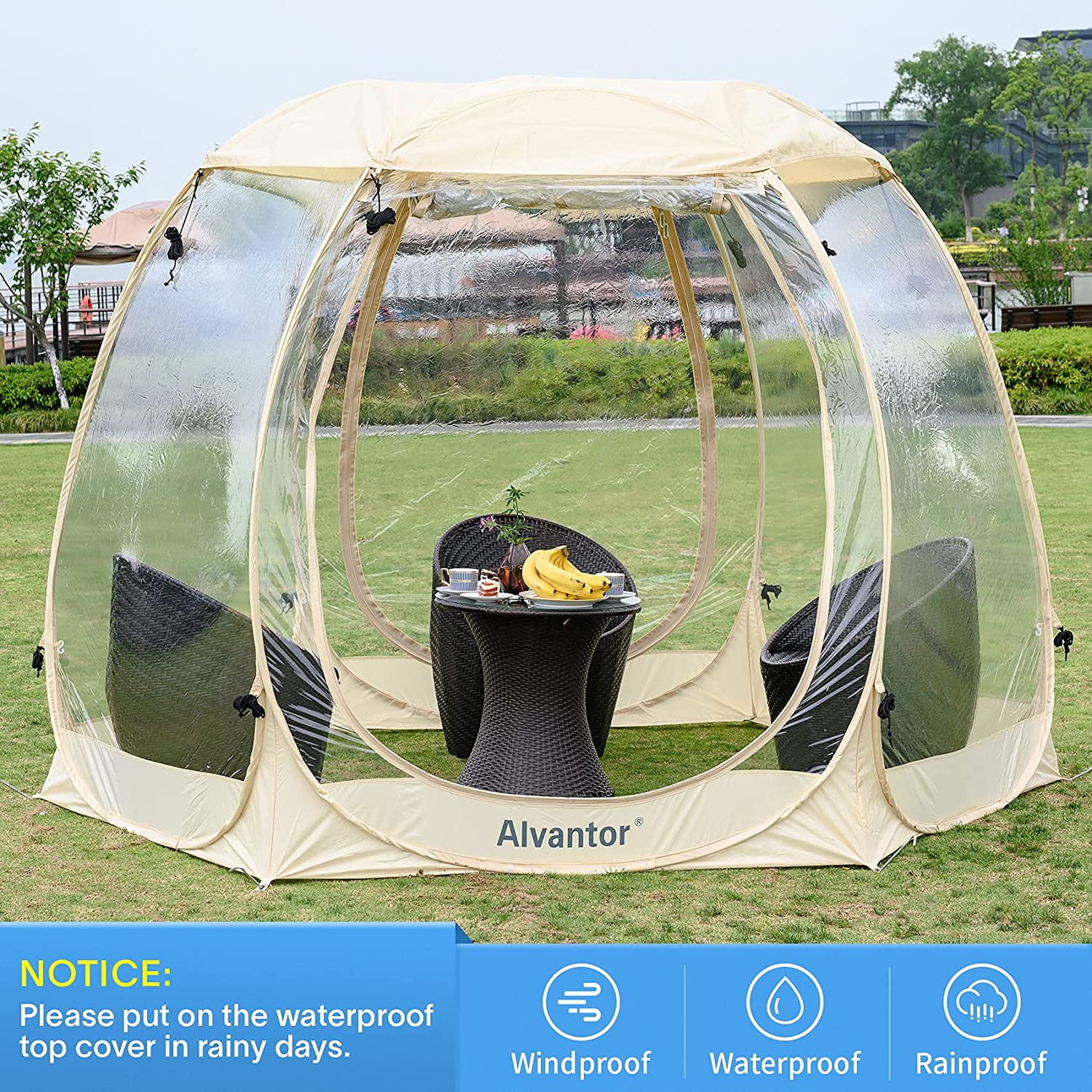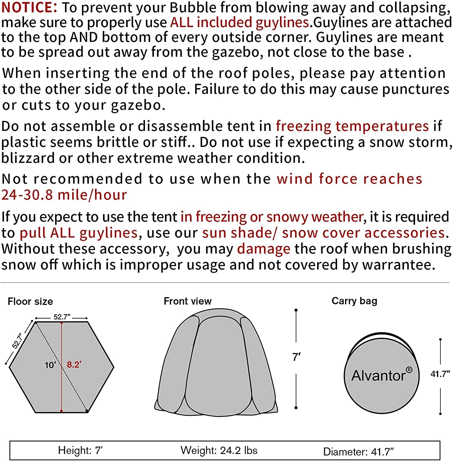 POP-UP BUBBLE TENT THAT FOLDS DOWN: Innovative fiberglass ribs pop up in seconds with little assembly required thereafter. Choose to secure down to the ground with sandbags or guylines, and enjoy in your backyard, garden, or hosting small parties and events. Once you’re finished, fold the tent down and store in the carry case. SPACIOUS AND WARM: Alvantor big bubble gazebo provides a spacious interior shelter that comfortably fits between four and six adults. Enough room to place various pieces of furniture so you can give your bubble tent a homely feeling. The six, transparent PVC windows provide 360° view of your surroundings, whilst the inside of your bubble tent stays warm thanks to the excellent heat retention. PACKED FULL OF ADDITIONAL FEATURES: Two windows on the top provide ventilation to let your pop up bubble breath, along with waterproof covers to protect against the rain or snow. Features internal hooks to hang coats or bags, and additional support features to increase stability during windy weather. Two large entrance doors with double side silicone zippers, allow easy access from inside and out.