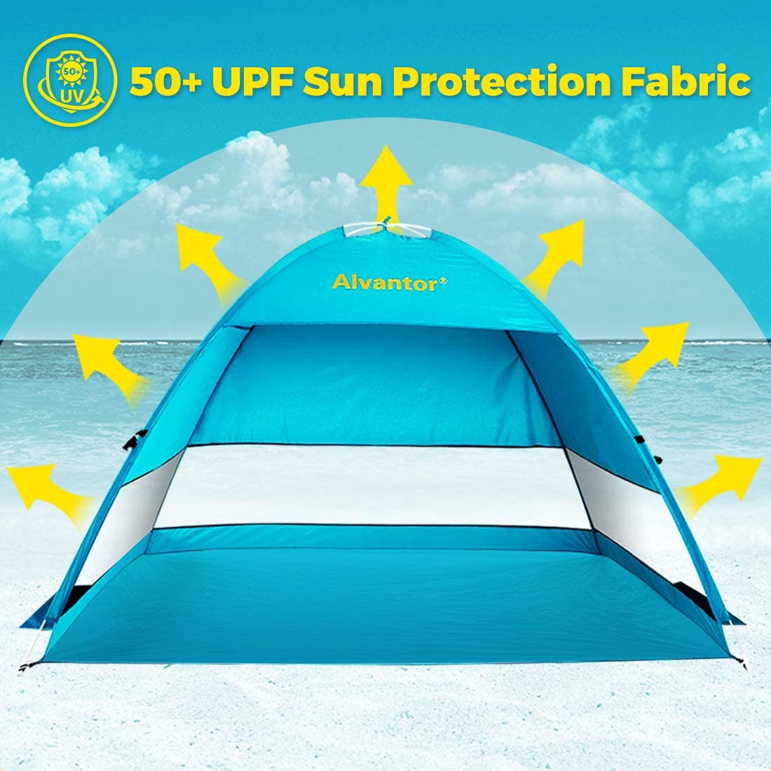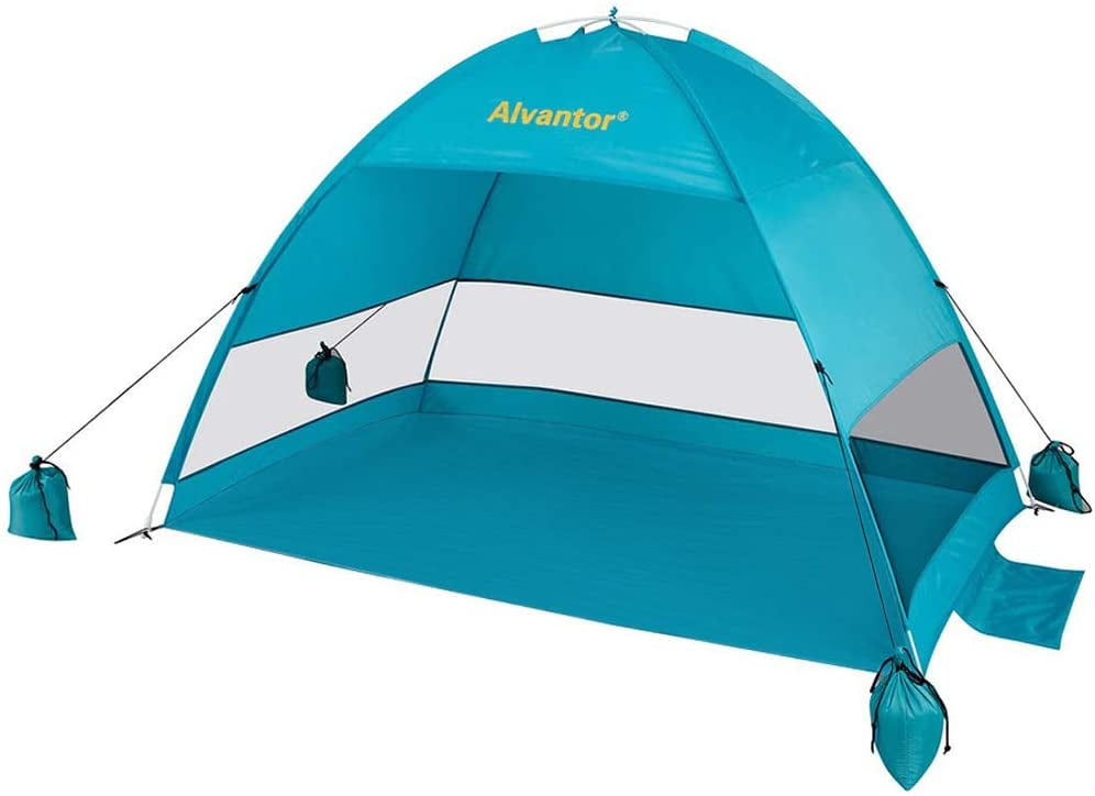 Super easy setup: This beach tent sun shelter pops up automatically in seconds and sets up in less than 30 seconds Lightweight design: Weighing only 3 lbs, it is the lightest sun shade beach tent on the market, featuring a new fiberglass frame that is safe, durable, and rustfree Innovative protection: Offers 50+ UPF UV protection and waterresistant fabric for walls and floor, ensuring a safe and comfortable experience Excellent ventilation: Equipped with three side mesh panels for optimal airflow Stability features: Includes three sand pockets, four extra sandbags, and four stakes, making it windproof up to 25 mph