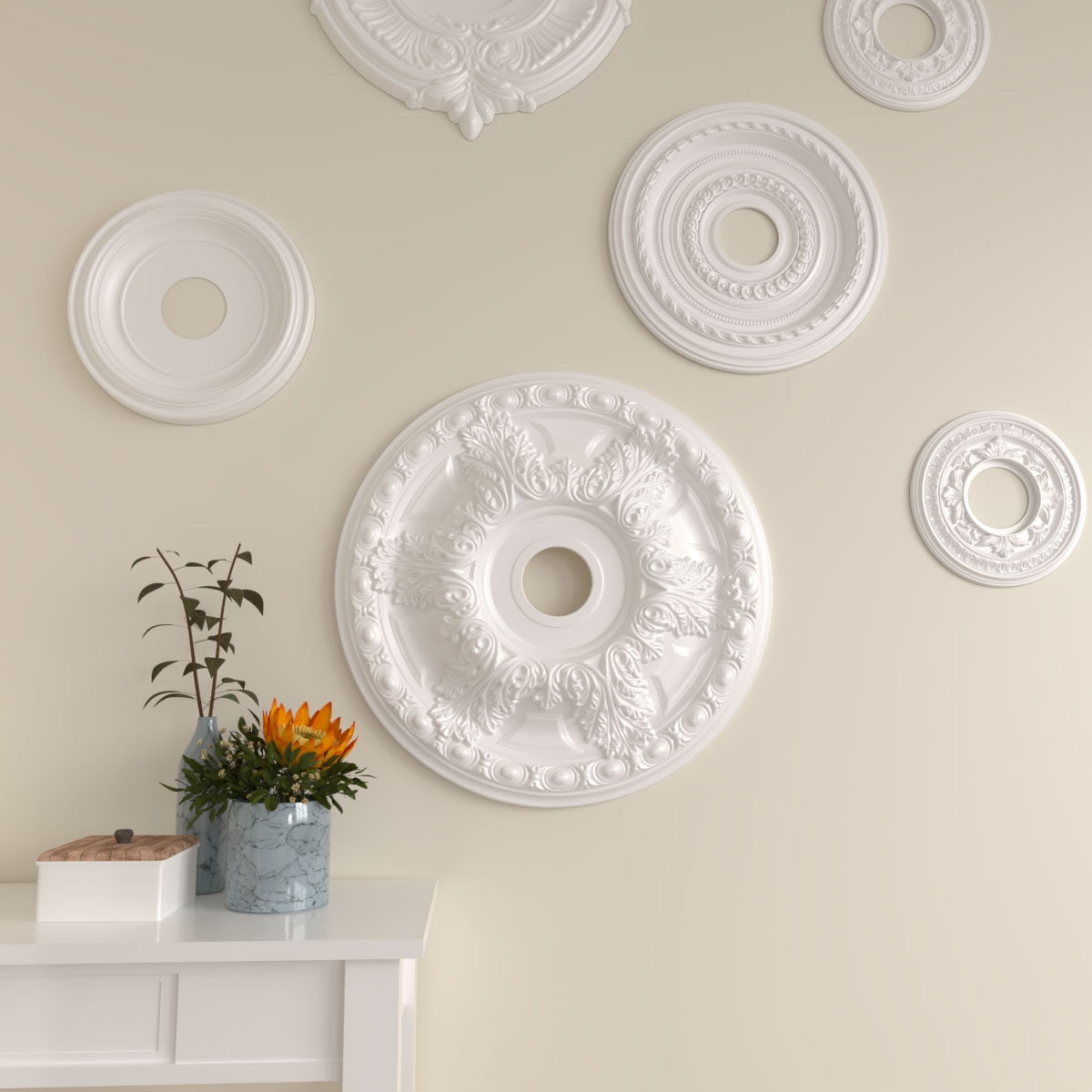 Our sturdy medallions are made of the highest quality material, for a fraction of the cost of traditional plaster or wood. Our green, environmentally friendly material can be painted, gel stained, marbleized or faux finished making it ideal for a variety of interior and exterior applications. Easy installation using common woodworking tools and adhesive, provides a dramatic change with instant elegance and personality. Add luxury and attractiveness to an average ceiling fan, uninspiring light fixture, or get creative by mounting them on the wall for an innovative look. We offer two-piece ceiling medallions for ease of installation and abstract design options as well. With more than 400 styles to choose from and simple installation we are sure to have the perfect medallion to inspire a new project for the designer in you.