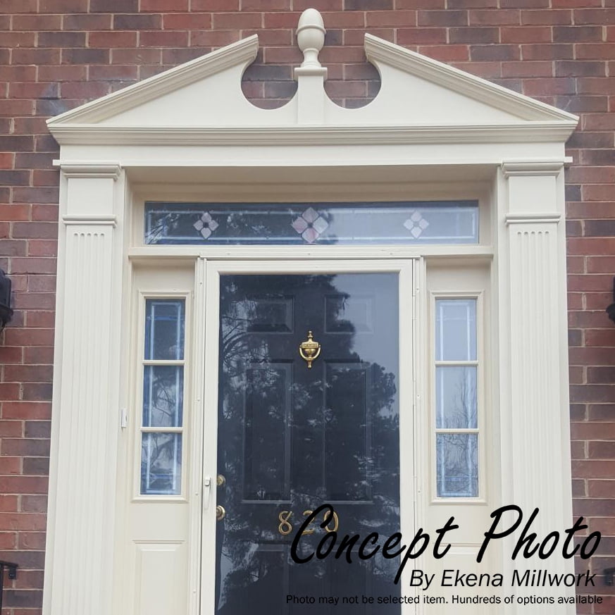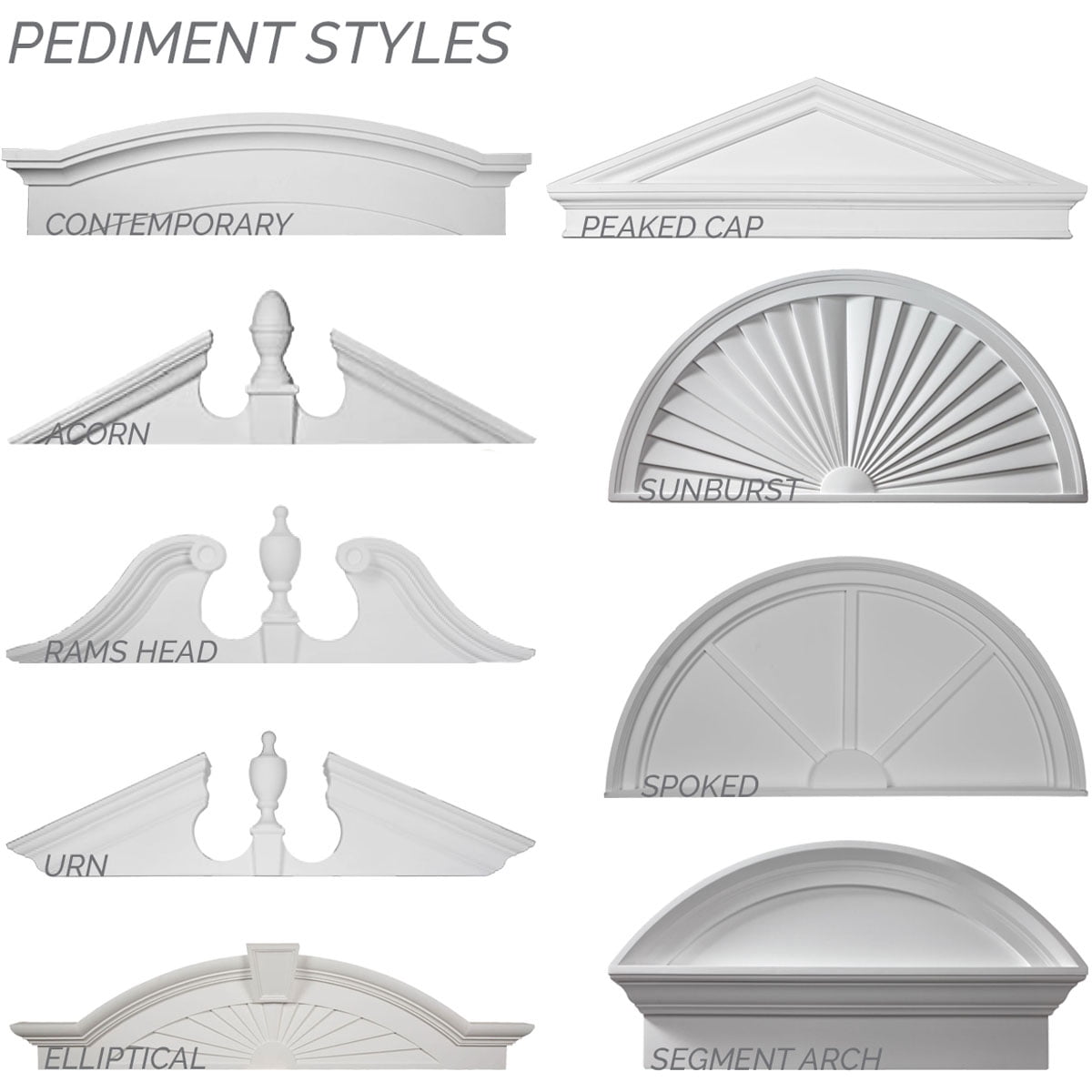 Pediments are the portion of the trim that is located above the pilasters, which are the column like frames on the sides of windows and doors. Directly below the pediments though, between the pediment and the pilasters, is a crosshead or breast board. The crosshead is the flatter, protruding section directly above the door. Pediments can be purchased by themselves or can come with a crosshead already attached. These Pediments are manufactured out of a high density urethane, which is made to resemble wood without the maintenance required by wood products. Urethane products will not crack, split or rot. They are usually less expensive than wood alternatives.