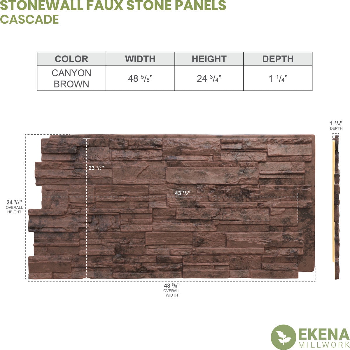 Ekena Millwork 48.625″W x 24.75″H x 1.25″D Cascade Stacked Stone, StoneWall Faux Stone Siding Panel, Canyon Brown