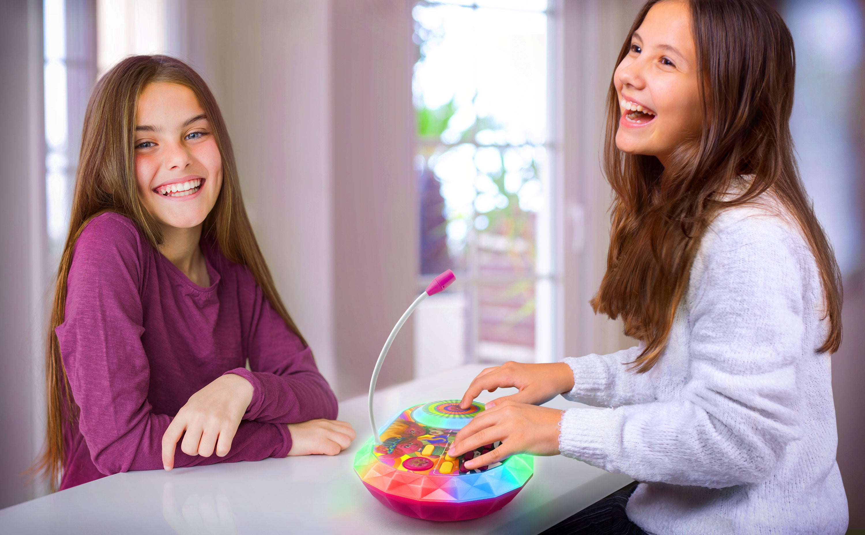 Toy Turntable: Layer together your voice, songs, and background beats to create your own music. Pick a backing beat, and then mix in sound effects and vocals to make a masterpiece! Designed for kids aged 3 and up. Built-in Music: Includes extended clips of 2 built-in songs: It Takes Two and We Are Family. Make your own remix using record scratch sound effects and much more. Real Working Microphone: Use the microphone to sing your heart out! Volume and Tempo sliders allow you to raise and lower the sound and speed, too! Kid-friendly Controls: Use the free spinning turntable to scratch while you mix your jams. Interactive lights glow as you spin, scratch and drop the beat!