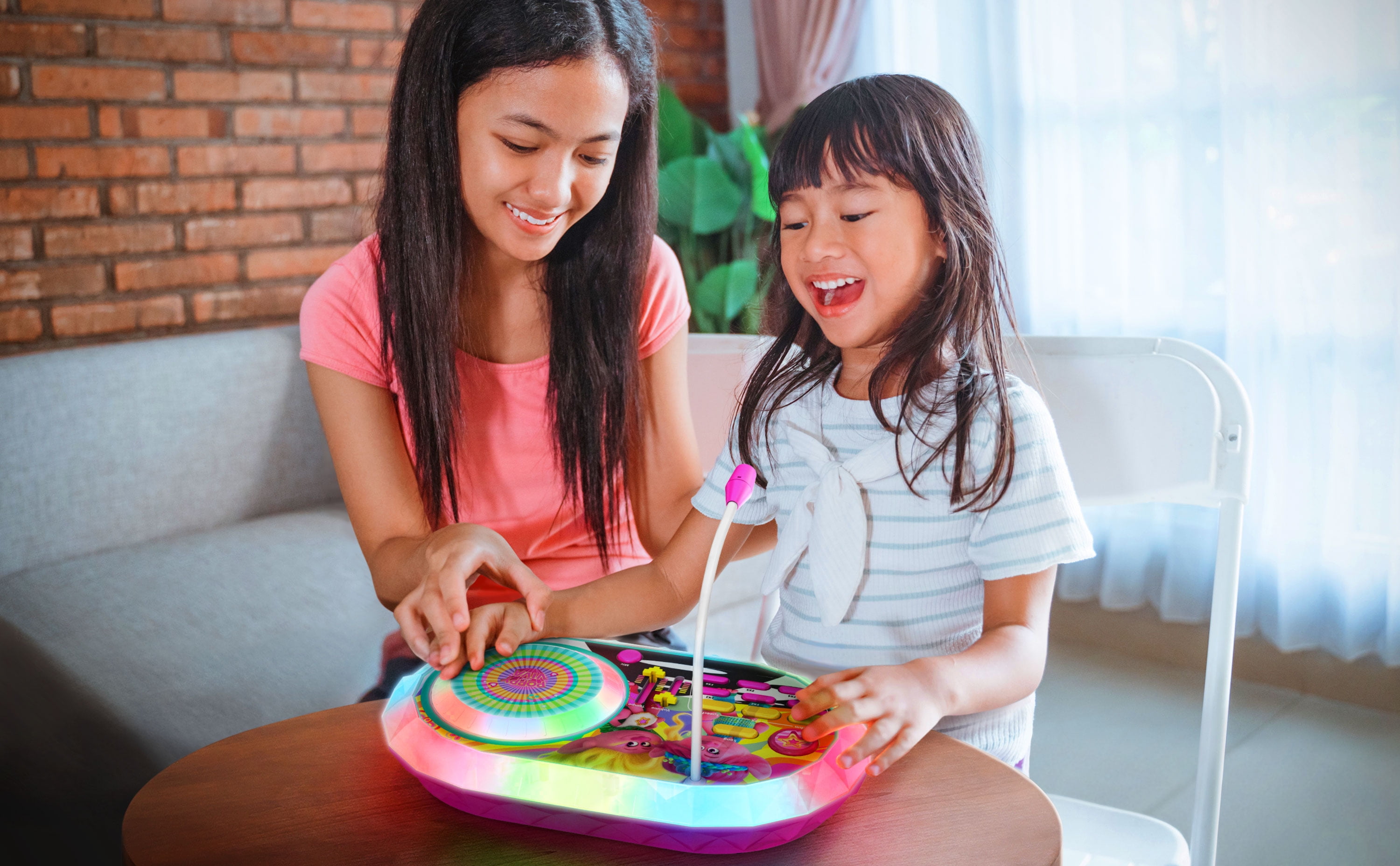 Get the party started with the Trolls DJ Party Mixer! Choose from a variety of beat rhythms, musical loops, and sound effects to edit and mix your own creations. Activate background rhythms or add your own voice by using the built-in microphone. Then use the turntable to scratch it up! Plus, light up effects glow as you spin! With cute and colorful graphics inspired by Trolls Band Together, this turntable toy is sure to please any fan of the new film. Designed for kids aged 3 and up.