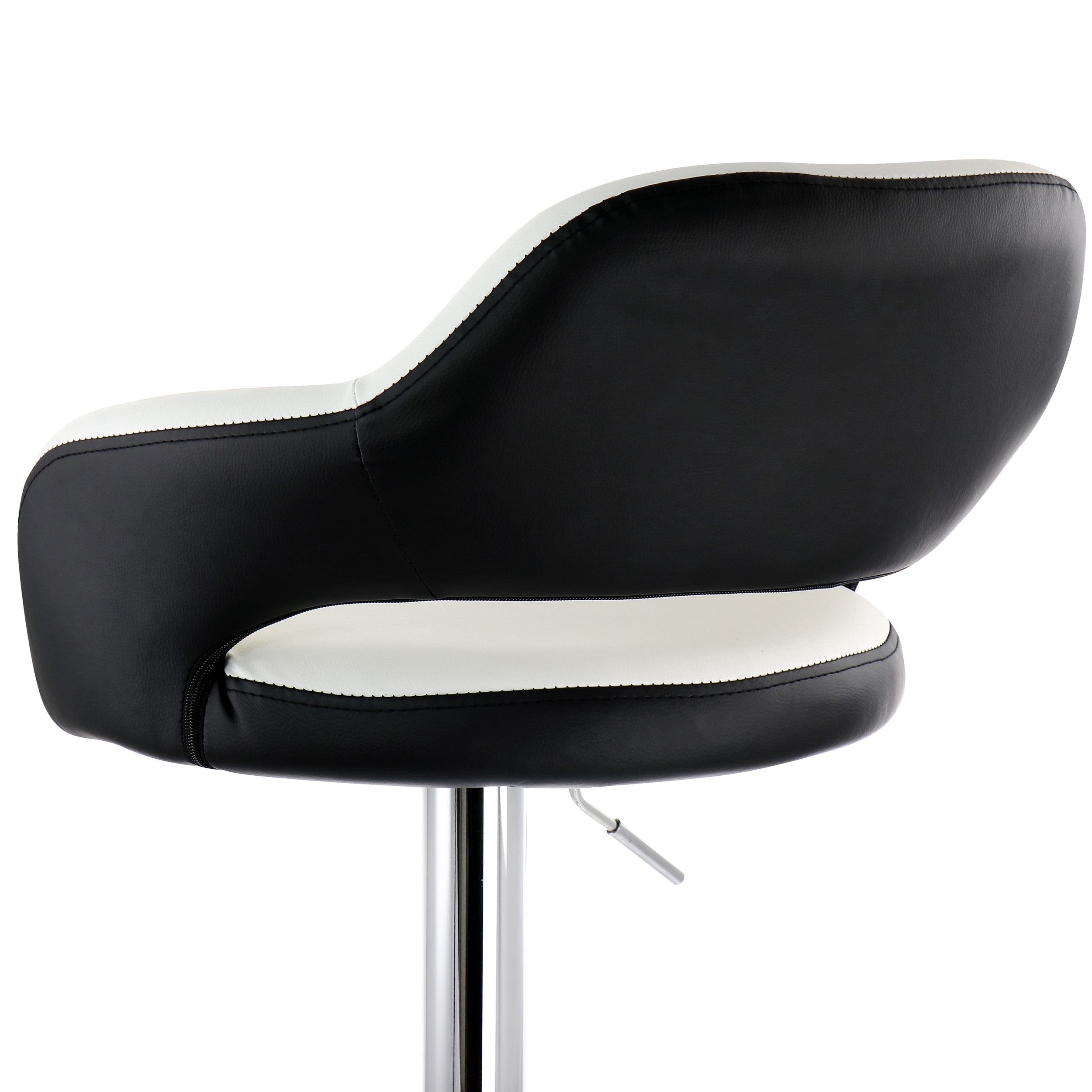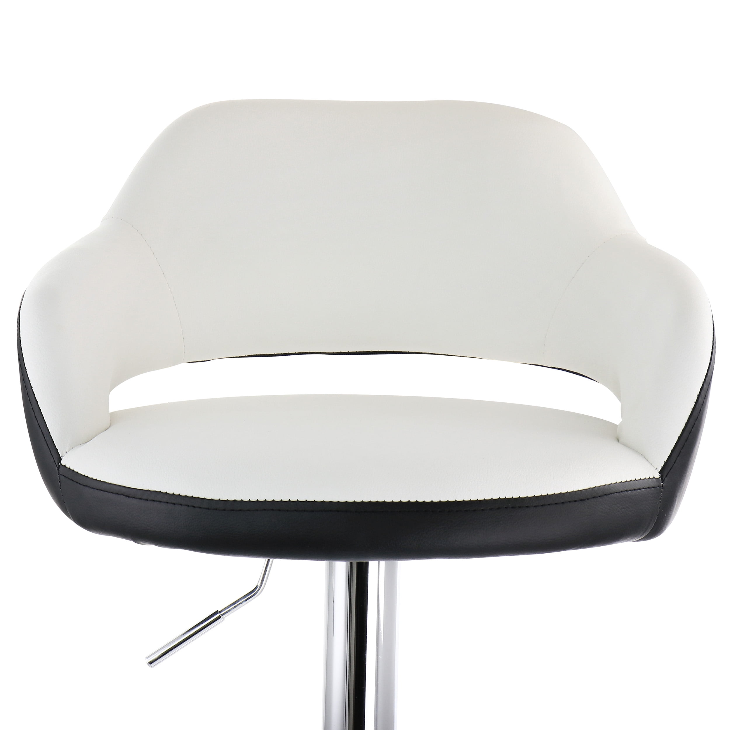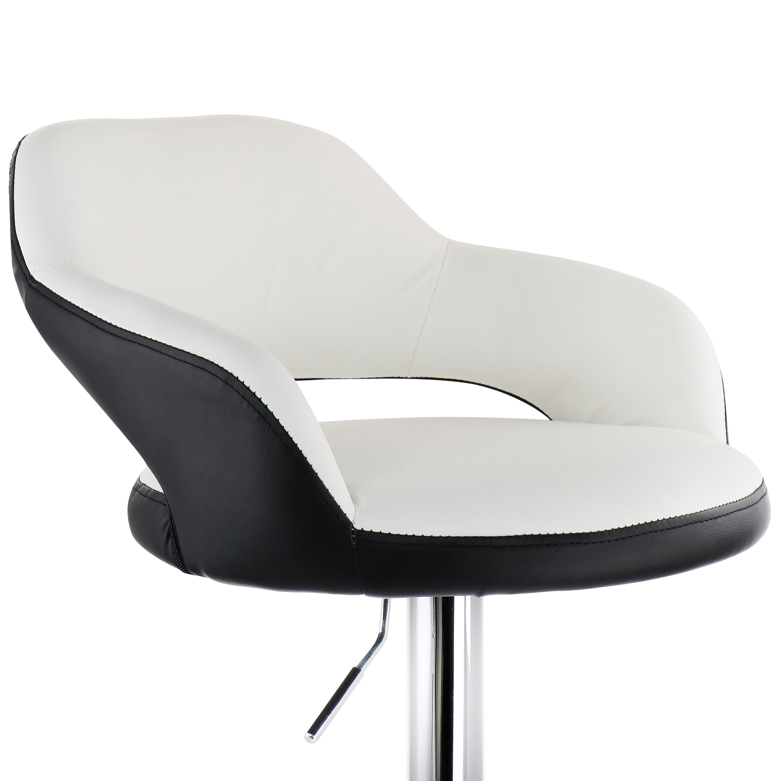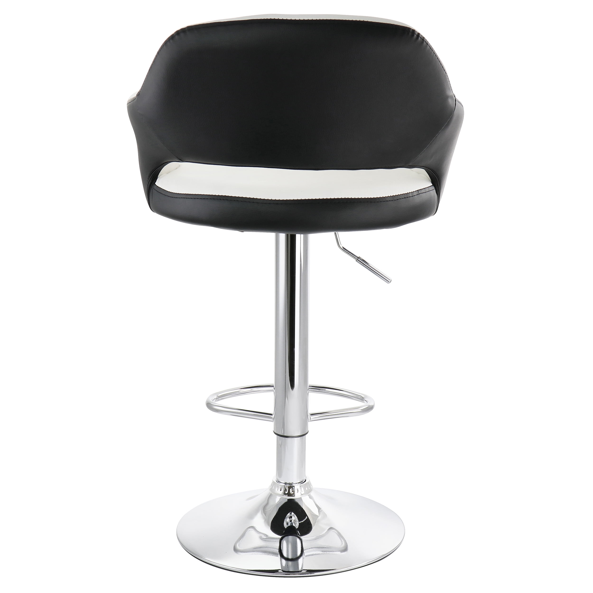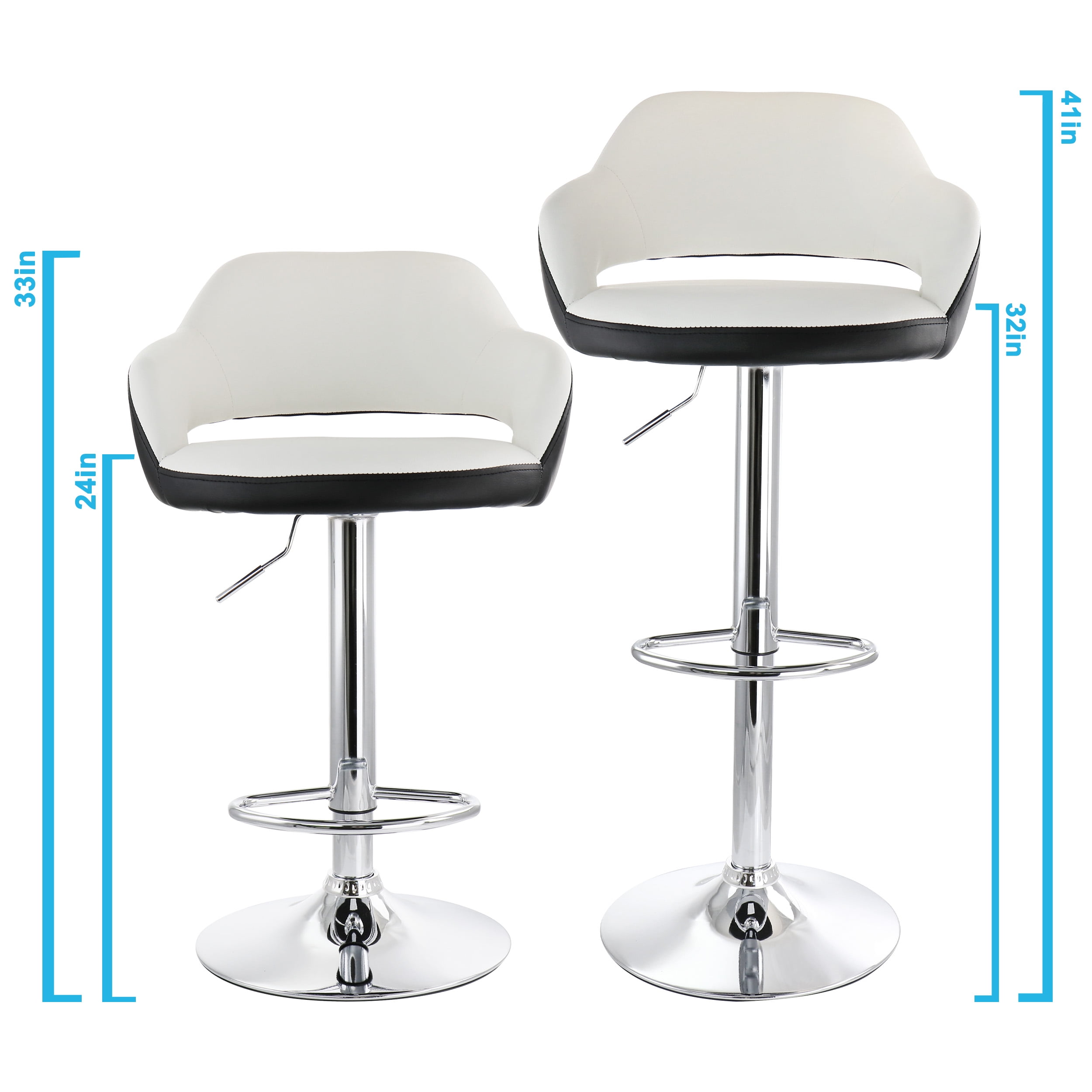 Set: 2 Pieces Material: PU Leather, Metal Color: Black/White, Chrome Assembly Required Includes:Two Chair Cushions, Four Stand Pieces, Two Bases, Two Base Accessories, Eight Screws, Two Allen Wrenches, One Instruction Manual Product Dimensions: 20in length, 20in width, 33in height, 16.5lb weight each (33 lbs. total) Inner Seat Dimensions: 20in length, 14.5in width, 10.5in height Adjustable Height: 24in-32in from floor to seat; 33in-41in total height