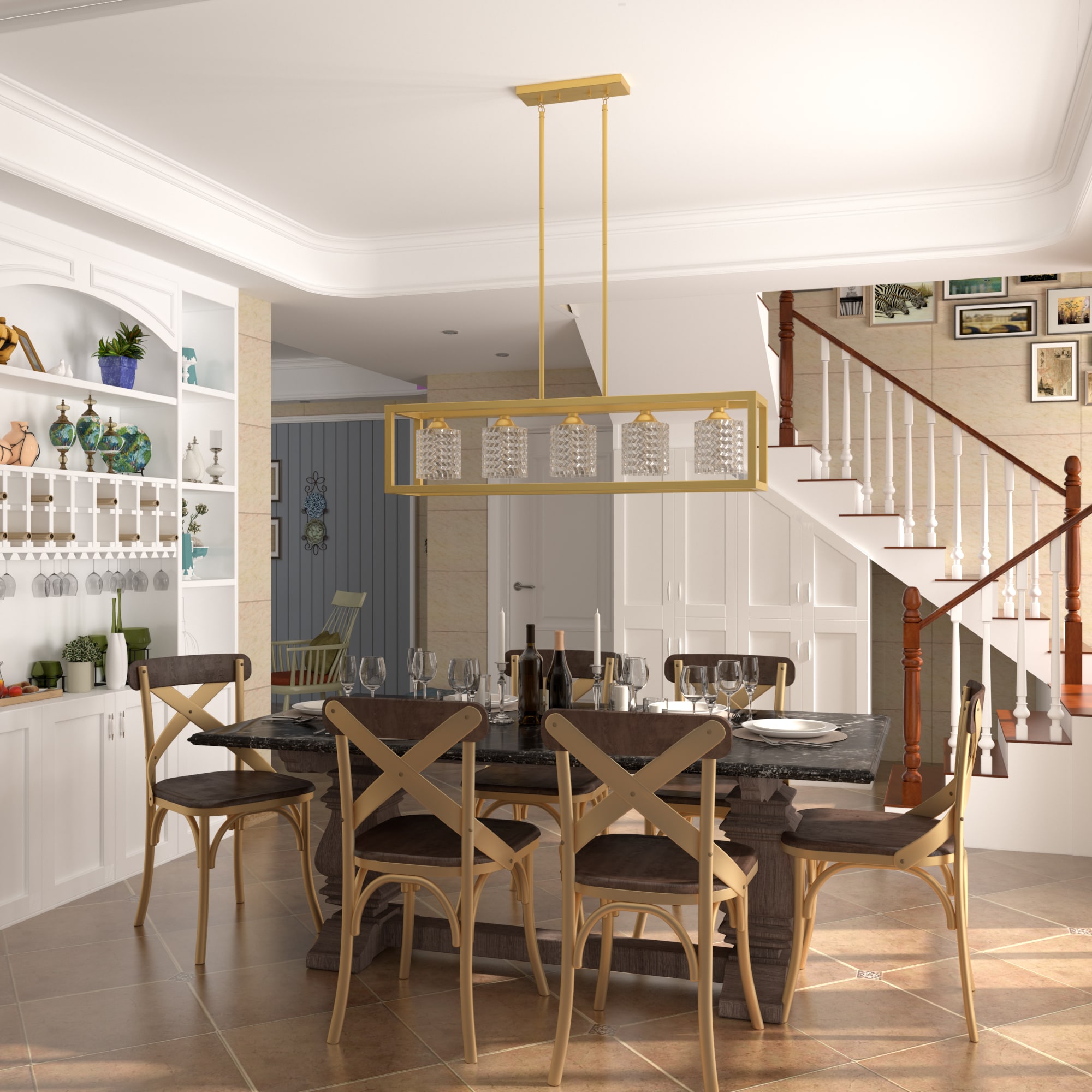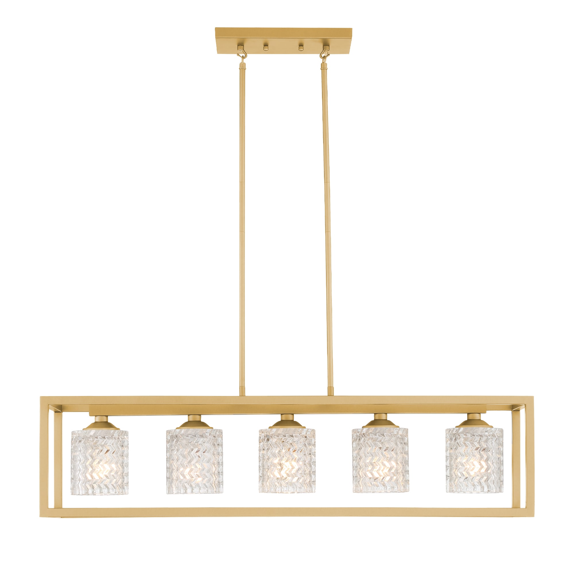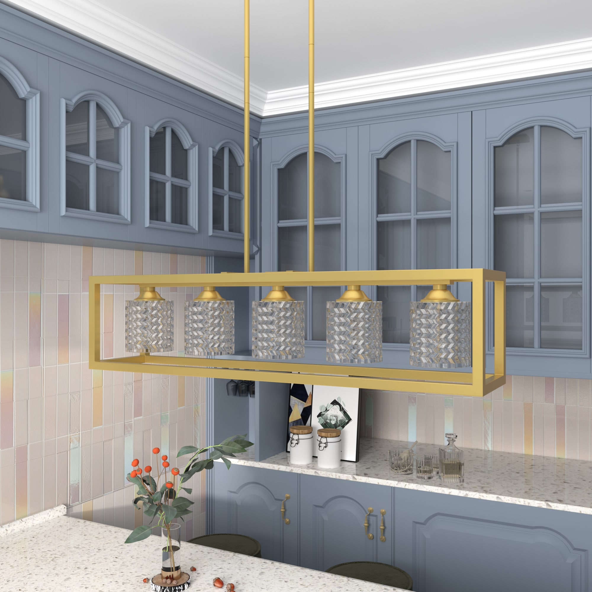 This 5-light linear pendant features a clean-lined, open silhouette that fills the space over your dining table or kitchen island with modern flair. It hangs with the help of two height-adjustable chains and a rectangular canopy that’s compatible with sloped ceilings. Plus, it works with dimmer switches to take you effortlessly from day to night. This pendant light is crafted from wrought iron and features a two-tone finish with the outer frame showing off a distressed look that creates a coastal farmhouse feel anywhere. X-shaped supports line the sides for added character, while five exposed central bulbs (sold separately) face downward.