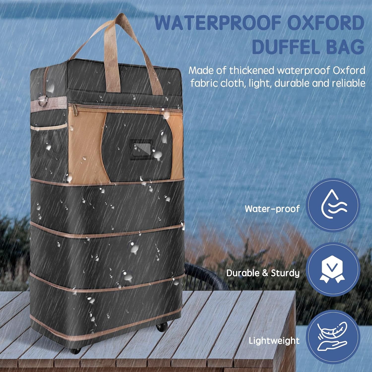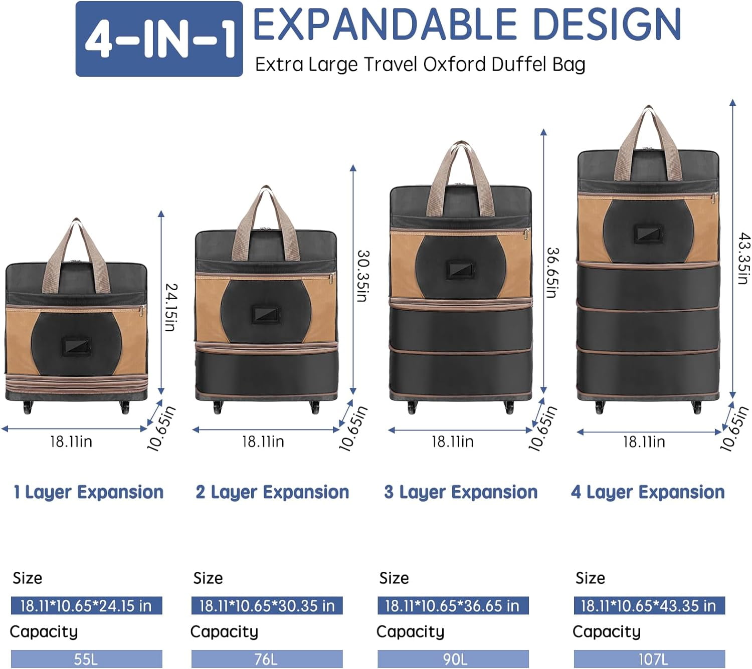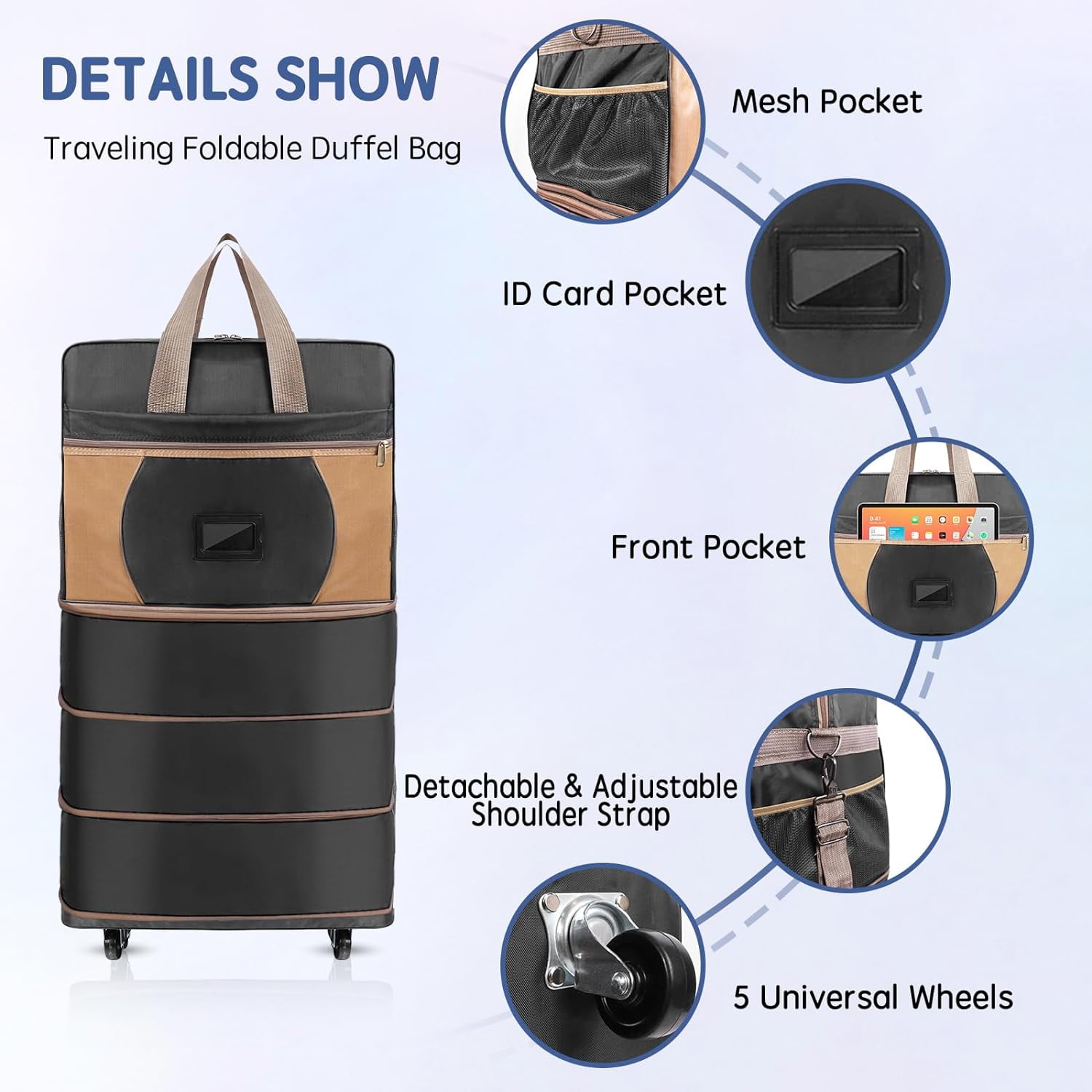 ELDA Softside Rolling Collapsible Duffle Expandable Foldable Suitcase, Black Made from high-quality nylon oxford cloth this extra-large travel luggage is scratch-proof and waterproof Weighing just 205 kg (46 lbs) it provides a lightweight solution that remains easy to carry Designed with comfort grip carry handles a drawstring handle and five universal wheels that swivel smoothly The spacious main compartment is complemented by a front zip outer pocket a PVC clear card pocket for essentials like boarding passes Ideal for family business and international travel this luggage combines practicality and style offering ample space and organized storage options