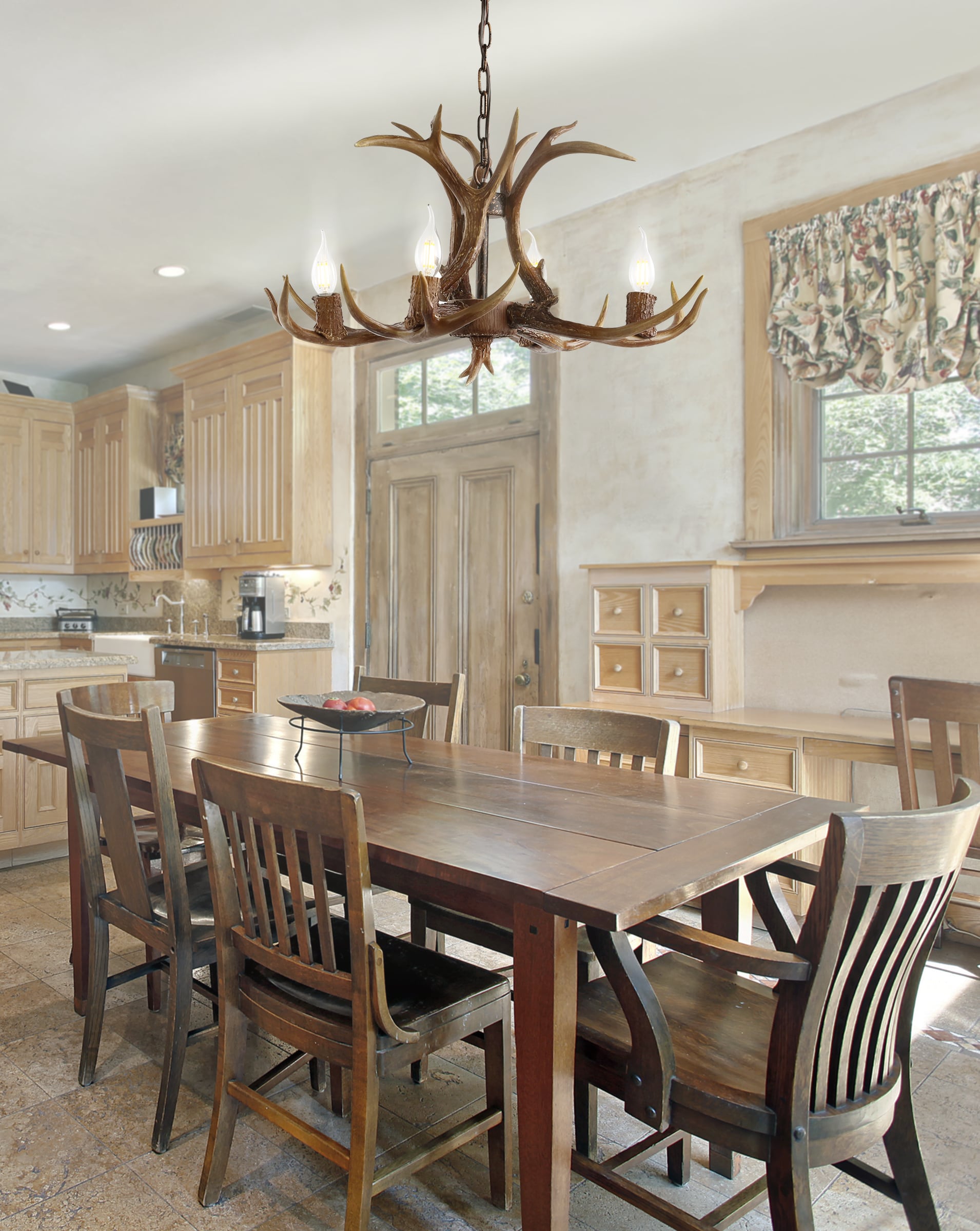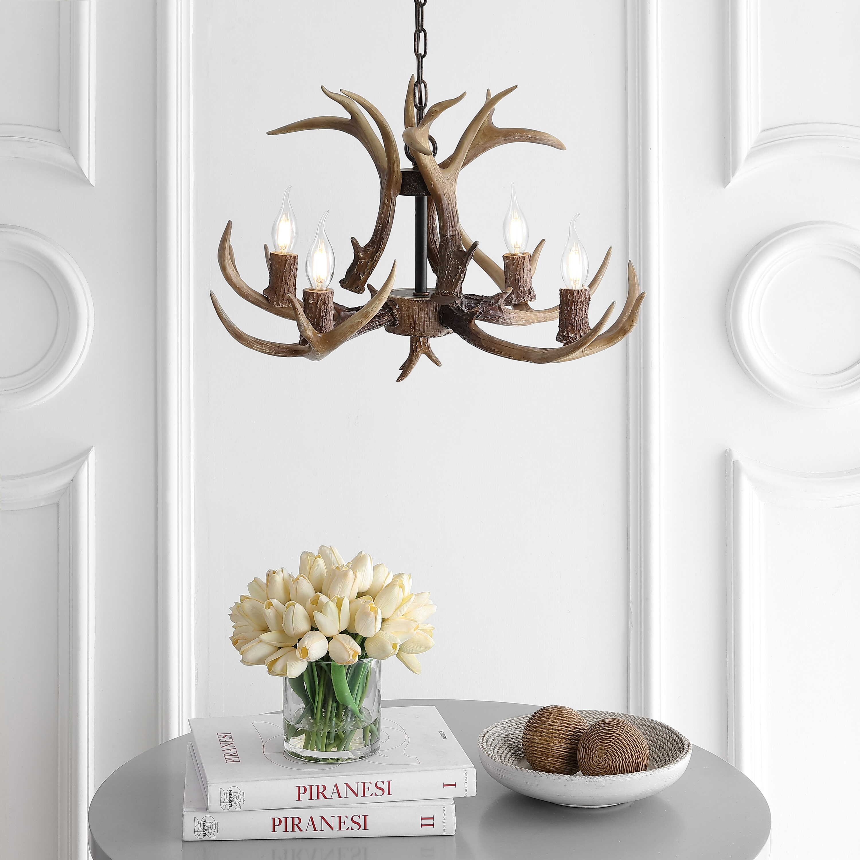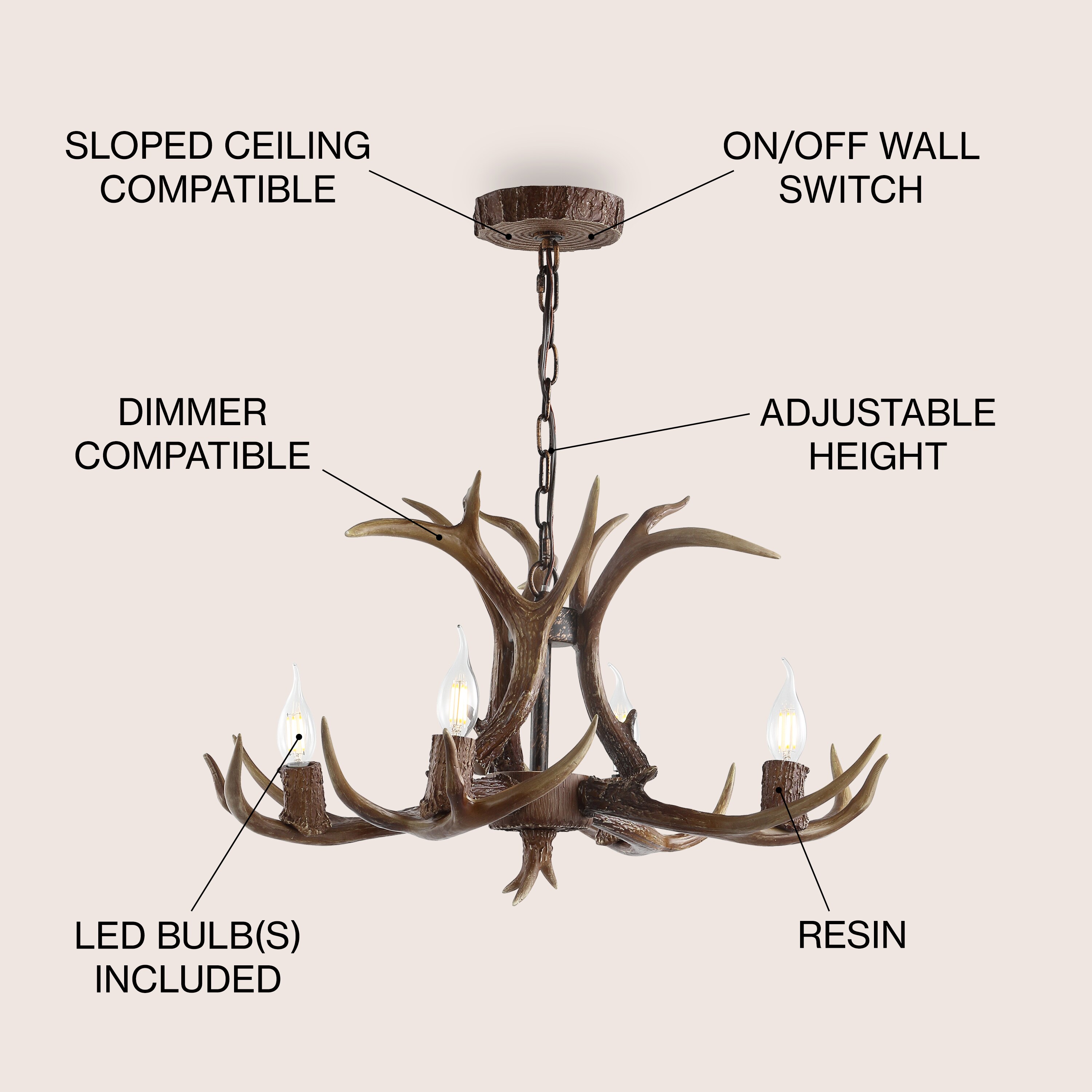 This faux antler chandelier transports us to our dream mountain home, bringing nature inside with a contemporary rustic touch. Featuring an adjustable metal pull, it can be adjusted to your ceiling height for a semi-custom look. Each unique finish brings a refreshing quality to this beautiful piece.