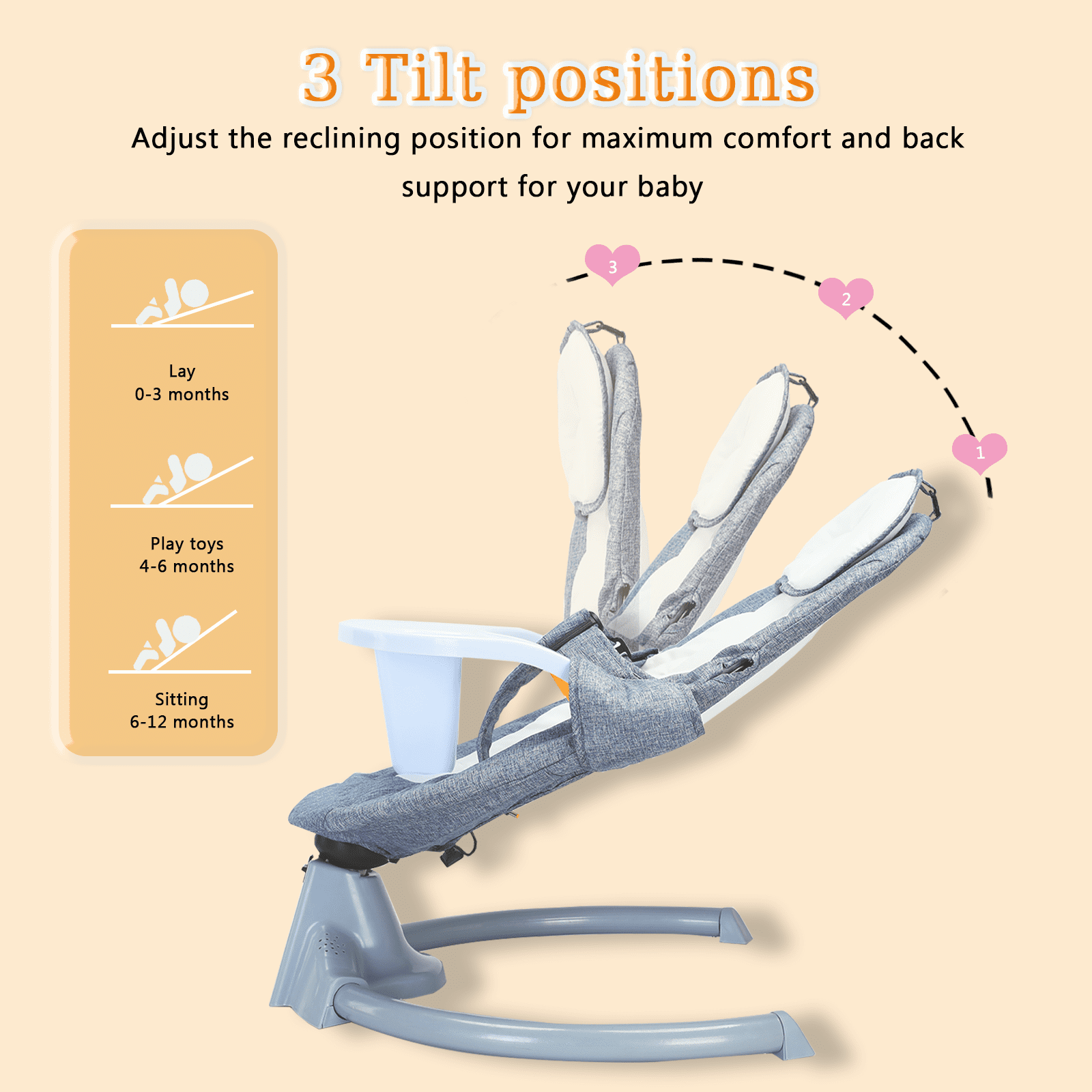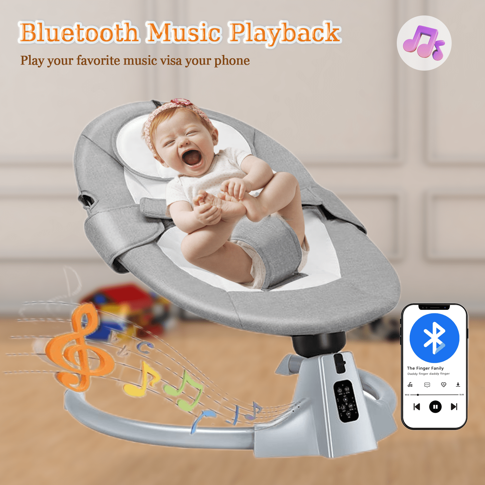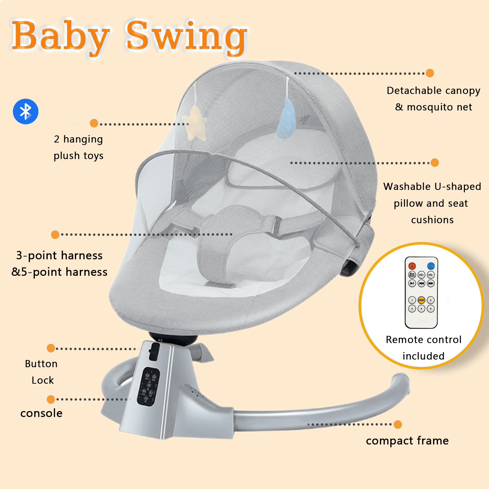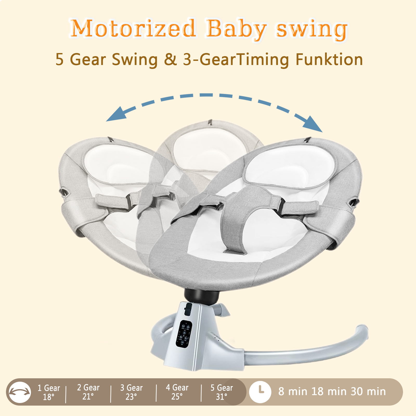 ????【Comforting Embrace】The baby swing for infants has 5 different swing speeds: 18°, 21°, 23°, 25°, 31°. Freely adjust the coaxing intensity to create a comfortable feeling for mothers to pat and coax. The baby swing is equipped with three levels of adjustment: 35°, 50°, 80°. 3 seat positions allow your baby to sit for eating, lie down for resting or recline for playing. Adjust the reclining position for maximum comfort and back support for your baby. ????【Timing Setting 】 In order to save your time and energy, electric baby swing is equipped with a timer, you can set three swing times (8.15.30 minutes), Set your baby’s soothing time in advance, easy and worry-free. ????【Safety First】 A 3-point harness and adjustable head support ensure safety and comfort. Breathable cushion is completely removable and machine washable. Suitable for infants and toddlers up to 12 months and 27 lbs.Durable aluminum base with non-slip handle for stability. ????【Bluetooth Play & Two kinds of control 】The baby swings for infants for infants comes with a Bluetooth music player, built-in 10 preset lullabies. In addition to the 10 pre-set lullabies, you can also connect your phone via Bluetooth to play your baby’s favorite unique music to distract and calm them.Two ways of touch key and remote control can help you control the baby swing. The touchscreen display is smart, intuitive and easy to use. Use the smart remote to easily master baby swing for infants, including timing and music, truly hands-free for mom. ????【Two power supply modes】You can choose to plug in or battery power, ndoor and Outdoor Use. The swing for baby can be plugged in for use indoors and battery powered when outdoors.
