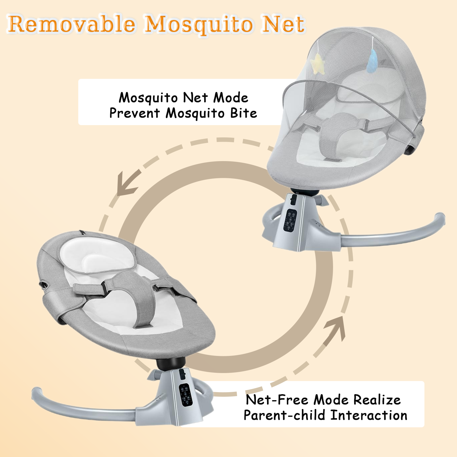 Easily coax the baby to sleep, the well-designed baby swings for infants can be connected to Bluetooth to play the baby’s favorite music, and is equipped with a remote control, allowing you to adjust the rocking speed and mode anytime, anywhere. Bionic hug design, giving the baby the most intimate care. The electric baby rocking chair has 5 swing adjustments, which adjust different shakes according to the baby’s different mood needs, bringing different experiences to the baby. Swaying gently ✿The baby swing for infants has 5 different swing ampltitudes: 18°, 21°, 23°, 25°, 31° ✿You can set 3 different gear times: 8 minutes, 15 minutes, 30 minutes. ✿The baby swing is equipped with three levels of adjustment: 35°, 50°, 80°. ✿Adjust the reclining position for maximum comfort and back support for your baby. ✿35°: Lying down ✿50°: Half-lying, suitable for soothing before going to bed ✿80°: Sitting and standing, suitable for 5-6 months old baby who has been seated Products include Mosquito net * 1 U-shaped pillow * 1 Plate * 1 Remote control * 1 Toys * 2 Power cord * 1 The friction marks on the surface of the product are caused by transportation. After getting the goods, you can wipe them with a damp cloth. If you have any questions during installation or use, please contact us by email, we will reply to you within 24 hours!