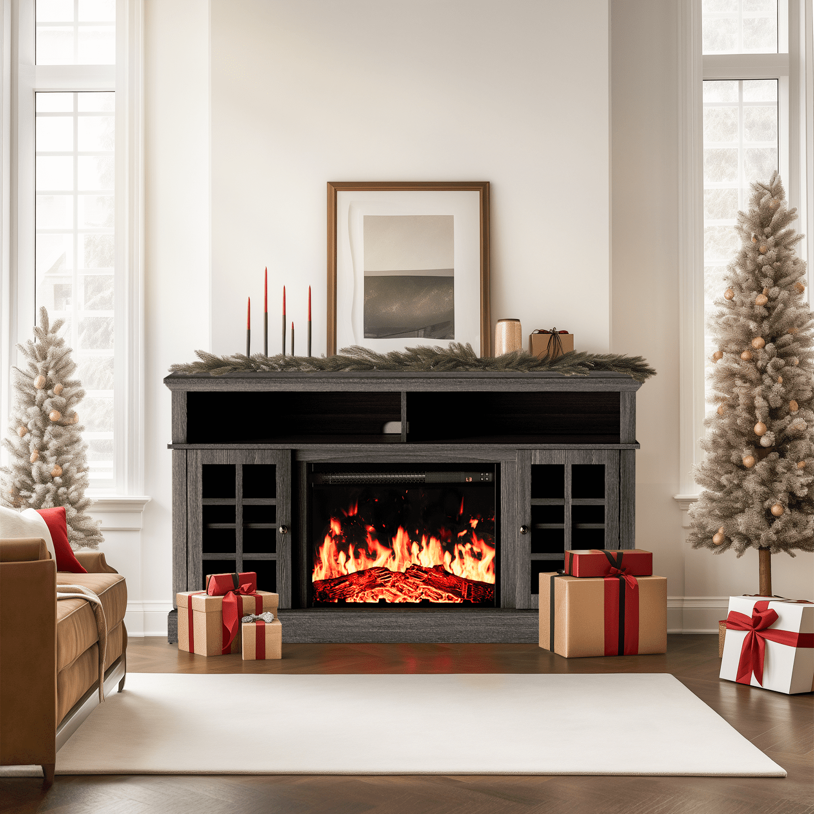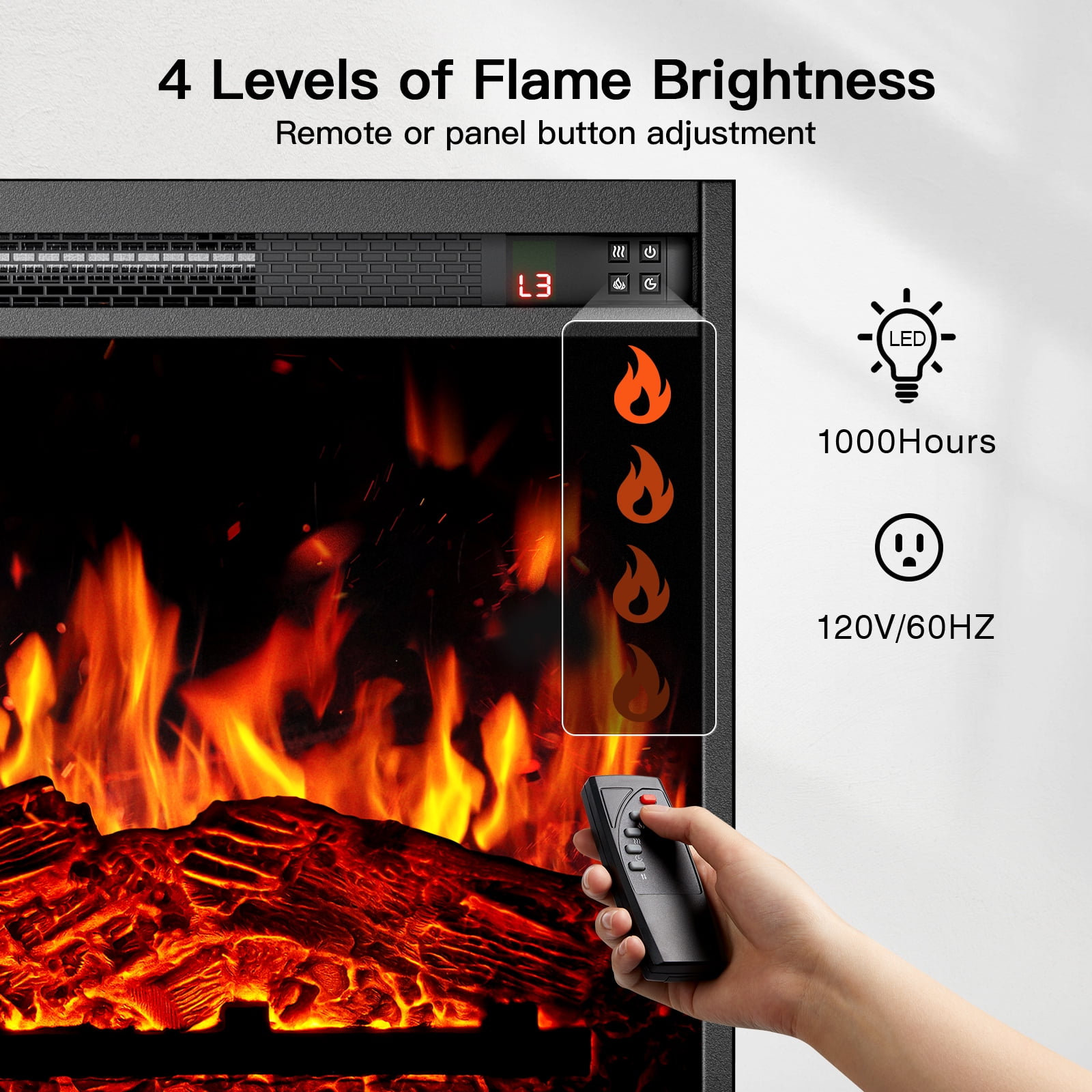 2-in-1 Design: The fireplace entertainment center is a perfect combination of console and electric fireplace. Enjoy extra-large storage space for your TV, soundbar, gaming devices, books, and more Create a Warmer Space: The farmhouse fireplace TV stand can help to create the ultimate warm and cozy space thanks to the 23″ electric fireplace with 9 temperature options, 4 levels of flame brightness, and 1400W rapid heating system that can warm air in only 5 seconds Control Panel & Remote: This electric fireplace TV stand can be operated by using the built-in control panel or included remote for convenience. The electric fireplace has a timing function to set the heating duration for a set amount of time Cable Management: The TV stand with fireplace is designed with cable holes for easy cable management. The shelves in the cabinets are adjustable to fit different sizes of items. Simply move the pegs higher or lower to configure one of three height positions Sturdy Construction: Featuring premium MDF material and fine craftmanship, this fireplace TV stand can easily support up to 75 inch TVs with a weight capacity of 200 lbs 1x Fireplace TV Stand Burner type: Quartz Installation Type: Built In Item Weight: 136.3 pounds Heating Coverage: 5 square feet Heat Output: 5100 British Thermal Units Product Dimensions: 62.4 x 22.04 x 10.23 inches When receiving the goods, please confirm the product according to the listing of instructions. Once you find less pieces, please provide relevant pictures to contact us. We will deal it in the time. Please install goods with the instruction manual.
