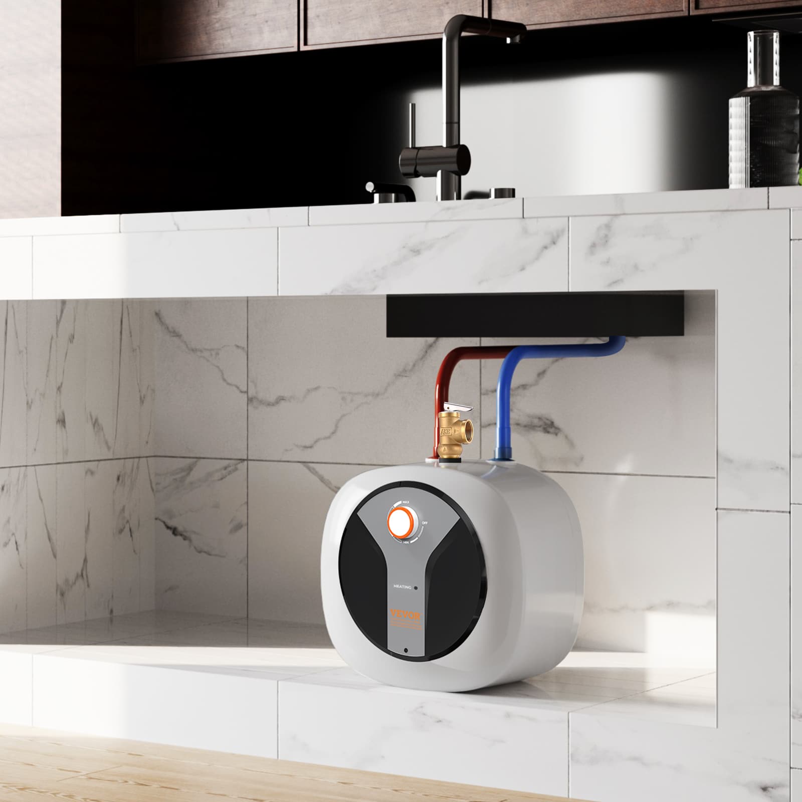 Your Handy Household Water Assistant: The tank-style kitchen gem, an instant hot water supplier for your kitchen; Durable, rust-proof, and corrosion-resistant, allowing you to enjoy a safe and convenient water experience anytime; Suitable for various settings such as household kitchens and commercial spaces;; [Package Content] Mini Water Heater x 1; Safety Valve x 1; Bracket x 1; Screws x 2; Plastic Expansion Tube x 2