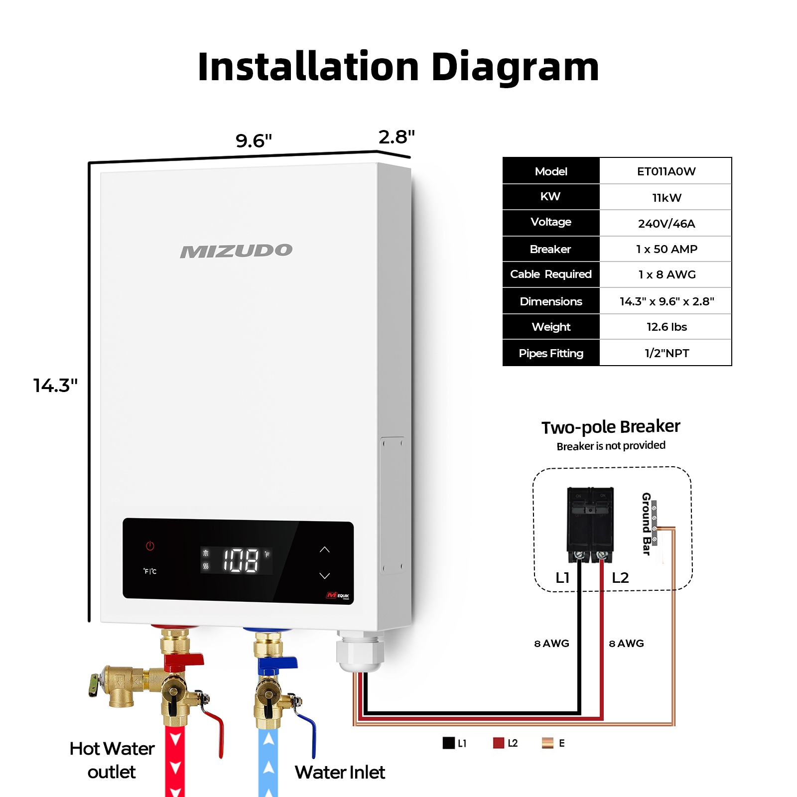 MIZUDO electric tankless water heater use heating methods that provide hot water quickly without the need to wait for a tank to heat up, and for any Sink, bathroom and Faucet use. You can customize the hot water temperature to suit your needs. Equipped with a digital display, touch panel, powered by power. Package included Electric water heater x1, User Manual x1, Assembly Kit x1, Mounting Bracket x1 (circuit breaker not included).
