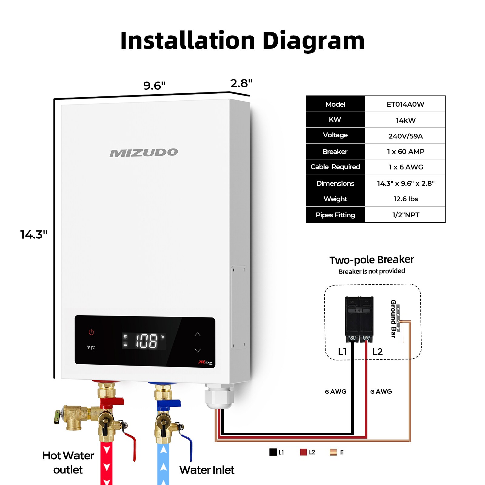 MIZUDO electric tankless water heater use heating methods that provide hot water quickly without the need to wait for a tank to heat up, and for any Sink, bathroom and Faucet use. You can customize the hot water temperature to suit your needs. Equipped with a digital display, touch panel, powered by power. Package included Electric water heater x1, User Manual x1, Assembly Kit x1, Mounting Bracket x1 (circuit breaker not included).