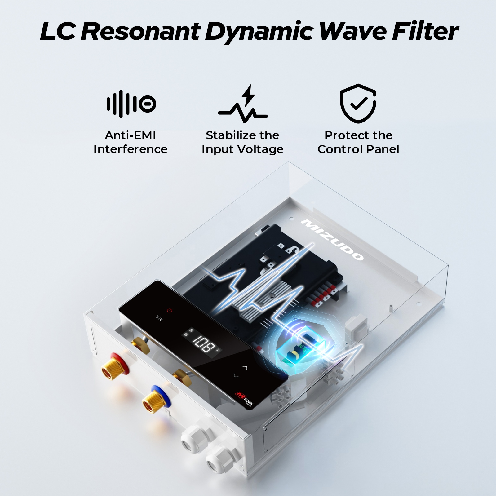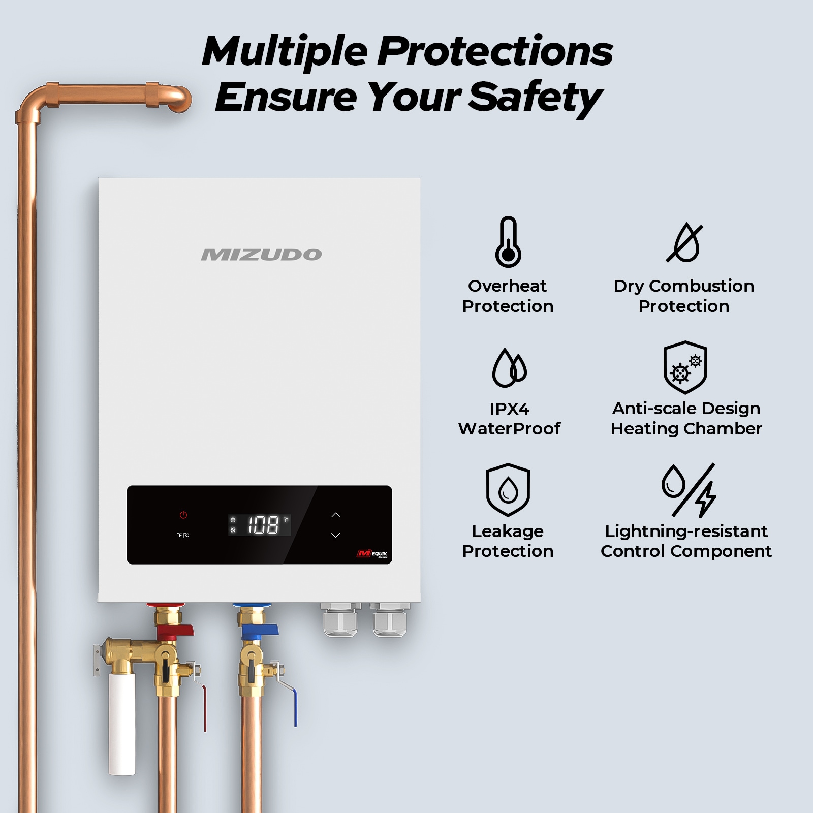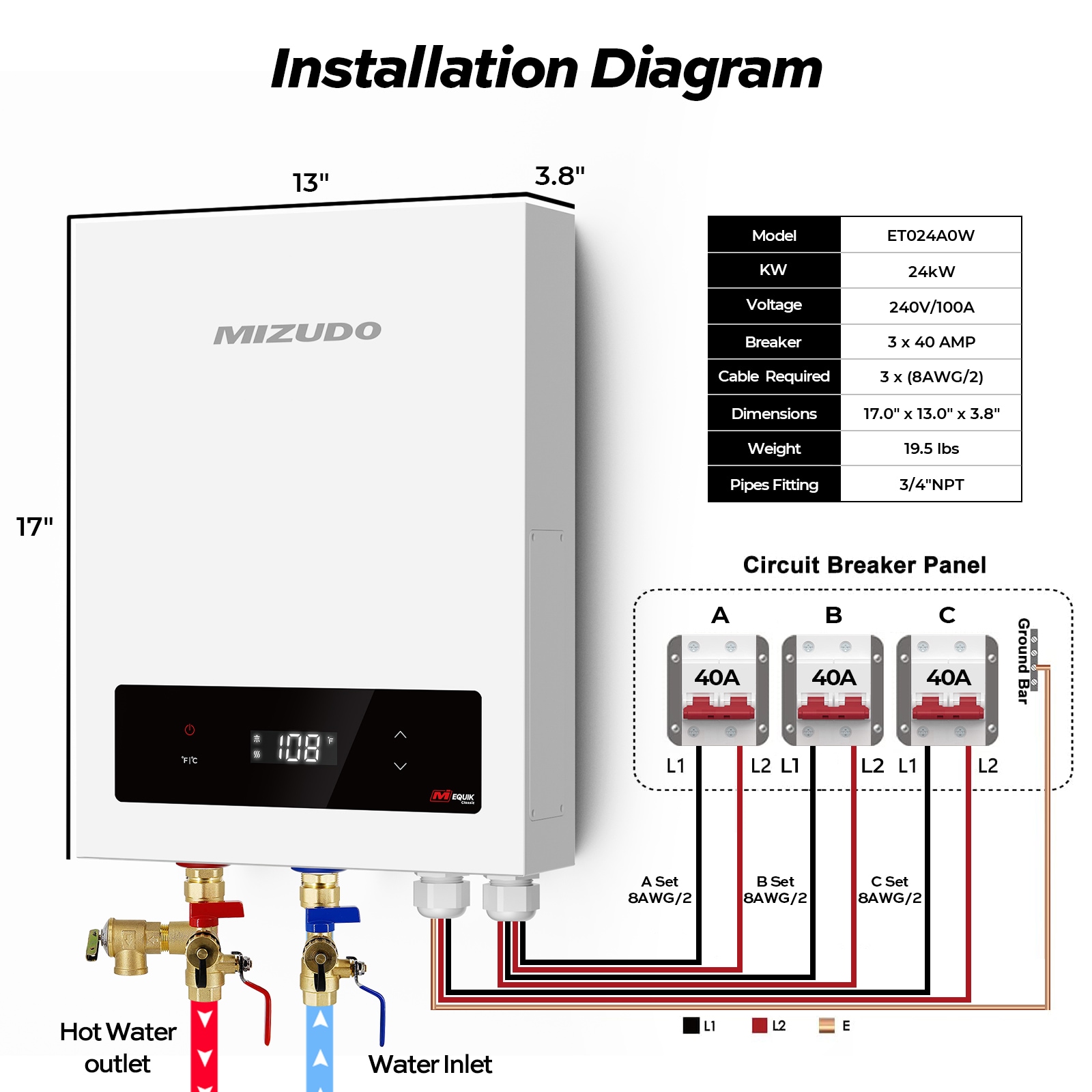 MIZUDO electric tankless water heater use heating methods that provide hot water quickly without the need to wait for a tank to heat up, and for any Sink, bathroom and Faucet use. You can customize the hot water temperature to suit your needs. Equipped with a digital display, touch panel, powered by power. Package included Electric water heater x1, User Manual x1, Assembly Kit x1, Mounting Bracket x1 (circuit breaker not included).