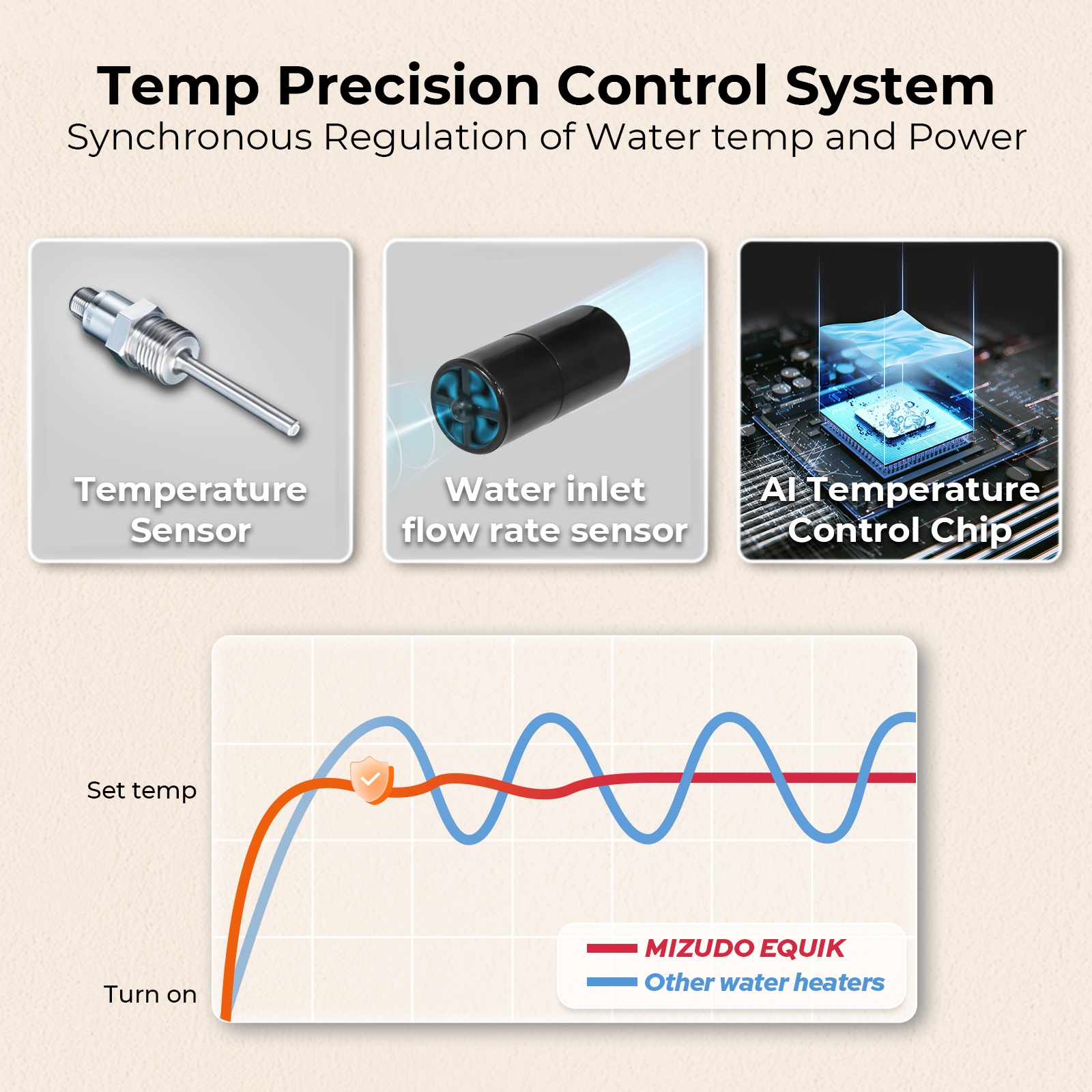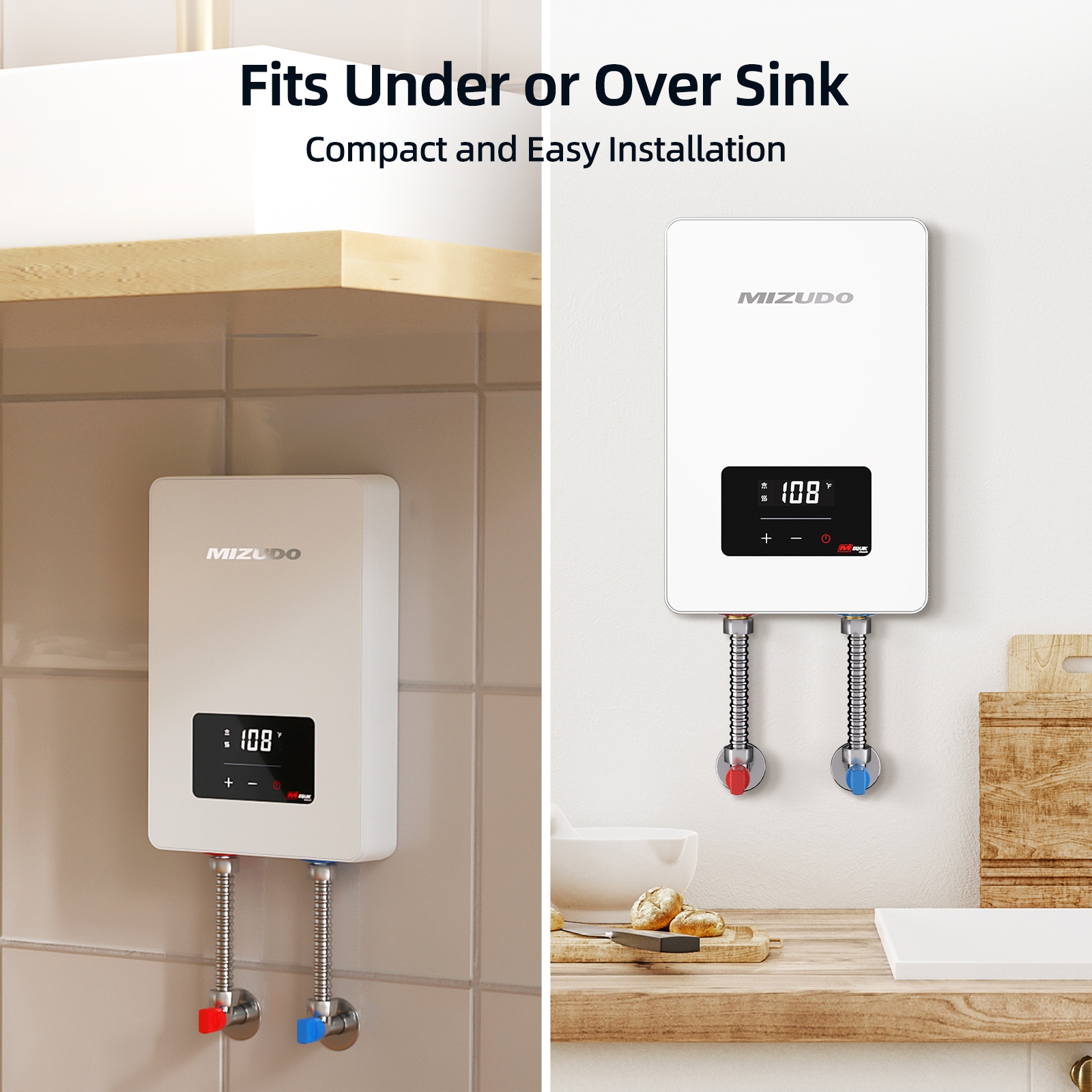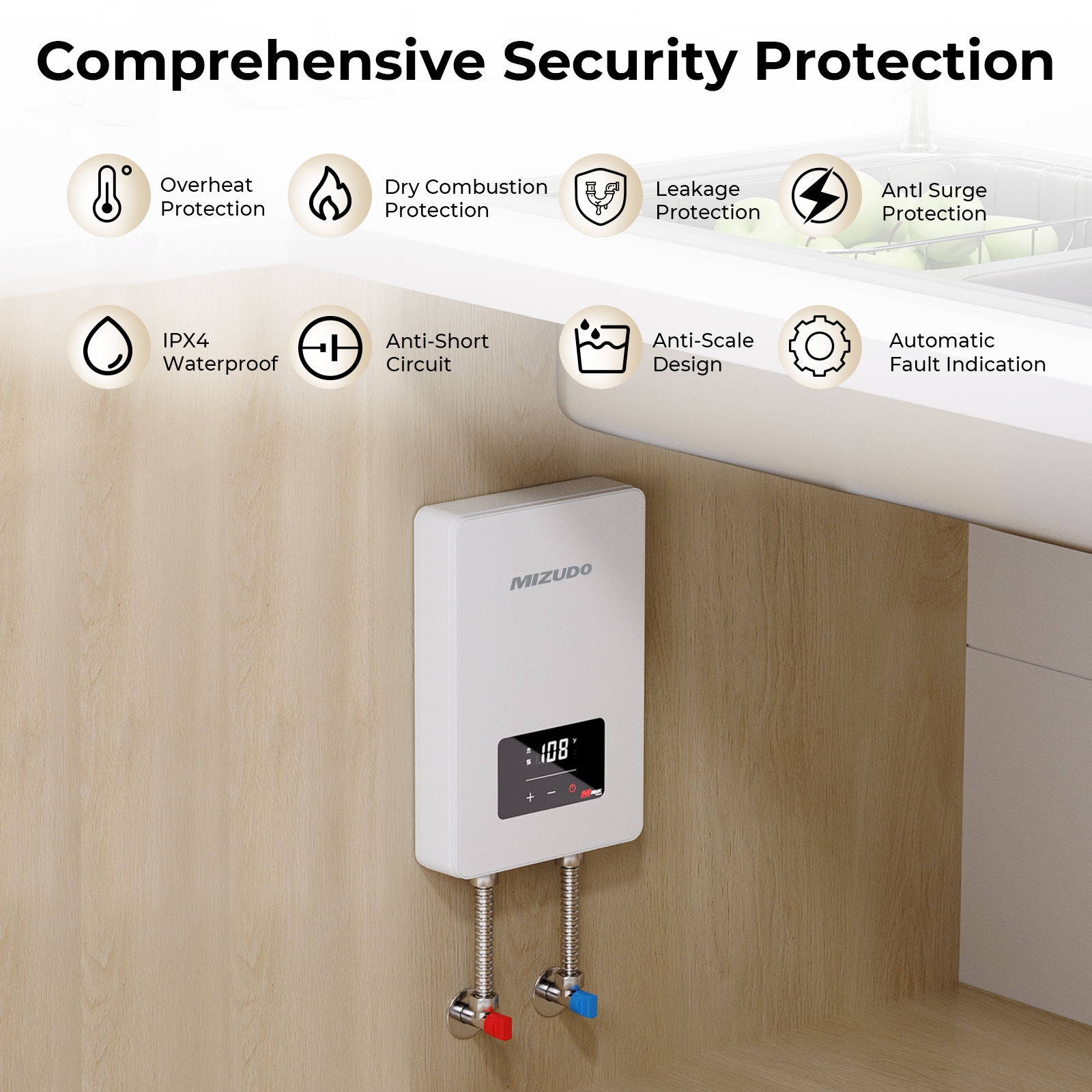 MIZUDO 3500-Watts POU electric tankless water heater is equipped with digital display touch panel, powered by electric. It works for single point-of-use application, such as sinks or faucet use. It has ulti-protection such as overheat protection, leak detection, IPX4 Waterproof, anti-short circuit, anti-scale and dry combustion protection. Compact design, allowing for installing at tight space like cabinet or undersink.