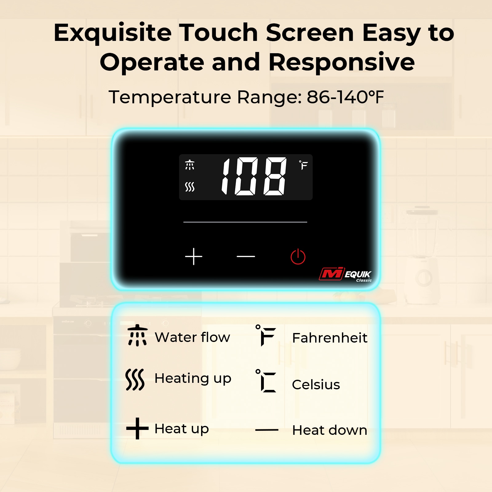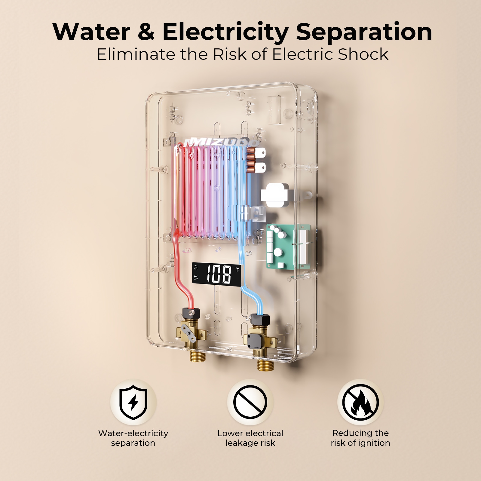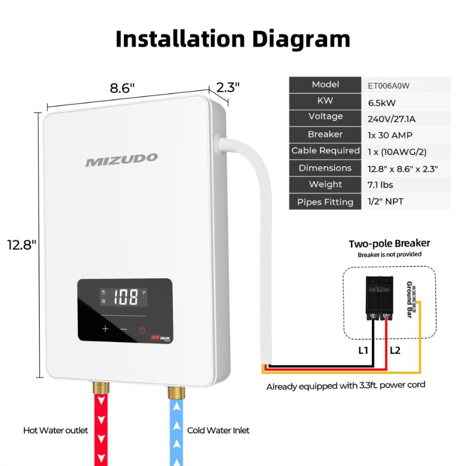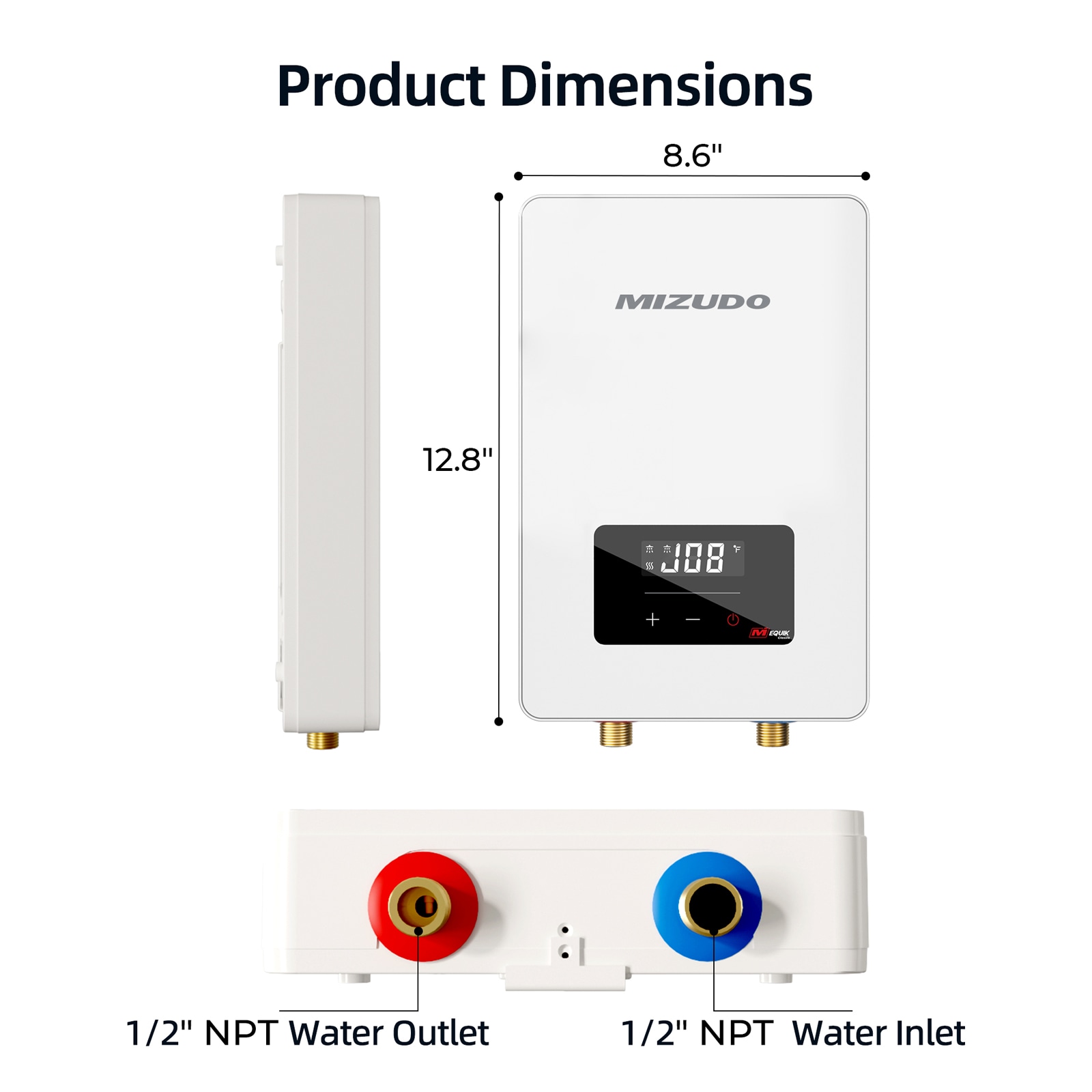MIZUDO electric tankless water heater is equipped with a digital display, touch panel, powered by power. Users can customize the hot water temperature according to their needs. Package included Electric water heater x1, User Manual x1, Assembly Kit x1, Mounting Bracket x1 (circuit breaker not included). Hardwire to a dedicated circuit breaker.