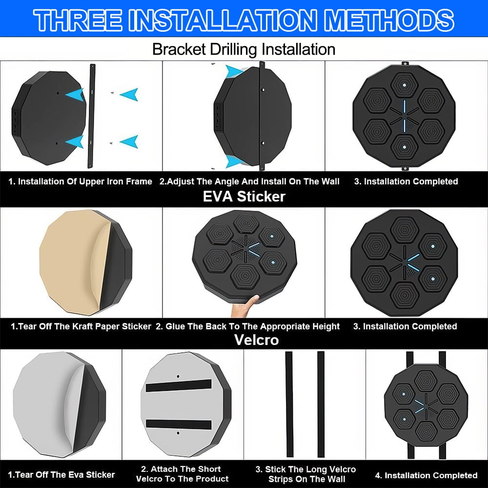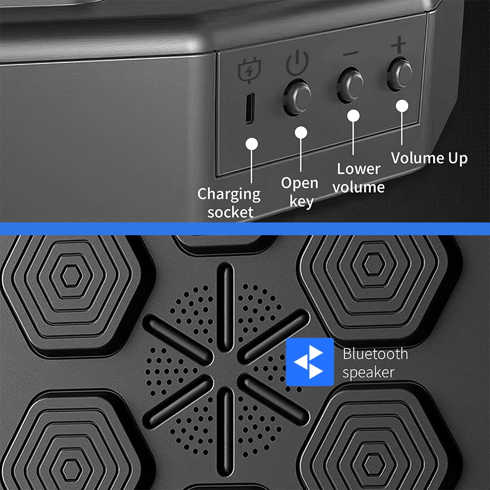 Features: 1.Music boxing machine: The boxing contact is flexible and compact. Polyurethane leather and foam materials provide an elegant surface, are easy to clean and practical, and act as a buffer to protect your hands from injury. 2.Family Boxing Training Game: The punching games and music make it a fun and engaging way to relieve stress, boost your mood, muscle strength, and overall fitness. It’s a must-have boxing workout equipment for anyone looking to stay in shape. 3.Bluetooth Connection: The boxing machine is equipped with built-in speakers, allowing you to easily connect your device via Bluetooth and play your favorite music during your boxing sessions. 4.Beat Sync Technology: Equipped with advanced beat sync technology, this music boxing machine automatically adjusts the striking rhythm to match the music, ensuring perfect synchronization between your punches and the beats for enhanced training effectiveness. 5.Easy Installation: There are three easy methods to install this music boxing machine. Drill into your wall. Velcro to your wall. Stick to your wall, providing a secure and adjustable option that even children can enjoy. Specification: Type: Music Boxing Machine Material: PU+PE Size: 40*40*7.5CM Function: Wall installation Connection: Bluetooth Charging time: 1-2H Standby time: 5 days (depending on actual use) Light source: LED (including) Installation: easy to install, three installation methods Automatic power shutdown time: 20 minutes do not use automatic shutdown Package included: 1 x boxing machine+children’s gloves Notes: 1. Boxing Target cannot be moved and cannot be cleaned directly with water. Please use a towel to clean the surface. 2. You can adjust the installation height as needed so that adults and children can use it at home for boxing training.