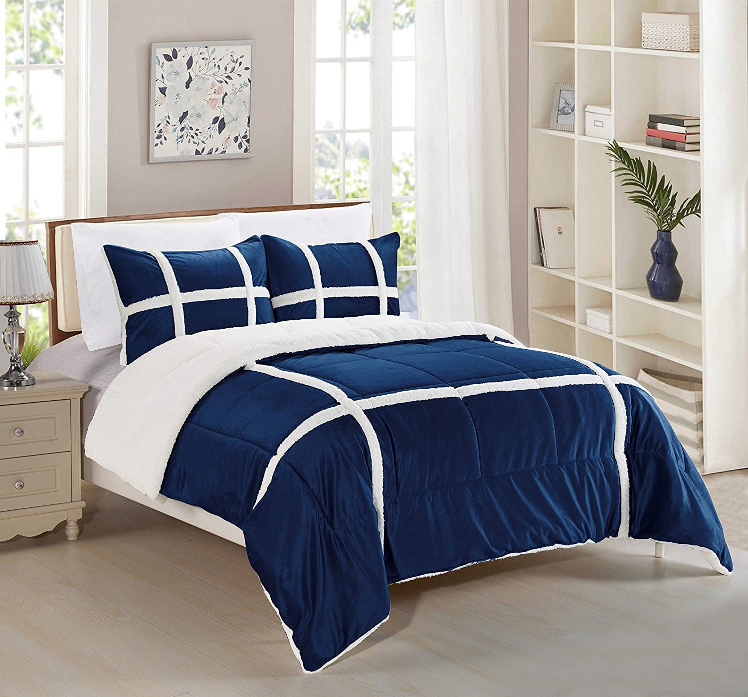 Elegant Comfort Micromink Stripe Lined Sherpa Comforter Set, Micro-Suede 3-Piece Reversible Comforter Set, Full/Queen, Navy Blue