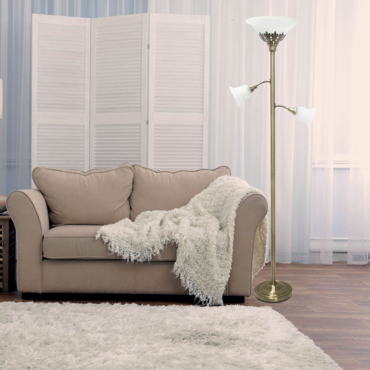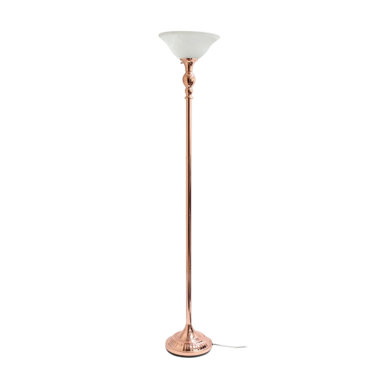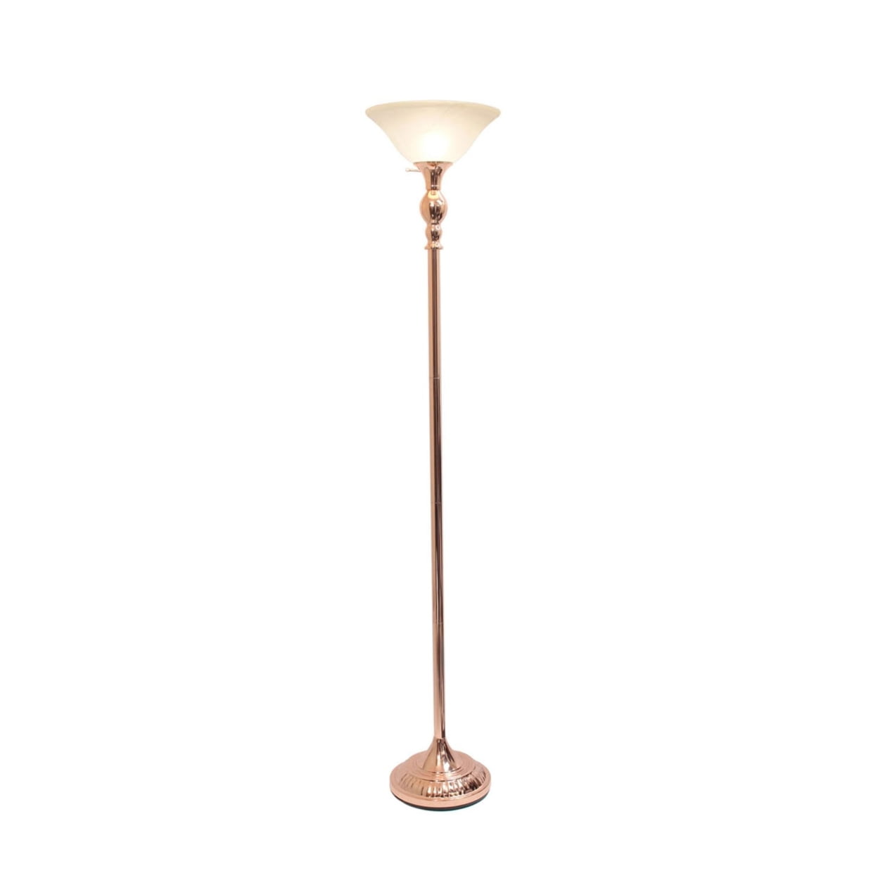 Elegant Designs 1 Light Torchiere Floor Lamp with Marbleized White Glass Shade, Rose Gold Description: Light up your bedroom, office, foyer or living room with this elegant yet affordable 1 light torchiere floor lamp. It features a stunning rose gold finish and a marbleized white glass shade to complete the look. Dimensions: 13″L x 13″W x 71″H, Uses 1 x 100 3 way Type A Medium Base Bulb (not included). Rose Gold Finish. White Glass Shade. Some Assembly Required. Rotary switch located on lamp holder. Features: Style: Traditional. Finish Color: Rose Gold/White Shade. Material: Metal. Material Breakdown: iron 80% +15% glass +5% others. Base Type: E26 Medium Base. Base Dimensions: base diameter: 11.5″ Height 66.5″, Product Dimension: 13″L x 13″W x 71″H, Product Weight: 13.67 lbs. Shade Security: Socket Nut. Number of Lights:1. Maximum Wattage: 100. Shade Material: Glass. Cord Color: Clear. Cord Length: 5′ Switch Location: Lamp holder. Height from Base to Socket/Shade: 67″, Shade Diameter: 5″, Shade Bottom Opening: 8.5 x 8.5, Shade Height/ Slant: 7. Rose Gold Finish. White Glass Shade. Some Assembly Required. Rotary switch located on lamp holder. Brand Name: Elegant Designs Model No: 1270-LF2001-RGD