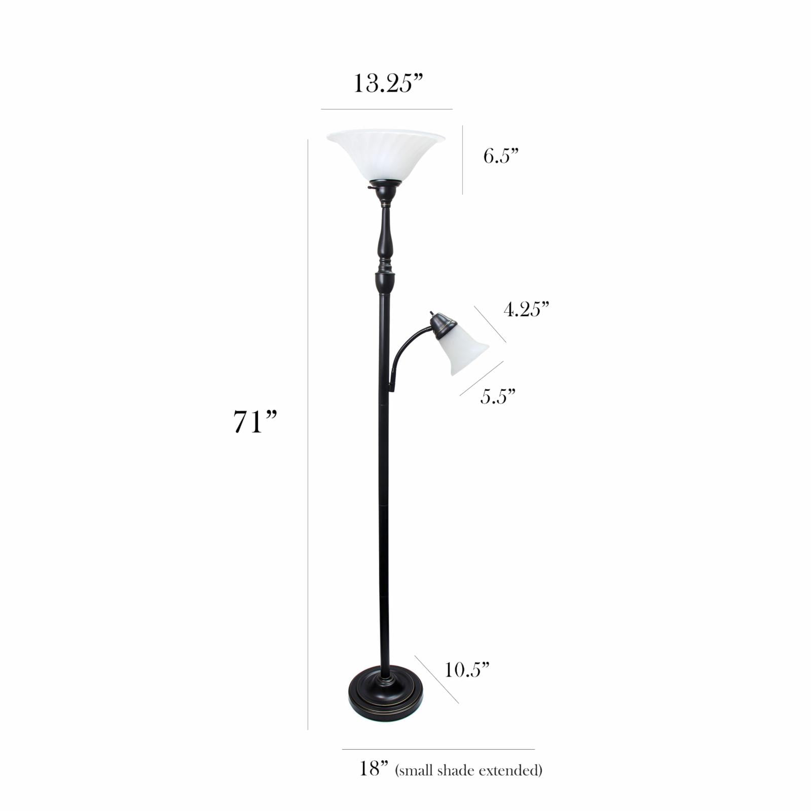 Elegant Designs 2-Light Mother Daughter Floor Lamp with White Marble Glass, Restoration Bronze: Restoration bronze finish White marble glass shades Main Light Uses: 1 x 100W Medium Base Type A bulb (not included) Reading Light Uses: 1 x 60W Type A Medium Base Bulb (not included) Some assembly required Dimensions: 13.25″L x 18.00″W x 72.00″H 1-year warranty