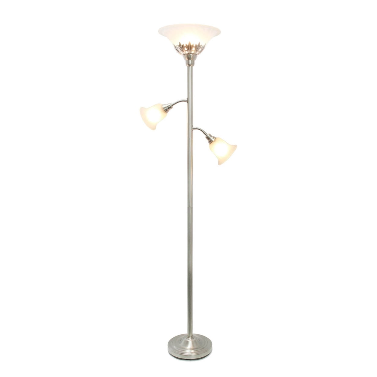 Elegant Designs 3 Light Floor Lamp with Scalloped Glass Shades, Brushed Nickel Description: Light up your bedroom, office, foyer or living room with this elegant yet affordable 3 light floor lamp. It features a stunning brushed nickel finish and marbleized white shades with spiraled cut glass to complete the timeless look. Main Light Uses: 1 x 100W Medium Base Type A bulb (not included) Reading lights use: 2 x 60W Type a medium base bulbs (not included). Reading Lights Use: 2 x 60W Type A Medium Base Bulbs (not included). Dimensions: 13″L x 21.5″W x 71″H Some Assembly Required. First Turn: Both reading lights will turn on. Second Turn: Main Light Only. Third Turn: All 3 lights on. Fourth Turn: All lights off. Switch Location: Lamp holder (controls all 3 lights, each click turns on until all are on). Height from Base to Socket/Shade: Top: 66″. Middle: 55.5″. Bottom: 49.5″ Features: Brushed Nickel Finish. White Scalloped Glass Shades. Shade Diameter: Main: 13 small shades: 5.5″, Shade Height/ Slant: 8″ Main 5″ small. Style: Traditional. Material: Metal. Finish Color: Brushed Nickel Finish. White Scalloped Glass Shades. Material Breakdown: iron 70% +25% glass +5% others. Cord Length: 6′ Base Type: E26 Medium Base. Base Dimensions: base diameter: 10.5″ Height 67″, Product Dimension: 13″L x 21.5″W x 71″H, Product Weight: 16.92 lbs. Height: 11, Bulb Type: Type A19 Incandescent. Shade Diameter: 13. Switch Type: Rotary. Shade Top Opening: 13. Bulb Included: no. Shade Security: socket nuts. Number of Lights: 3. Maximum Wattage: Main: 100W Reading Lights: 60W”, Shade Material: glass. Cord Color: Clear. Brand Name: Elegant Designs Model No: 1270-LF2002-BSN
